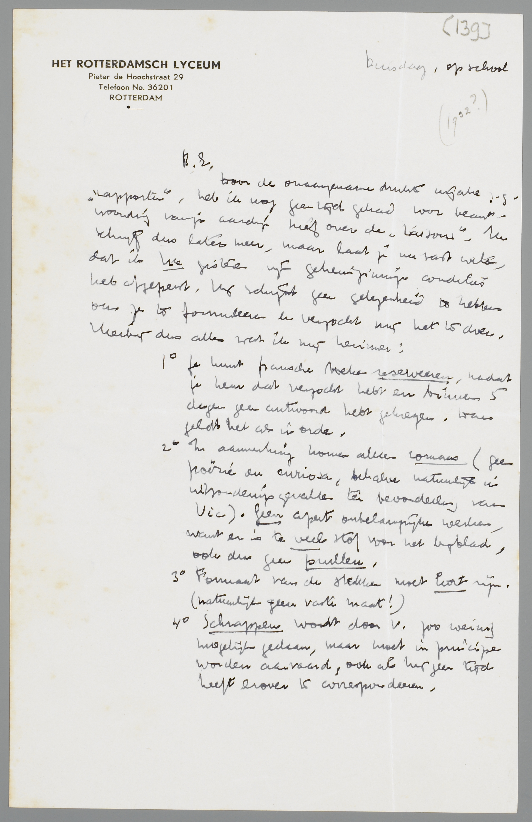 Door de onaangename drukte inzake z.g. ‘rapporten’, heb ik nog geen tijd gehad voor beantwoording van je aardige brief over de Liaisons. Ik schrijf dus later meer, maar laat je nu vast weten, dat ik Vic gisteren zijn geheimzinnige condities heb afgeperst. Hij schijnt geen gelegenheid te hebben om ze te formuleeren en verzocht mij het te doen. Hierbij dus alles wat ik mij herinner: