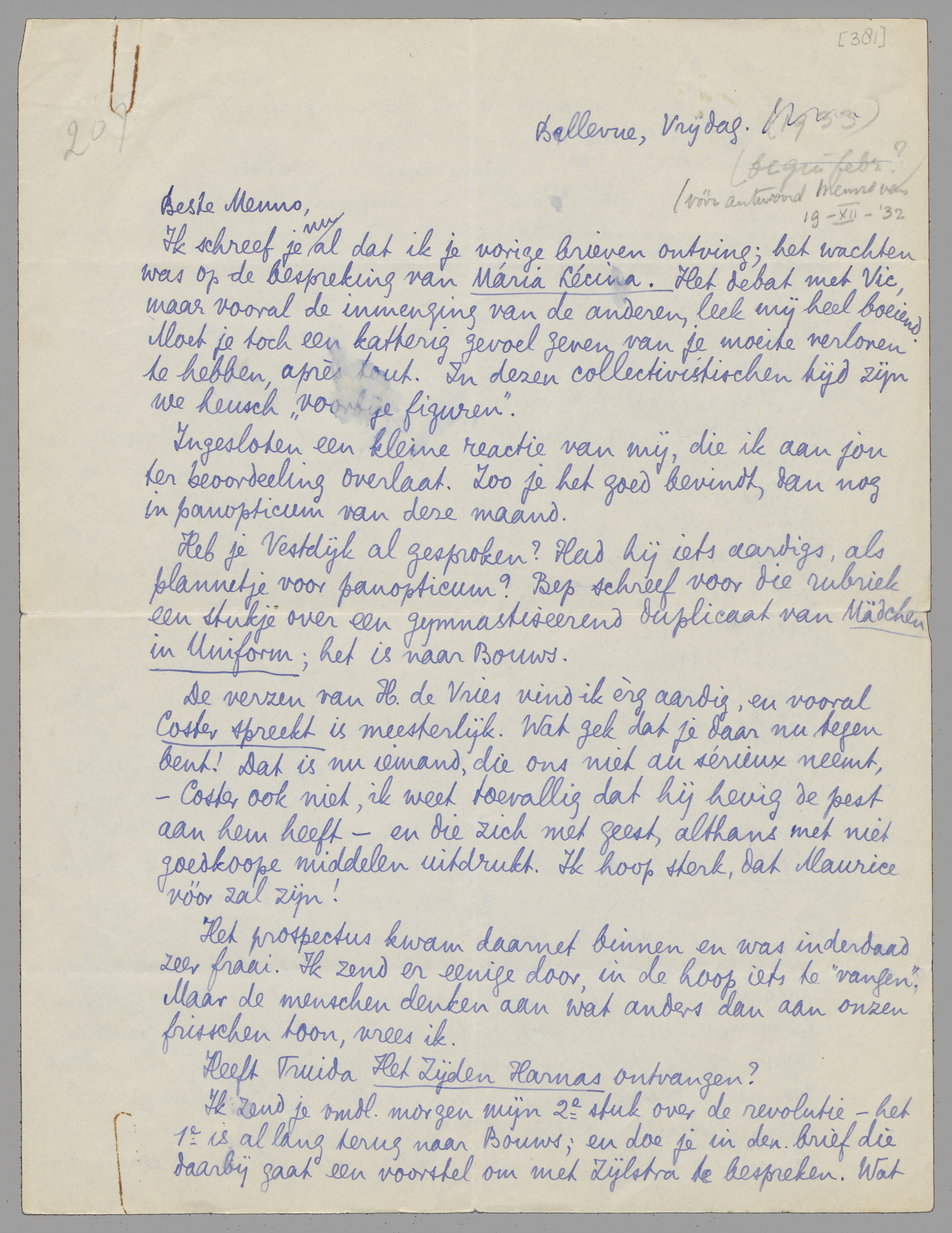 Heb je Vestdijk al gesproken? Had hij iets aardigs, als plannetje voor panopticum? Bep schreef voor die rubriek een stukje over een gymnastiseerend duplicaat van Mädchen in Uniform; het is naar Bouws.