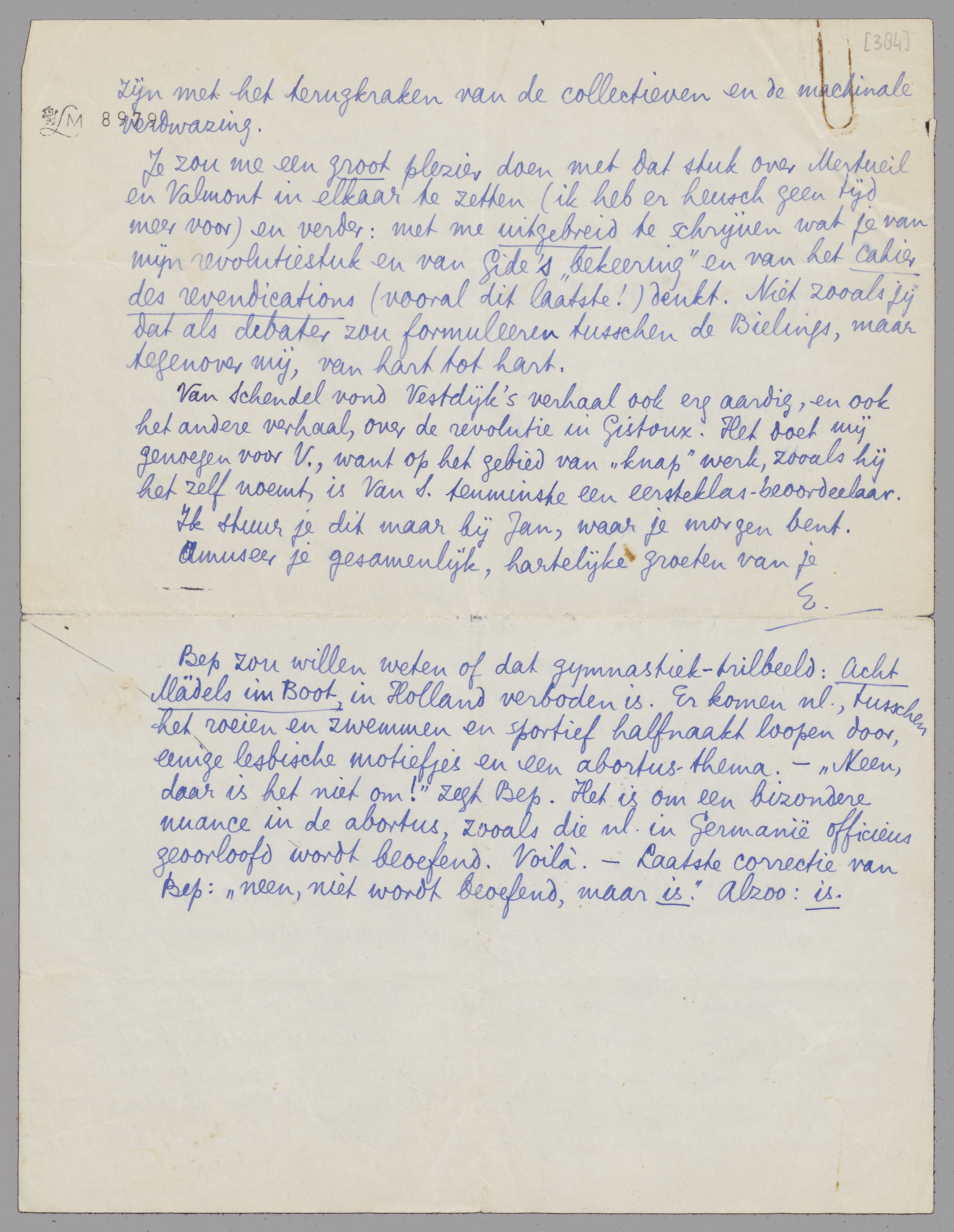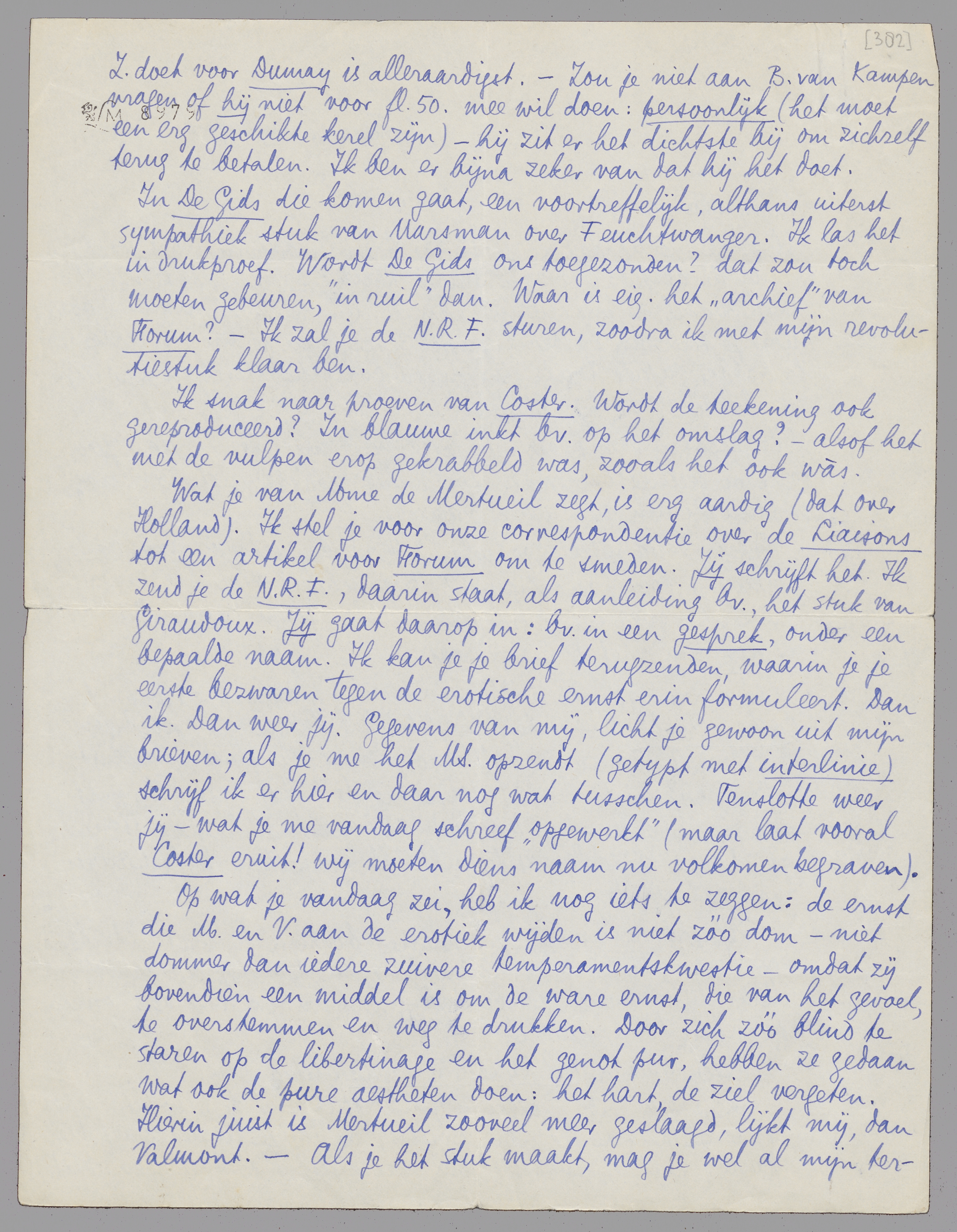 In De Gids die komen gaat, een voortreffelijk, althans uiterst sympathiek stuk van Marsman over Feuchtwanger. Ik las het in drukproef. Wordt De Gids ons toegezonden? dat zou toch moeten gebeuren, ‘in ruil’ dan. Waar is eig. het ‘archief’ van Forum? - Ik zal je de N.R.F, sturen, zoodra ik met mijn revolutiestuk klaar ben.