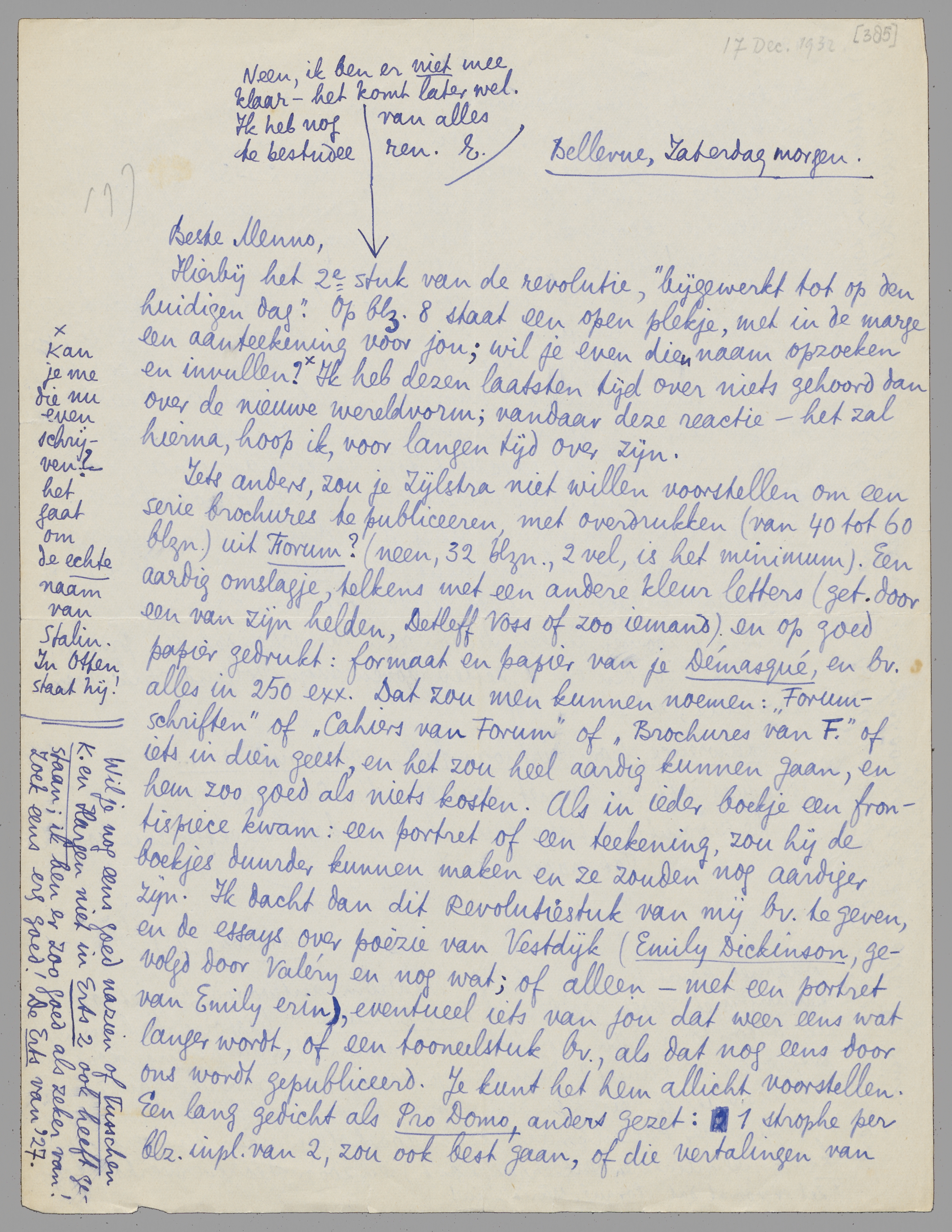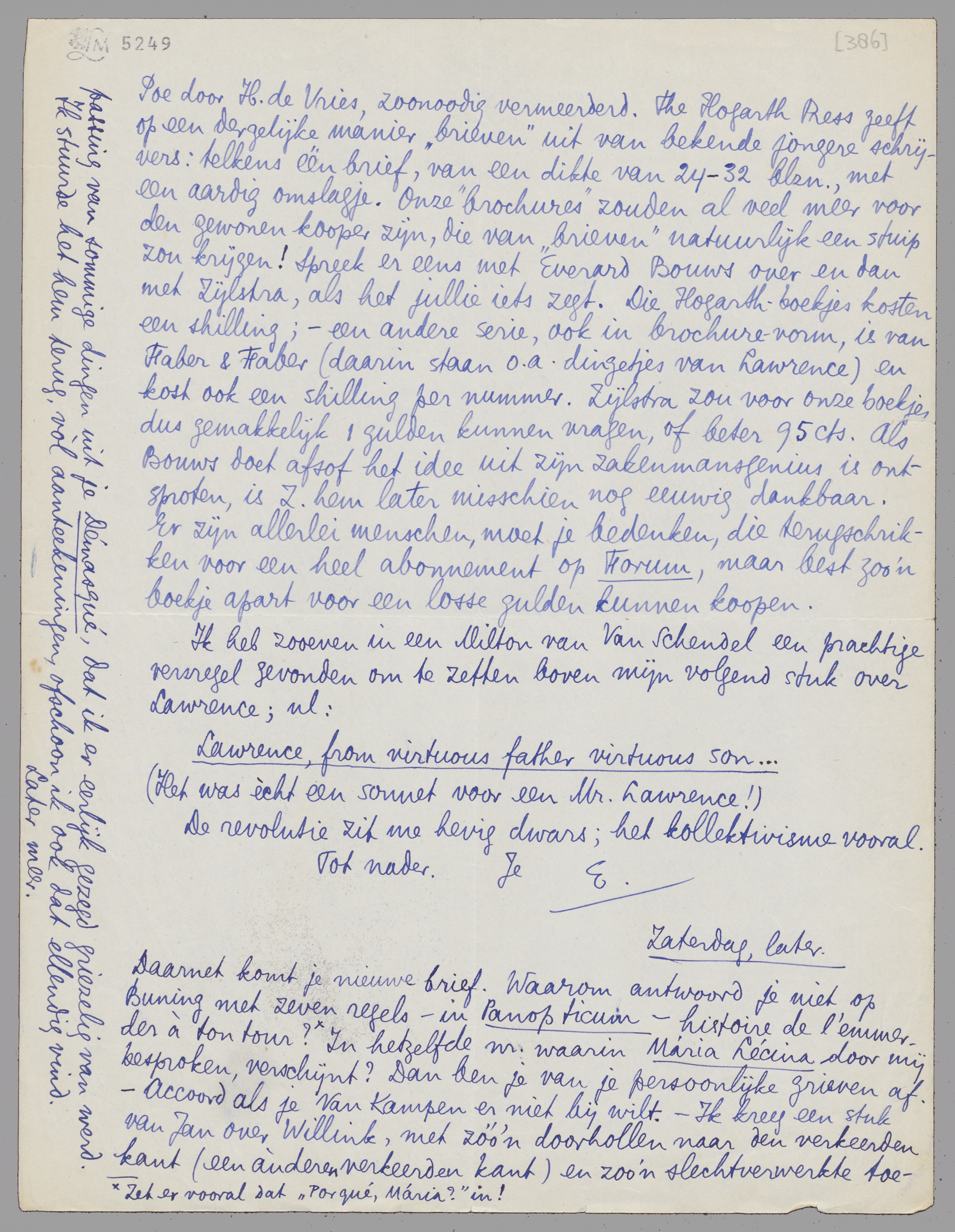 Iets anders, zou je Zijlstra niet willen voorstellen om een serie brochures te publiceeren, met overdrukken (van 40 tot 60 blzn.) uit Forum? (neen, 32 blzn., 2 vel, is het minimum). Een aardig omslagje, telkens met een andere kleur letters (get. door een van zijn helden, Detleff Voss of zoo iemand), en op goed papier gedrukt: formaat en papier van je Démasqué, en bv. alles in 250 exx. Dat zou men kunnen noemen: Forum-schriften of Cahiers van Forum of Brochures van F. of iets in dien geest, en het zou heel aardig kunnen gaan, en hem zoo goed als niets kosten. Als in ieder boekje een frontispiece kwam: een portret of een teekening, zou hij de boekjes duurder kunnen maken en ze zouden nog aardiger zijn. Ik dacht dan dit Revolutiestuk van mij bv. te geven, en de essays over poëzie van Vestdijk (Emily Dickinson, gevolgd door Valéry en nog wat; of alleen - met een portret van Emily erin), eventueel iets van jou dat weer eens wat langer wordt, of een tooneelstuk bv, als dat nog eens door ons wordt gepubliceerd. Je kunt het hem allicht voorstellen. Een lang gedicht als Pro Domo, anders gezet: 1 strophe per blz. inpl. van 2, zou ook best gaan, of die vertalingen van Poe door H. de Vries, zoonoodig vermeerderd. The Hogarth Press geeft op een dergelijke manier ‘brieven’ uit van bekende jongere schrijvers: telkens één brief, van een dikte van 24-32 blzn., met een aardig omslagje. Onze ‘brochures’ zouden al veel meer voor den gewonen kooper zijn, die van ‘brieven’ natuurlijk een stuip zou krijgen! Spreek er eens met Everard Bouws over en dan met Zijlstra, als het jullie iets zegt. Die Hogarth-boekjes kosten een shilling; - een andere serie, ook in brochure-vorm, is van Faber en Faber (daarin staan o.a. dingetjes van Lawrence) en kost ook een shilling per nummer. Zijlstra zou voor onze boekjes dus gemakkelijk een gulden kunnen vragen, of beter 95 cts. Als Bouws doet alsof het idee uit zijn zakenmansgenius is ontsproten, is Z. hem later misschien nog eeuwig dankbaar. Er zijn allerlei menschen, moet je bedenken, die terugschrikken voor een heel abonnement op Forum, maar best zoo'n boekje apart voor een losse gulden kunnen koopen.