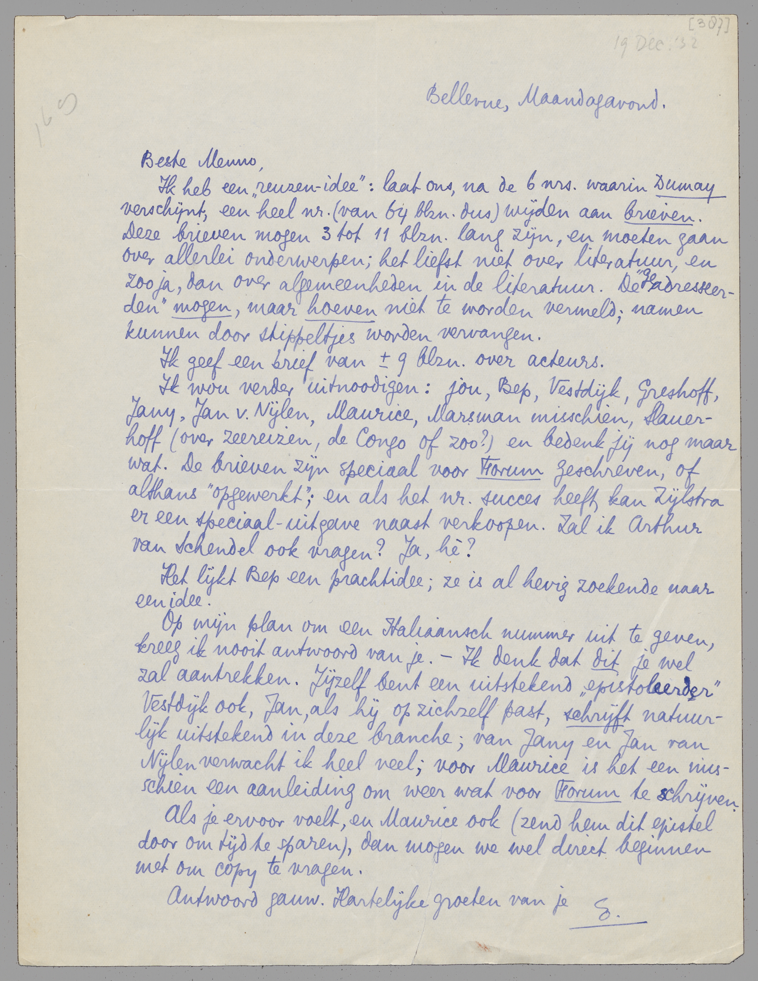 Ik wou verder uitnoodigen: jou, Bep, Vestdijk, Greshoff, Jany, Jan v. Nijlen, Maurice, Marsman misschien, Slauerhoff (over zeereizen, de Congo of zoo?) en bedenk jij nog maar wat. De brieven zijn speciaal voor Forum geschreven, of althans ‘opgewerkt’; en als het nr. succes heeft, kan Zijlstra er een speciaal-uitgave naast verkoopen. Zal ik Arthur van Schendel ook vragen? Ja, hè?