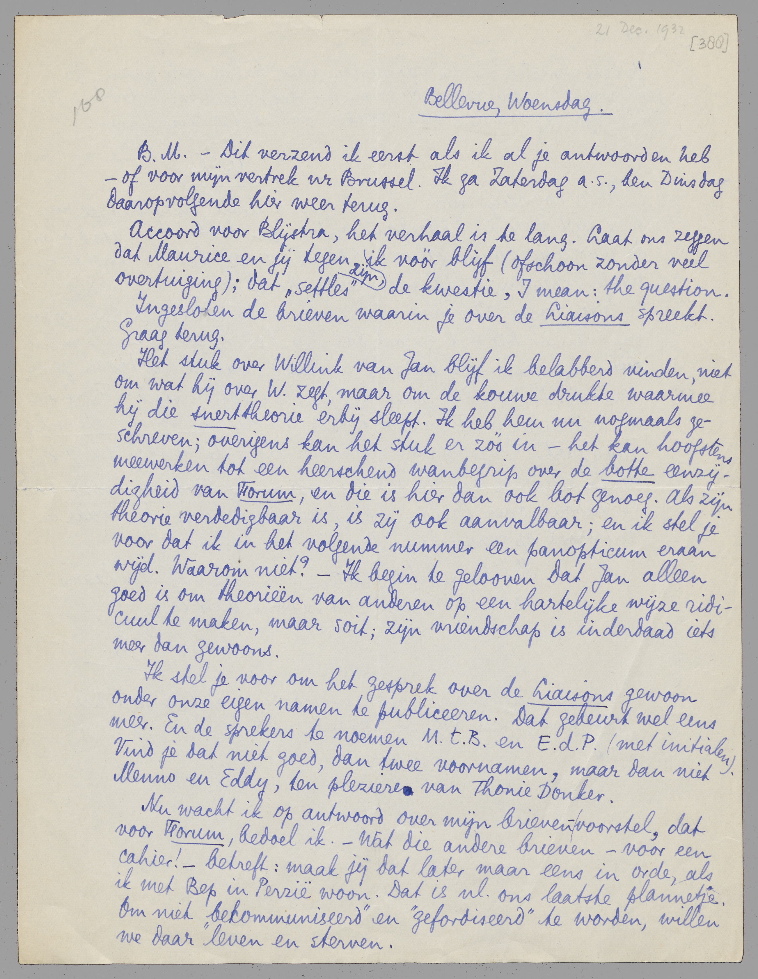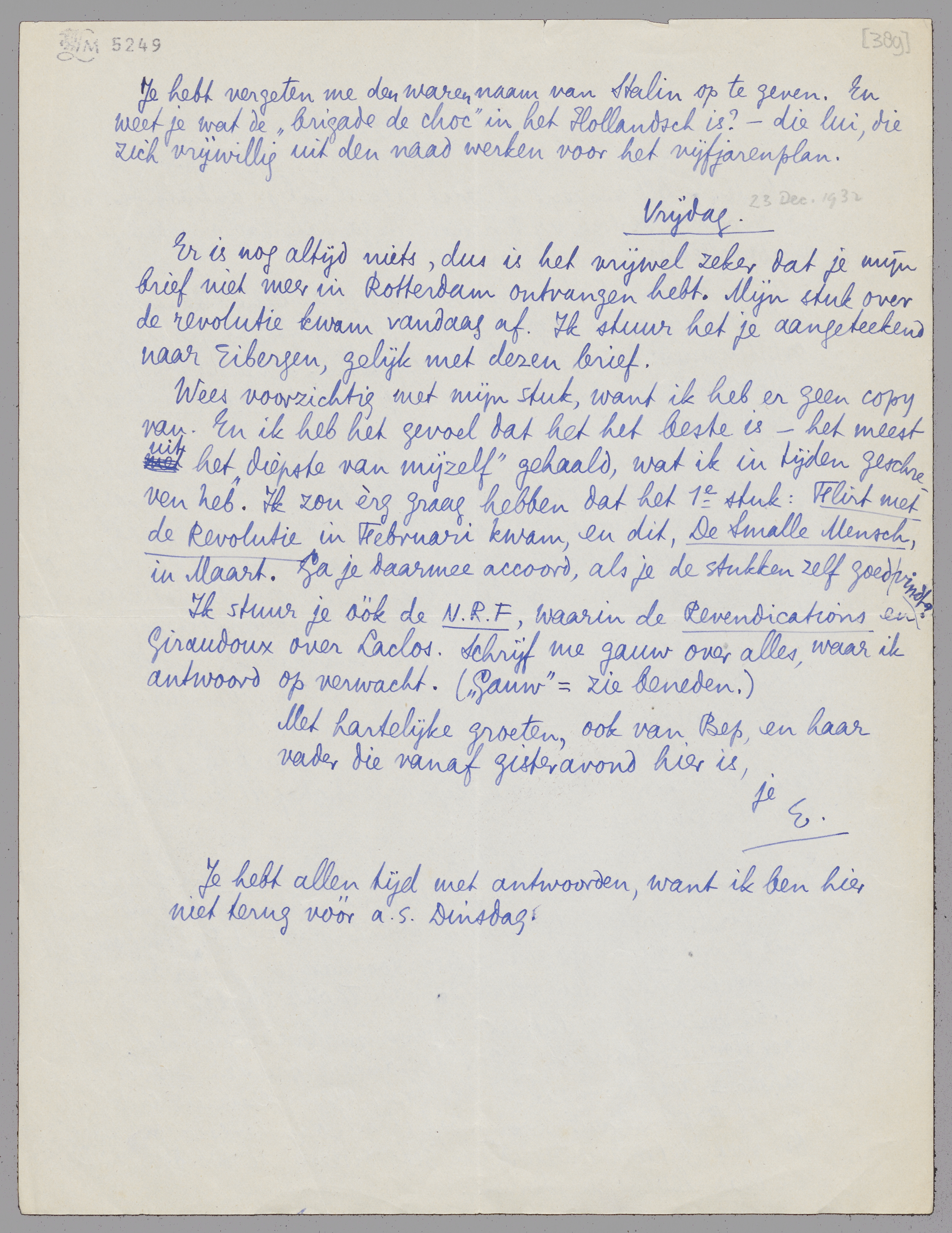 Ik stuur je óók de N.R.F., waarin de Revendications en Giraudoux over Laclos. Schrijf me gauw over alles, waar ik antwoord op verwacht. (‘Gauw’ = zie beneden.)