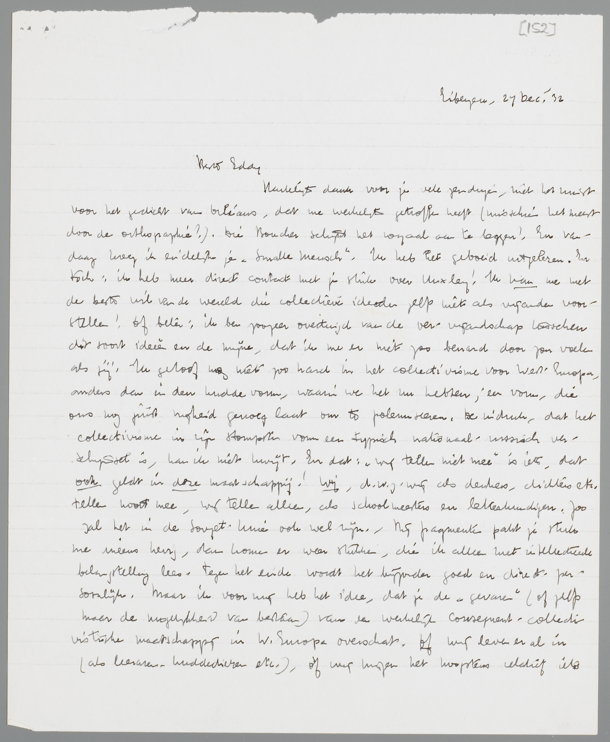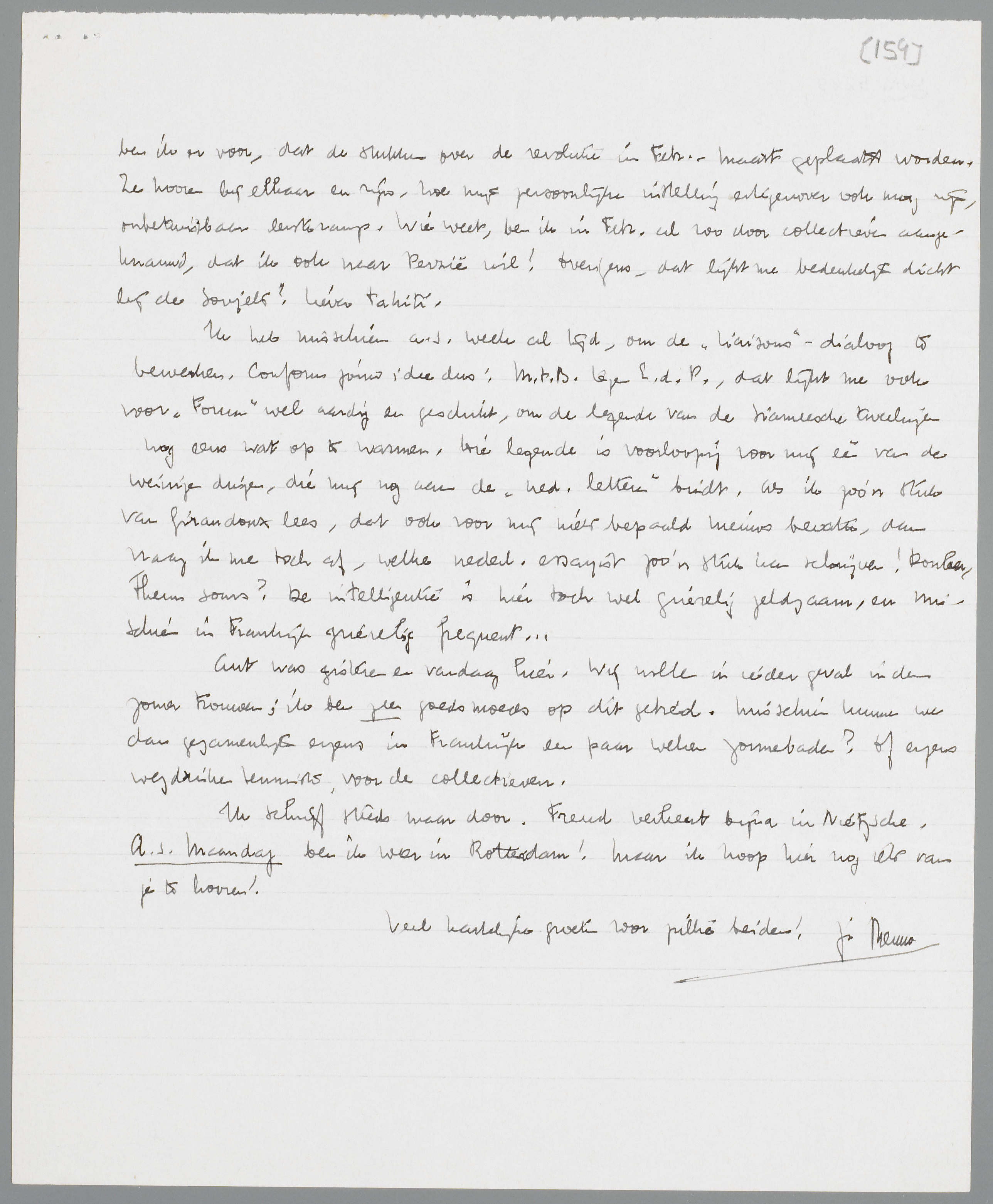 Hartelijk dank voor je vele zendingen, niet het minst voor het gedicht van Orléans, dat me werkelijk getroffen heeft (misschien het meest door de orthographie?). Die Boucher schijnt het royaal aan te leggen! En vandaag kreeg ik eindelijk je Smalle Mensch. Ik heb het geboeid uitgelezen. En toch: ik heb meer direct contact met je stuk over Huxley! Ik kan me met de beste wil van de wereld die collectieve idealen zelfs niet als vijanden voorstellen! Of beter: ik ben zoozeer overtuigd van de oer-vijandschap tusschen dit soort ideeën en de mijne, dat ik me er niet zoo benard door zou voelen als jij. Ik geloof nog niet zoo hard in het collectivisme voor West-Europa, anders dan in den kuddevorm, waarin we het nu hebben; een vorm, die ons nog juist vrijheid genoeg laat om te polemiseeren. De indruk, dat het collectivisme in zijn stompsten vorm een typisch nationaal-russisch verschijnsel is, kan ik niet kwijt. En dat: ‘wij tellen niet mee’ is iets, dat ook geldt in deze maatschappij! Wij, d.w.z. wij als denkers, dichters etc. tellen nooit mee, wij tellen alleen, als schoolmeesters en letterkundigen. Zoo zal het in de Sovjet-Unie ook wel zijn. - Bij fragmenten pakt je stuk me ineens hevig, dan komen er weer stukken, die ik alleen met intellectueele belangstelling lees. Tegen het einde wordt het bijzonder goed en direct-persoonlijk. Maar ik voor mij heb het idee, dat je de ‘gevaren’ (of zelfs maar de mogelijkheid van bestaan) van een werkelijk consequent-collectivistische maatschappij in W. Europa overschat. Of wij leven er al in (als leeraren - kuddedieren etc.) òf wij krijgen het hoogstens relatief iets beroerder. Eigenlijk voel ik wel een beetje op de simplistische manier van v. Schendel, d.w.z. ik aanvaard ‘collectieve problemen’ in geen enkel opzicht; ze zijn voor mij een contradictio in terminis. Werden wij gedwongen, er collectieve problemen op na te houden, dan zou ik geen problemen (althans geen theoretische. De maag heeft andere problemen.) hebben. En het tweegesprek met dien ‘hij’, dien je laat optreden, is dan ook voor mij geen dialoog van gelijkwaardigen, zooals die tusschen Diderot en neef Rameau. (ik las die gisteren nog eens over).