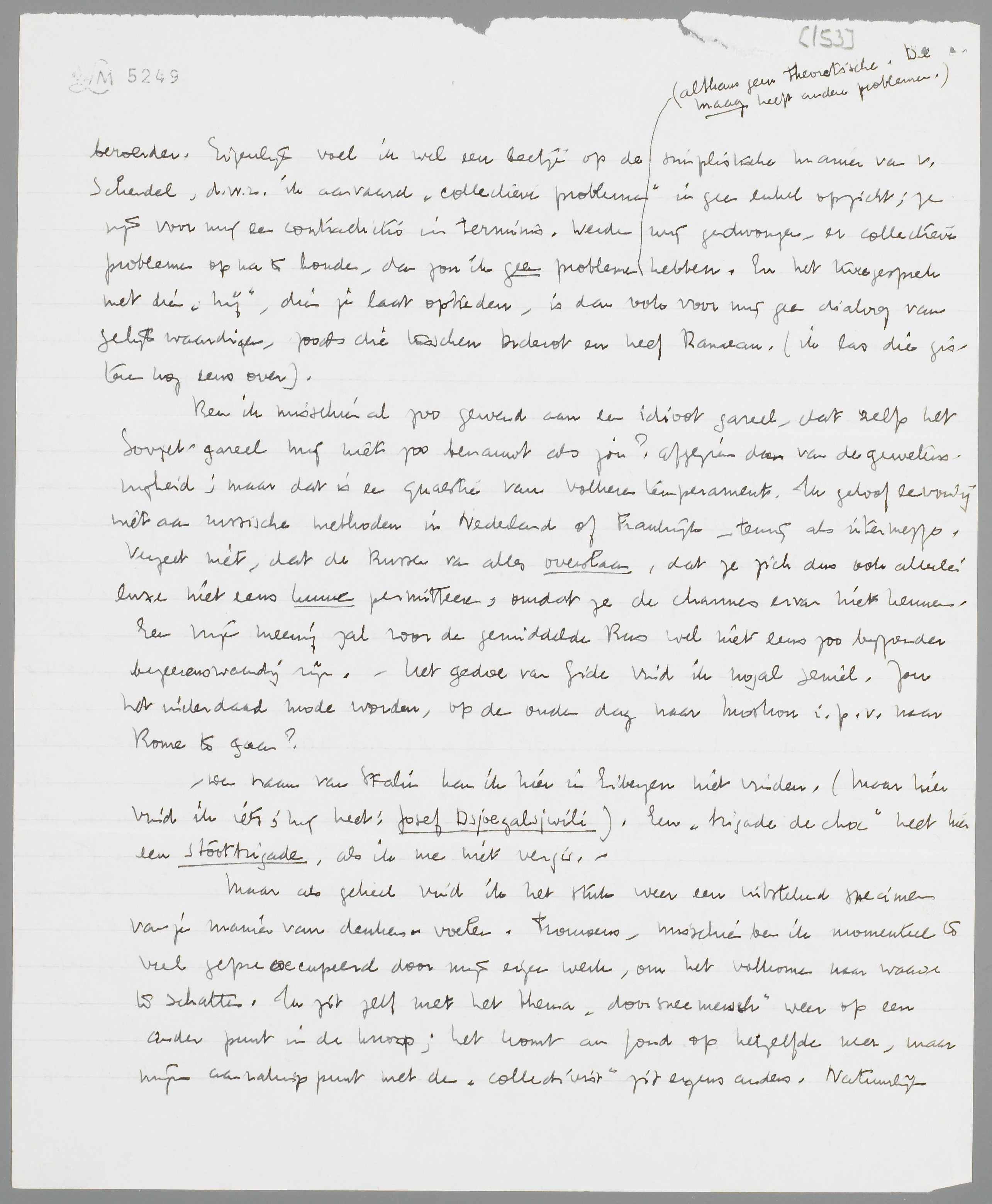 Maar als geheel vind ik het stuk weer een uitstekend specimen van je manier van denken - voelen. Trouwens, misschien ben ik momenteel te veel gepreoccupeerd door mijn eigen werk, om het volkomen naar waarde te schatten. Ik zit zelf met het thema ‘doorsneemensch’ weer op een ander punt in de knoop; het komt au fond op hetzelfde neer, maar mijn aanrakingspunt met den ‘collectivist’ zit ergens anders. Natuurlijk ben ik er voor, dat de stukken over de revolutie in Feb.-Maart geplaatst worden. Ze hooren bij elkaar en zijn, hoe mijn persoonlijke instelling ertegenover ook mag zijn, onbetwistbaar eersterangs. Wie weet, ben ik in Febr. al zoo door collectieven aangeknauwd, dat ik ook naar Perzië wil! Overigens, dat lijkt me bedenkelijk dicht bij de Sovjets! Liever Tahiti.