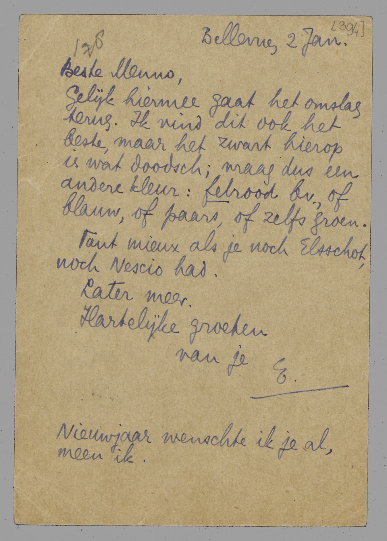 Gelijk hiermee gaat het omslag terug. Ik vind dit ook het beste, maar het zwart hierop is wat doodsch; vraag dus een andere kleur: felrood bv., of blauw, of paars, of zelfs groen.