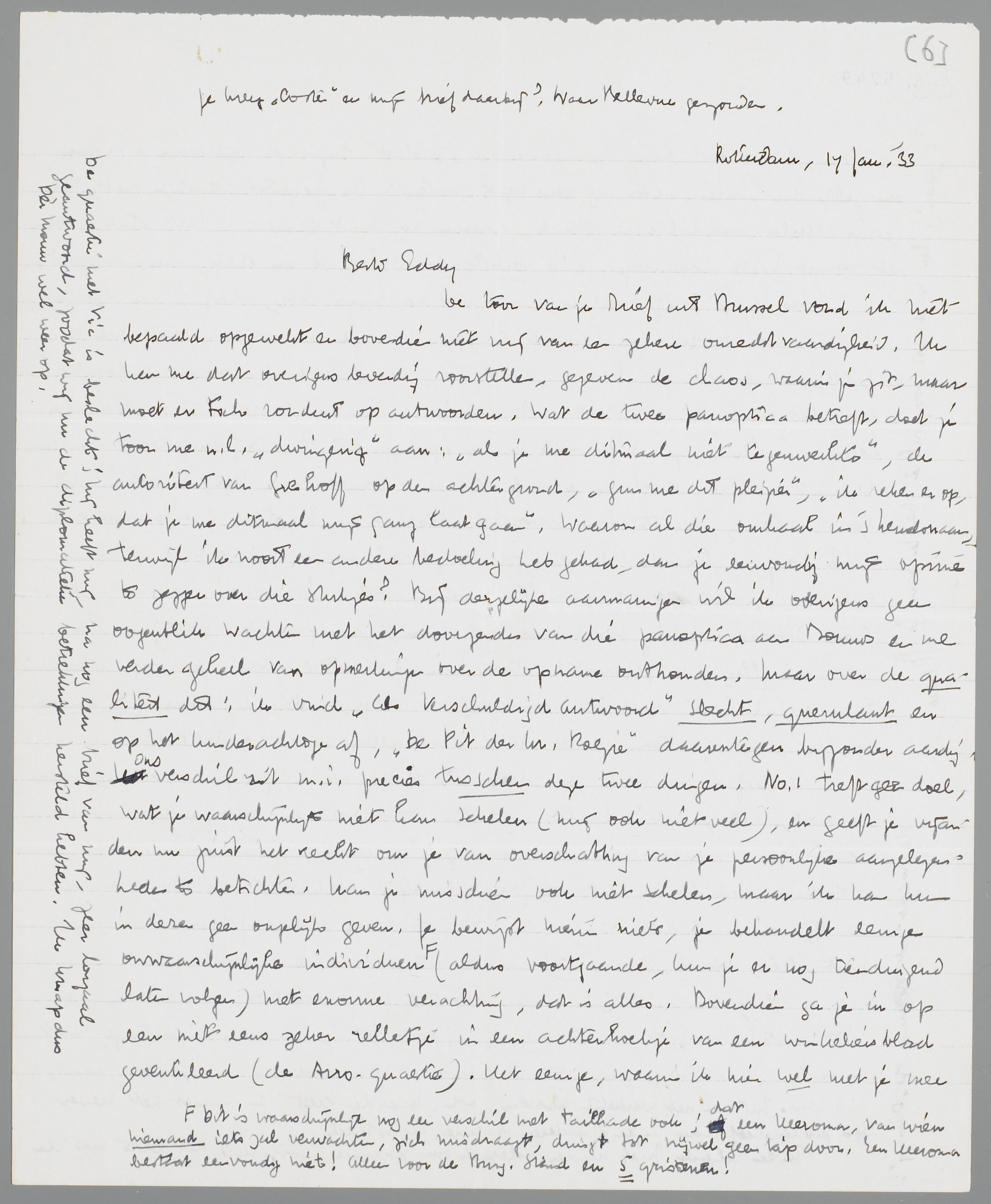 De toon van je brief uit Brussel vond ik niet bepaald opgewekt en bovendien niet vrij van een zekere onrechtvaardigheid. Ik kan me dat overigens levendig voorstellen, gegeven de chaos, waarin je zit, maar moet er toch ronduit op antwoorden. Wat de twee panoptica betreft, doet je toon me n.l. ‘dwingerig’ aan: ‘als je me ditmaal niet tegenwerkte’, de autoriteit van Greshoff op den achtergrond, ‘gun me dit pleizier’, ‘ik reken er op, dat je me ditmaal mijn gang laat gaan’. Waarom al die omhaal in 's hemelsnaam, terwijl ik nooit een andere bedoeling heb gehad, dan je eenvoudig mijn opinie te zeggen over die stukjes? Bij dergelijke aanmaningen wil ik overigens geen oogenblik wachten met het doorzenden van die panoptica aan Bouws en me verder geheel van opmerkingen over de opname onthouden. Maar over de qualiteit dit: ik vind ‘Als Verschuldigd Antwoord’ slecht, querulant en op het kinderachtige af, ‘De Pit der kr. Poezie’ daarentegen bijzonder aardig. Ons verschil zit m.i. precies tusschen deze twee dingen. No. 1 treft geen doel, wat je waarschijnlijk niet kan schelen (mij ook niet veel), en geeft je vijanden nu juist het recht om je van overschatting van je persoonlijke aangelegenheden te betichten. Kan je misschien ook niet schelen, maar ik kan hun in dezen geen ongelijk geven. Je bewijst hierin niets, je behandelt eenige onwaarschijnlijke individuen* (aldus voortgaande, kun je er nog tienduizend laten volgen) met enorme verachting, dat is alles. Bovendien ga je in op een niet eens zeker relletje in een achterhoekje van een winkeliersblad geventileerd (de Avro-quaestie). Het eenige, waarin ik hier wel met je mee kan gaan, is de toelichting van het woord ‘proleet’ tegenover Heeroma. Maar om zelfs die hondenquaestie nog eens op te halen: ik begrijp werkelijk niet, hoe je in allerlei moeilijkheden zittend, daaraan nog kunt denken. - Het stukje over het sonnet heeft daarentegen juist substantie; het is een klap, die aankomt.