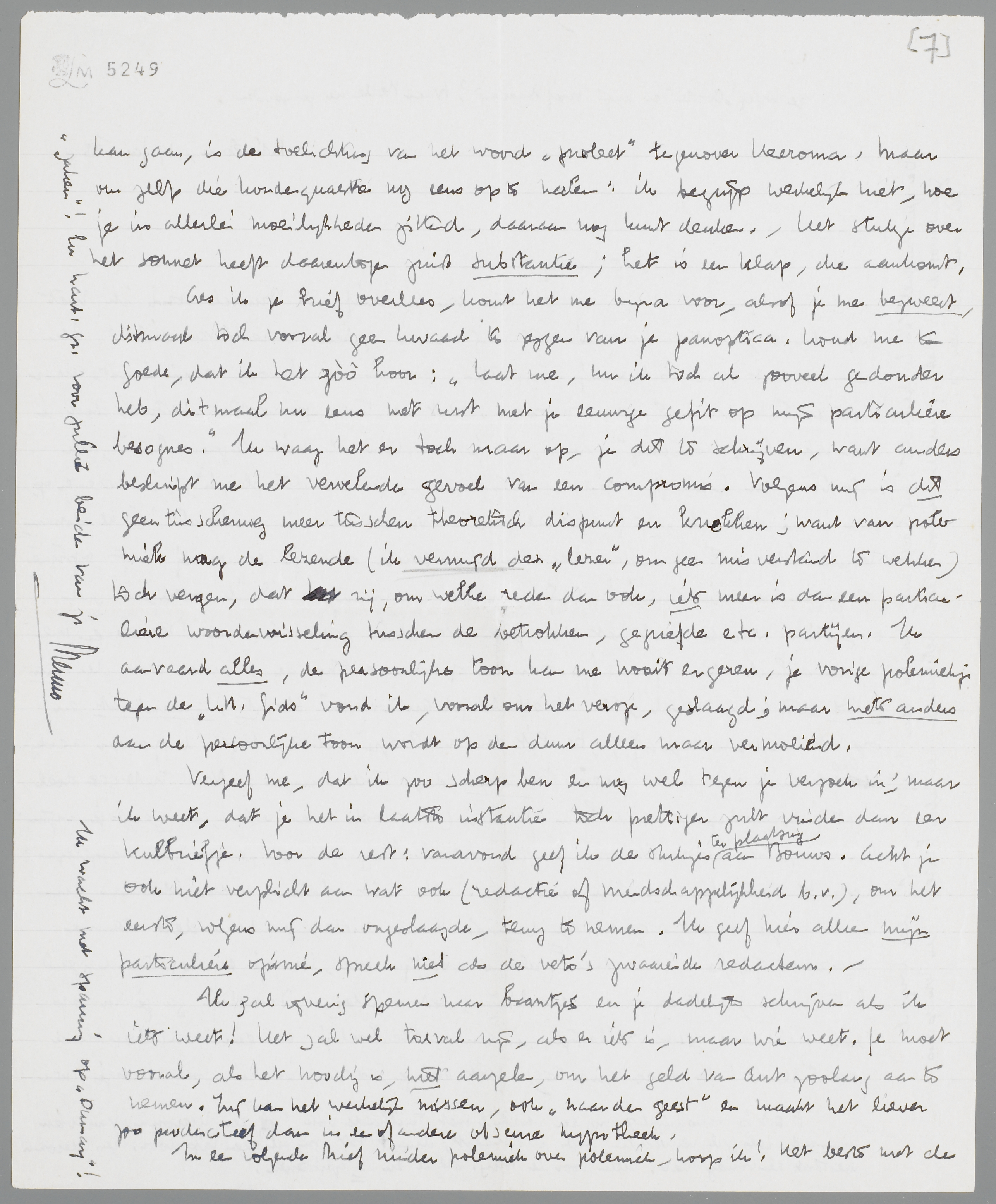 Als ik je brief overlees, komt het me bijna voor, alsof je me bezweert, ditmaal toch vooral geen kwaad te zeggen van je panoptica. Houd me ten goede, dat ik het zòò hoor: ‘Laat me, nu ik toch al zooveel gedonder heb, ditmaal nu eens met rust met je eeuwige gefit op mijn particuliere besognes.’ Ik waag het er toch maar op, je dit te schrijven, want anders besluipt me het vervelende gevoel van een compromis. Volgens mij is dit geen tusschenweg meer tusschen theoretisch dispuut en knokken; want van polemiek mag de lezende (ik vermijd den ‘lezer’, om geen misverstand te wekken) toch vergen, dat zij, om welke reden dan ook, iets meer is dan particuliere woordenwisseling tusschen de betrokken, gegriefde etc. partijen. Ik aanvaard alles, de persoonlijke toon kan me nooit ergeren, je vorige polemiekje tegen de Litt. Gids vond ik, vooral om het versje, geslaagd; maar niets anders dan de persoonlijke toon wordt op den duur maar vermoeiend.