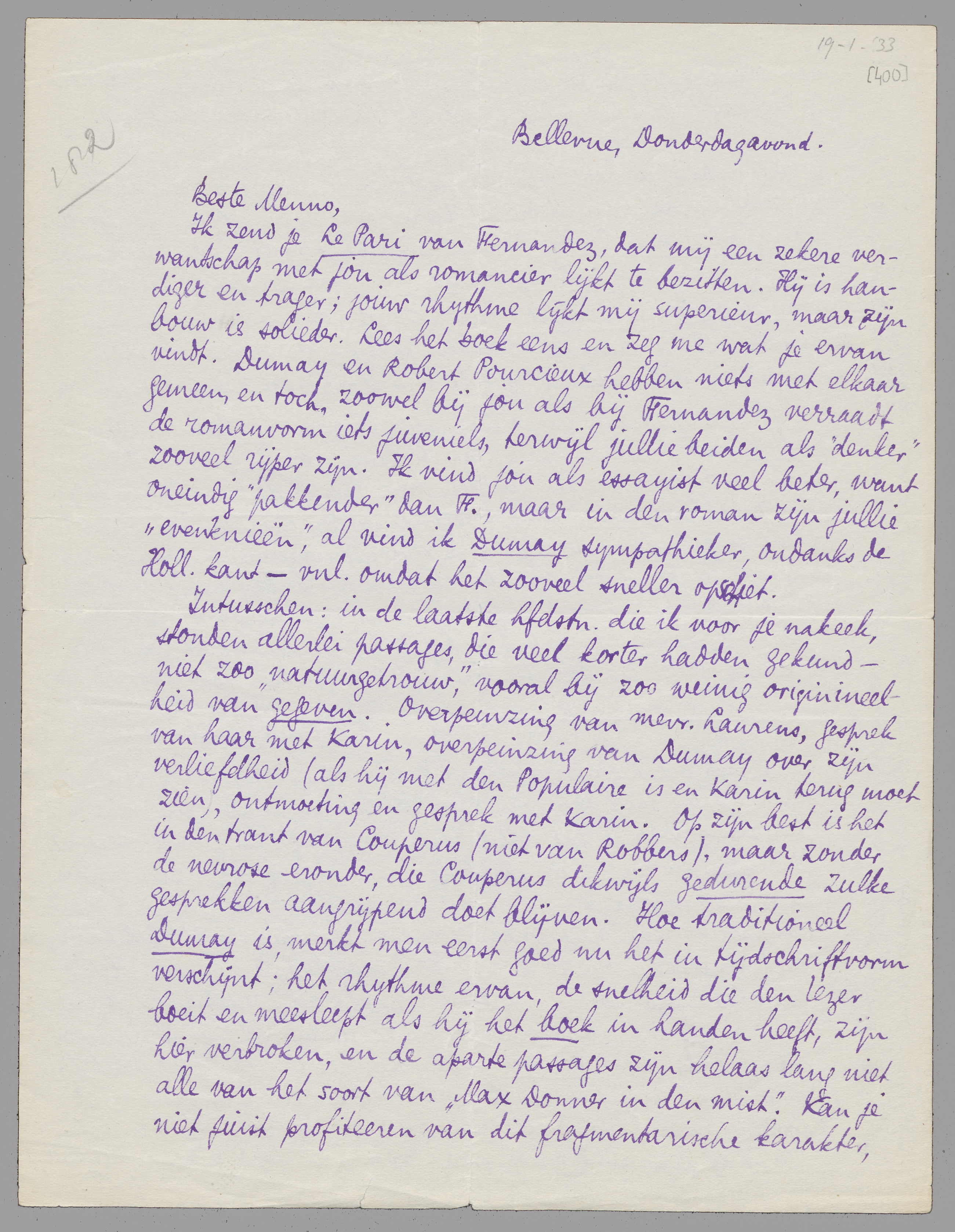 Ik zend je Le Pari van Fernandez, dat mij een zekere verwantschap met jou als romancier lijkt te bezitten. Hij is handiger en trager; jouw rhythme lijkt mij superieur, maar zijn bouw is solieder. Lees het boek eens en zeg me wat je ervan vindt. Dumay en Robert Pourcieux hebben niets met elkaar gemeen, en toch, zoowel bij jou als bij Fernandez verraadt de romanvorm iets juveniels, terwijl jullie beiden als ‘denker’ zooveel rijper zijn. Ik vind jou als essayist veel beter, want oneindig ‘pakkender’ dan F., maar in den roman zijn jullie ‘evenknieën’, al vind ik Dumay sympathieker, ondanks de Holl. kant - vnl. omdat het zooveel sneller opschiet.