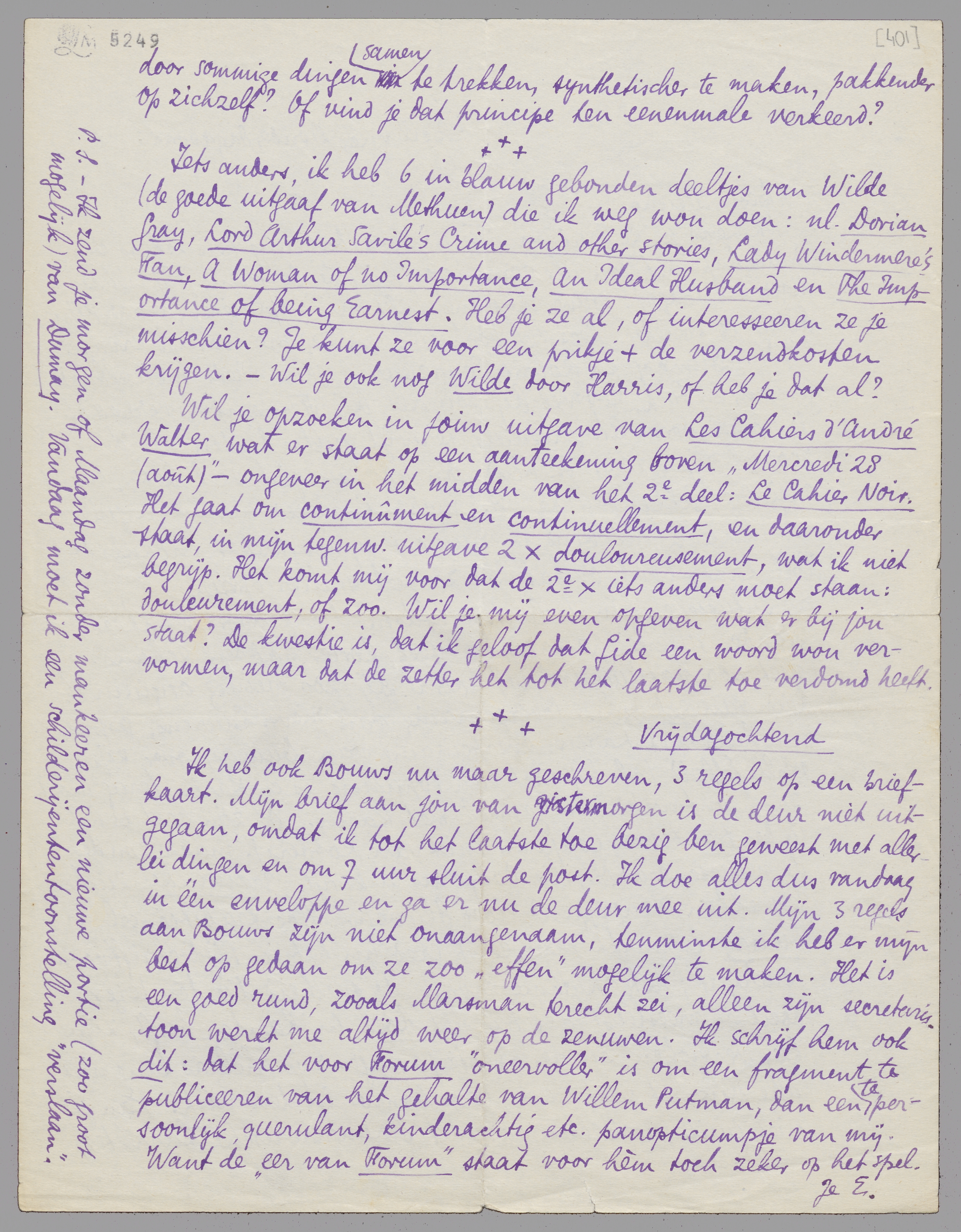 Ik heb ook Bouws nu maar geschreven, 3 regels op een briefkaart. Mijn brief aan jou van gistermorgen is de deur niet uitgegaan, omdat ik tot het laatste toe bezig ben geweest met allerlei dingen en om 7 uur sluit de post. Ik doe alles dus vandaag in èèn enveloppe en ga er nu de deur mee uit. Mijn 3 regels aan Bouws zijn niet onaangenaam, tenminste ik heb er mijn best op gedaan om ze zoo ‘effen’ mogelijk te maken. Het is een goed rund, zooals Marsman terecht zei, alleen zijn secretaris-toon werkt me altijd weer op de zenuwen. Ik schrijf hem ook dit: dat het voor Forum ‘oneervoller’ is om een fragment te publiceeren van het gehalte van Willem Putman, dan een te persoonlijk, querulant, kinderachtig etc. panopticumpje van mij. Want de ‘eer van Forum’ staat voor hèm toch zeker op het spel.