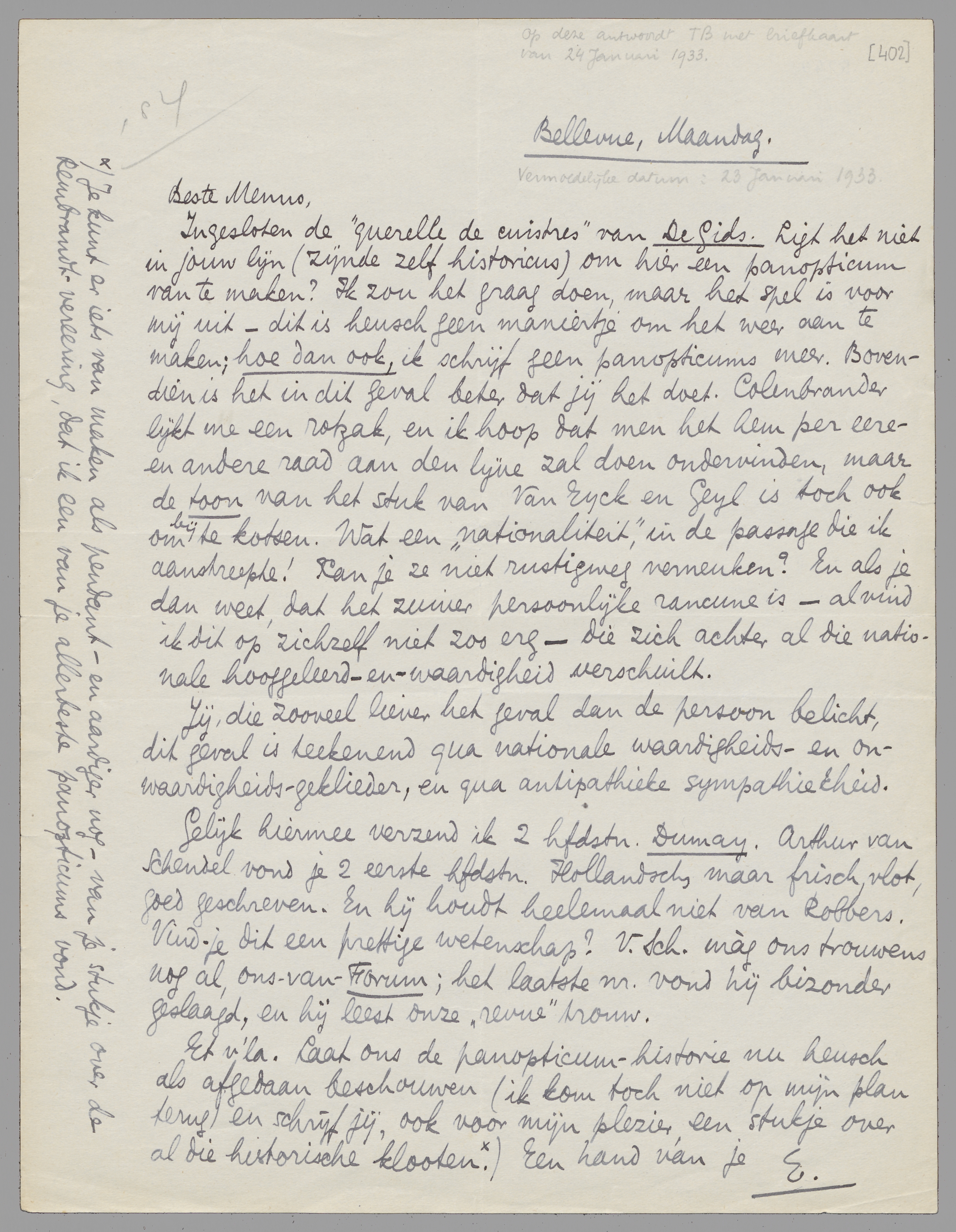 Ingesloten de ‘querelle de cuistres’ van De Gids. Ligt het niet in jouw lijn (zijnde zelf historicus) om hier een panopticum van te maken? Ik zou het graag doen, maar het spel is voor mij uit - dit is heusch geen maniertje om het weer aan te maken; hoe dan ook, ik schrijf geen panopticums meer. Bovendien is het in dit geval beter dat jij het doet. Colenbrander lijkt me een rotzak, en ik hoop dat men het hem per eere - en andere raad aan den lijve zal doen ondervinden, maar de toon van het stuk van Van Eyck en Geyl is toch ook om bij te kotsen. Wat een ‘nationaliteit’, in de passage die ik aanstreepte! Kan je ze niet rustigweg verneuken? En als je dan weet, dat het zuiver persoonlijke rancune is - al vind ik dit op zichzelf niet zoo erg - die zich achter al die nationale hooggeleerd-en-waardigheid verschuilt.