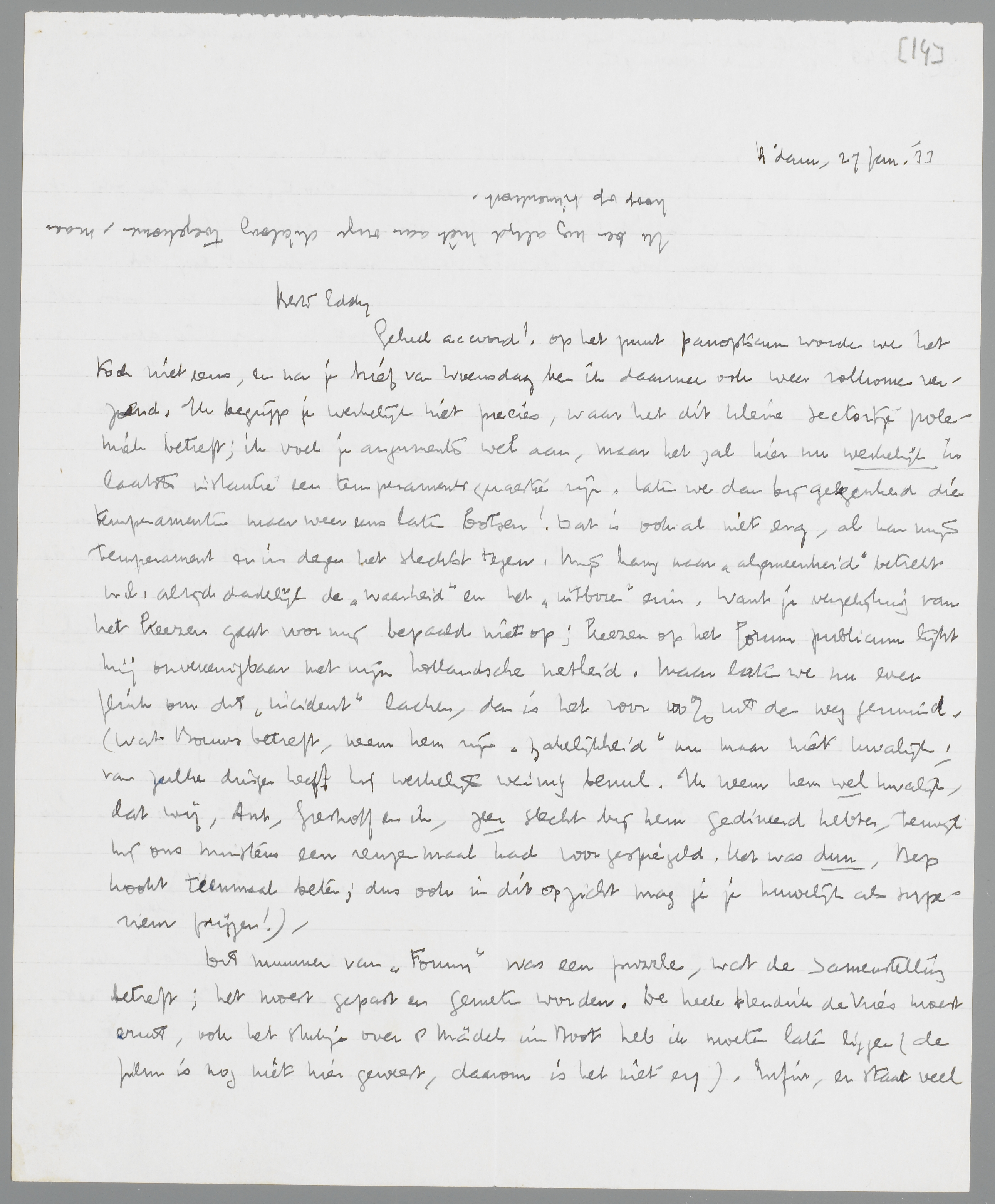 Dit nummer van Forum was een puzzle, wat de samenstelling betreft; het moest gepast en gemeten worden. De heele Hendrik de Vries moest eruit, ook het stukje over 8 Mädels im Boot heb ik moeten laten liggen (de film is nog niet hier geweest, daarom is het niet erg). Enfin, er staat veel aardigs in, maar als geheel zal het niet zoo voldoen als het Jan. nummer. Ik heb het panopt. over de tyrannie zeer moeten bekorten en ergo kan ook het ‘nationale tweetal’ er niet meer bij [laten overliggen leek mij niet zoo geschikt; de zaak is nu actueel en na een maand weer vergeten.]; alles past nu precies in elkaar.