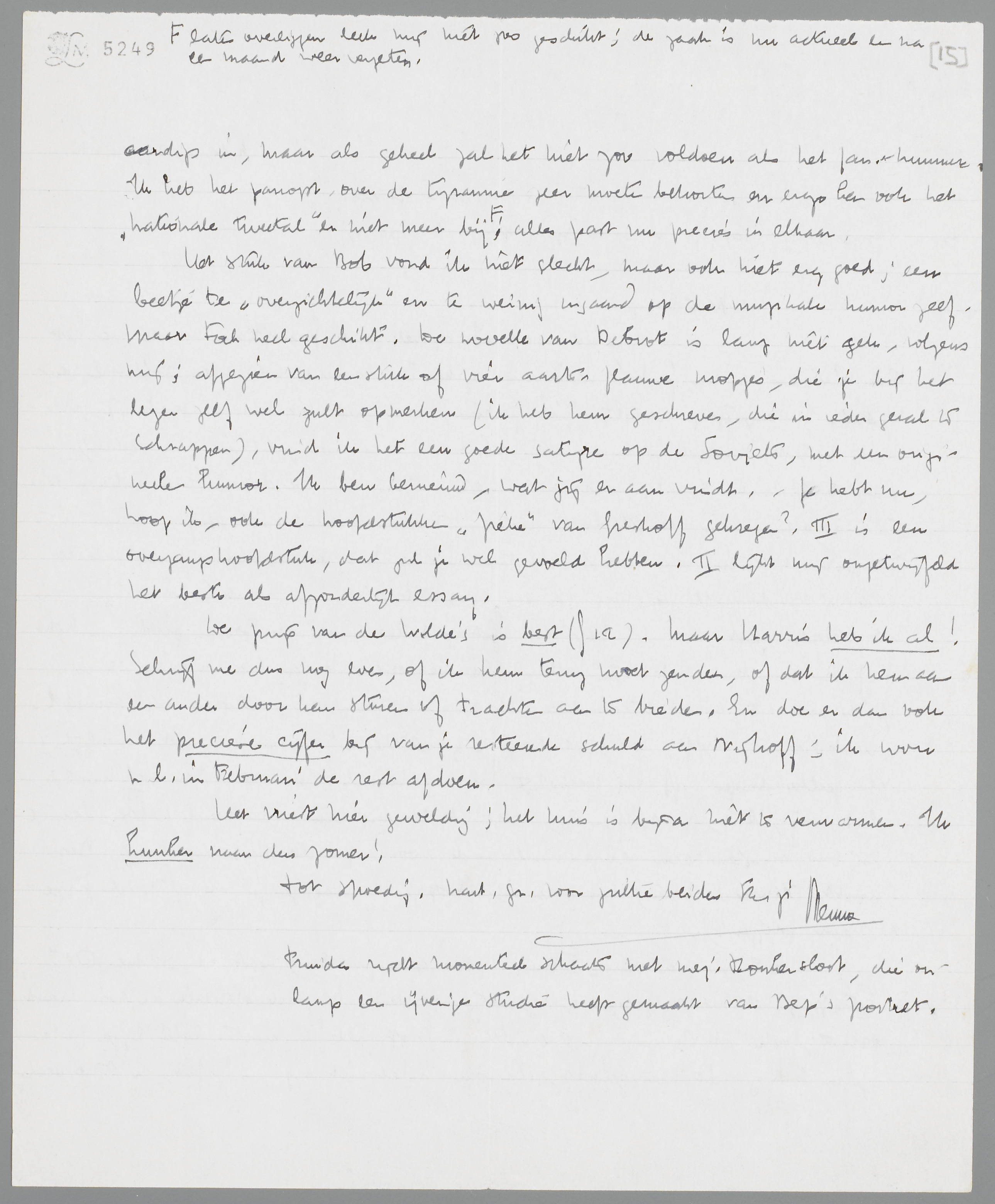 Het stuk van Bob vond ik niet slecht, maar ook niet erg goed; een beetje te ‘overzichtelijk’ en te weinig ingaand op de muzikale humor zelf. Maar toch heel geschikt. De novelle van Debrot is lang niet gek, volgens mij; afgezien van een stuk of vier aarts-flauwe mopjes, die je bij het lezen zelf wel zult opmerken (ik heb hem geschreven, die in ieder geval te schrappen), vind ik het een goede satyre op de Sovjets, met een origineele humor. Ik ben benieuwd, wat jij er aan vindt. - Je hebt nu, hoop ik, ook de hoofdstukken Zieke van Greshoff gekregen? III is een overgangshoofdstuk, dat zul je wel gevoeld hebben. II lijkt mij ongetwijfeld het beste als afzonderlijk essay.