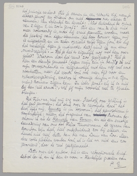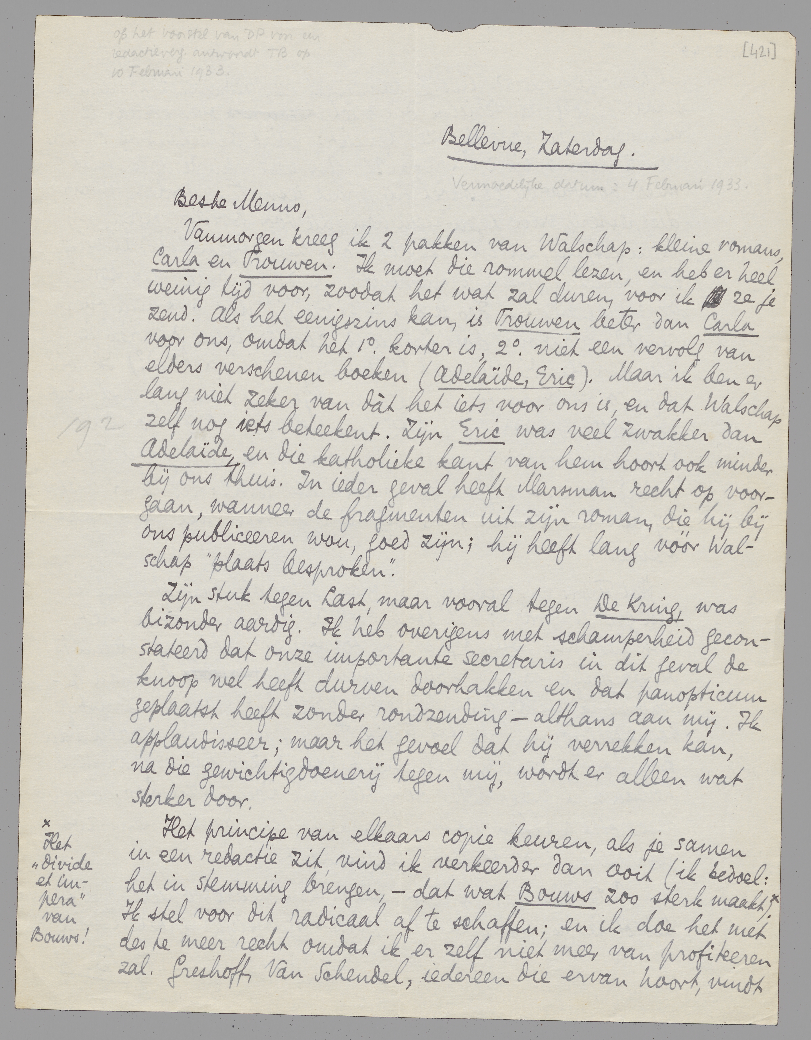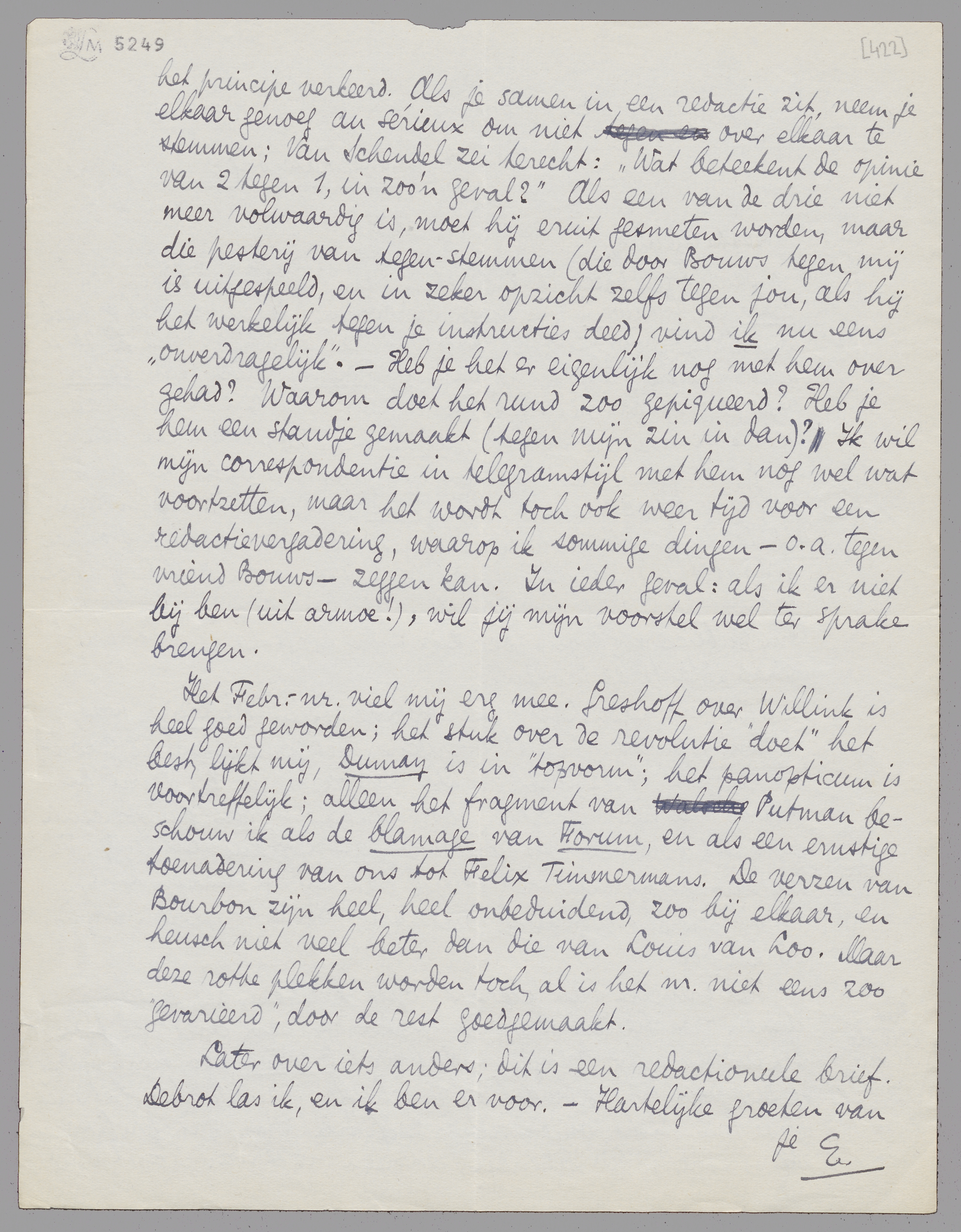 Het principe van elkaars copie keuren, als je samen in een redactie zit, vind ik verkeerder dan ooit (ik bedoel: het in stemming brengen, - dat wat Bouws zoo sterk maakt. Het ‘divide et impera’ van Bouws!) Ik stel voor dit radicaal af te schaffen; en ik doe het met des te meer recht omdat ik er zelf niet meer van profiteeren zal. Greshoff, Van Schendel, iedereen die ervan hoort, vindt het principe verkeerd. Als je samen in een redactie zit, neem je elkaar genoeg au sérieux om niet over elkaar te stemmen; Van Schendel zei terecht: ‘Wat betekent de opinie van 2 tegen 1, in zoo'n geval?’ Als een van de drie niet meer volwaardig is, moet hij eruit gesmeten worden, maar die pesterij van tegen-stemmen (die door Bouws tegen mij is uitgespeeld, en in zeker opzicht zelfs tegen jou, als hij het werkelijk tegen je instructies deed) vind ik nu eens ‘onverdragelijk’. - Heb je het er eigenlijk nog met hem over gehad? Waarom doet het rund zoo gepiqueerd? Heb je hem een standje gemaakt (tegen mijn zin in dan)? Ik wil mijn correspondentie in telegramstijl met hem nog wel wat voortzetten, maar het wordt toch ook weer tijd voor een redactievergadering, waarop ik sommige dingen - o.a. tegen vriend Bouws - zeggen kan. In ieder geval: als ik er niet bij ben (uit armoe), wil jij mijn voorstel wel ter sprake brengen.