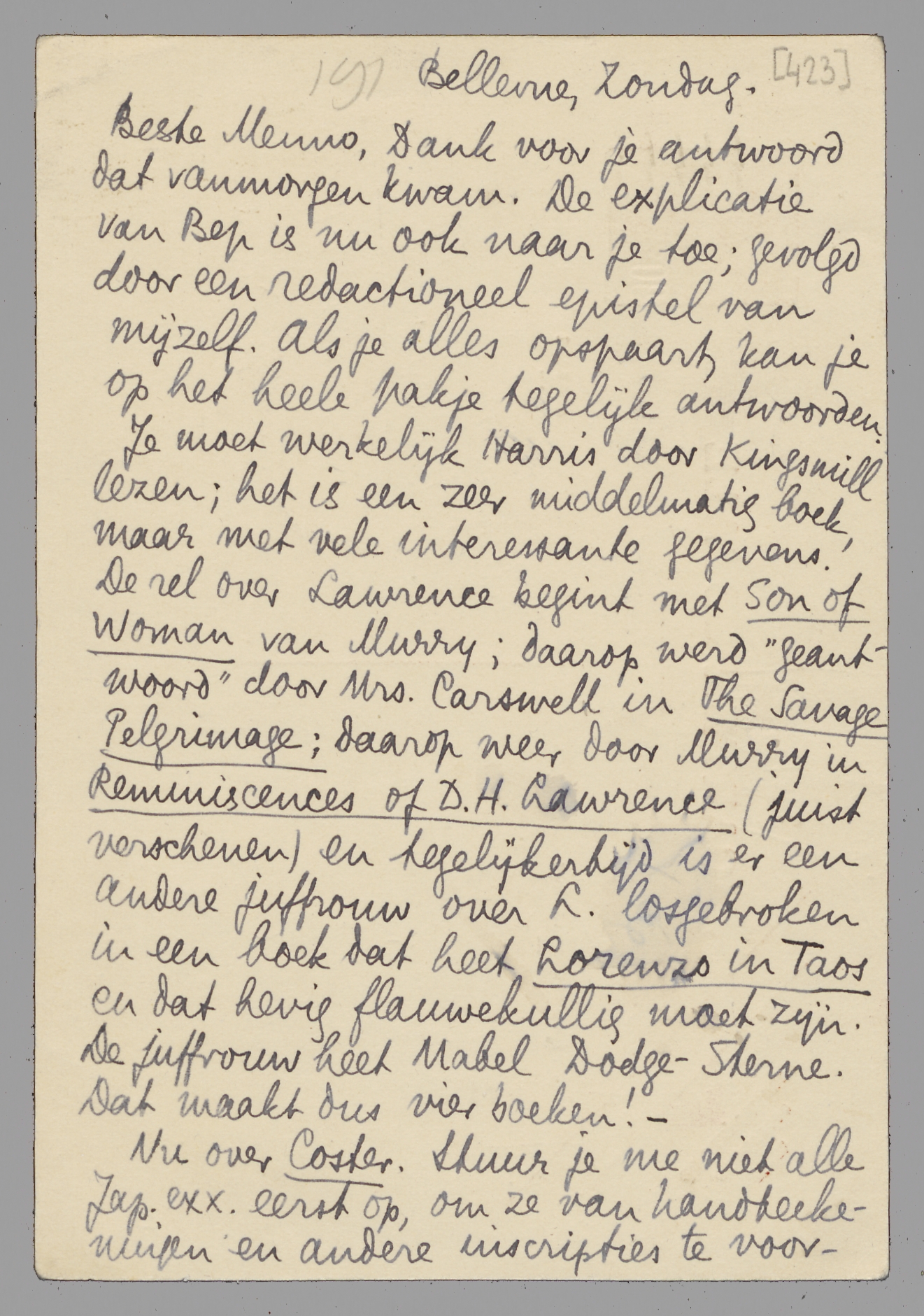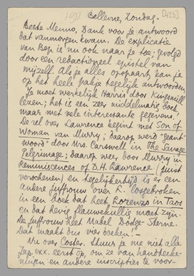 Dank voor je antwoord dat vanmorgen kwam. De explicatie van Bep is nu ook naar je toe; gevolgd door een redactioneel epistel van mijzelf. Als je alles opspaart, kan je op het heele pakje tegelijk antwoorden. Je moet werkelijk Harris door Kingsmill lezen; het is een zeer middelmatig boek, maar met vele interessante gegevens. De rel over Lawrence begint met Son of Woman van Murry; daarop werd ‘geantwoord’ door Mrs. Carswell in The Savage Pelgrimage; daarop weer door Murry in Reminiscences of D.H. Lawrence (juist verschenen) en tegelijkertijd is er een andere juffrouw over L. losgebroken in een boek dat heet Lorenzo in Taos en dat hevig flauwekullig moet zijn. De juffrouw heet Mabel Dodge-Sterne. Dat maakt dus vier boeken! -
