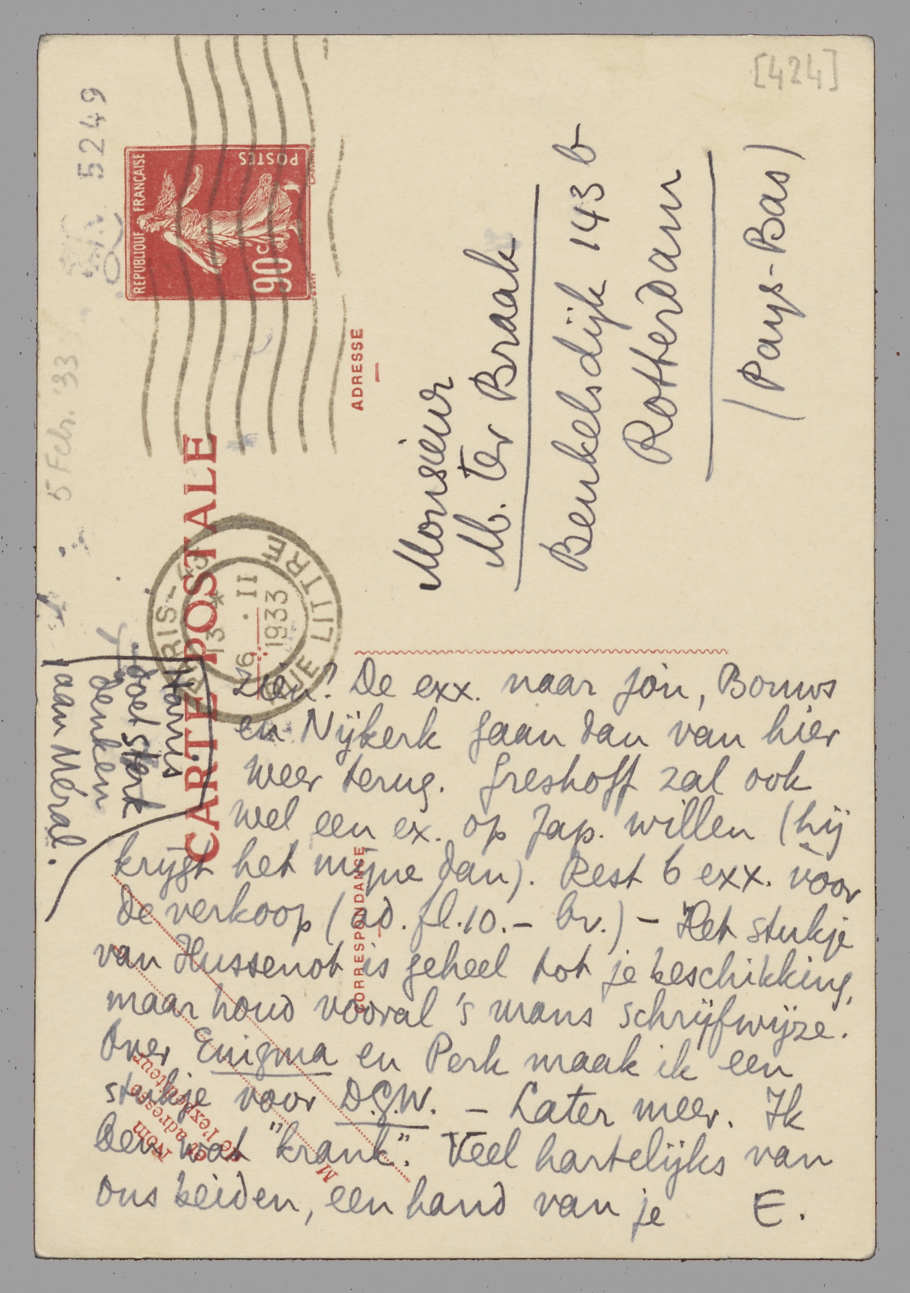 Nu over Coster. Stuur je me niet alle Jap. exx. eerst op, om ze van handteekeningen en andere inscripties te voorzien? De exx. naar jou, Bouws en Nijkerk gaan dan van hier weer terug. Greshoff zal ook wel een ex. op Jap. willen (hij krijgt het mijne dan). Rest 6 exx. voor de verkoop (ad. fl. 10.- bv.) - Het stukje van Hussenot is geheel tot je beschikking, maar houd vooral 's mans schrijfwijze. Over Enigma en Perk maak ik een stukje voor D.G.W. - Later meer. Ik ben wat ‘krank’. Veel hartelijks van ons beiden, een hand van je