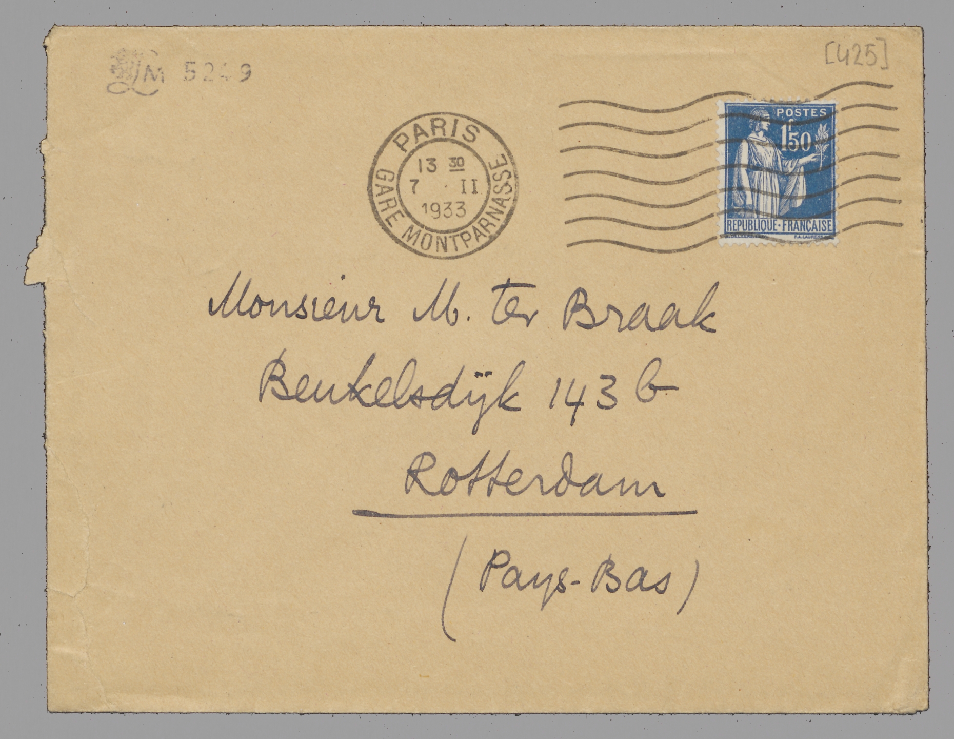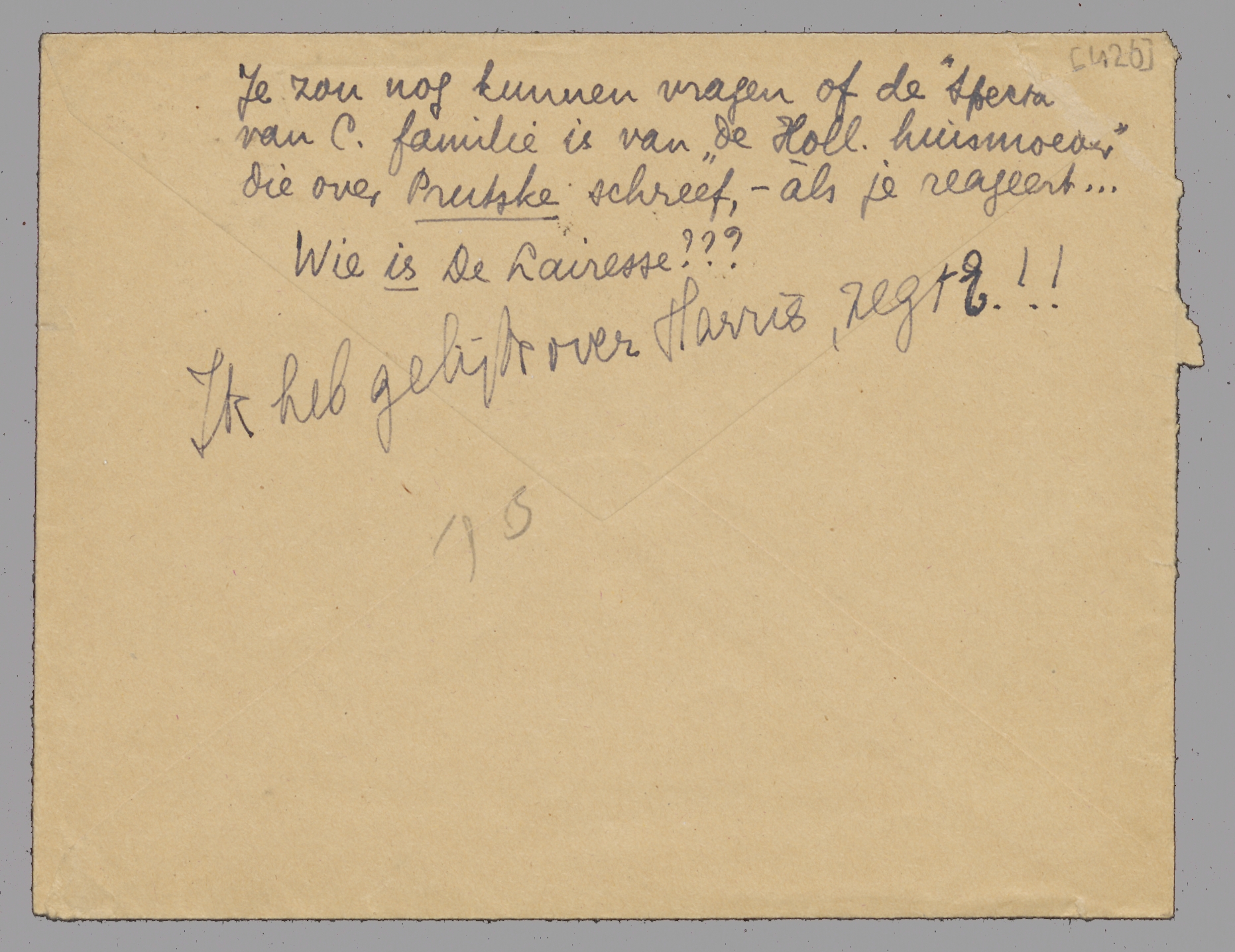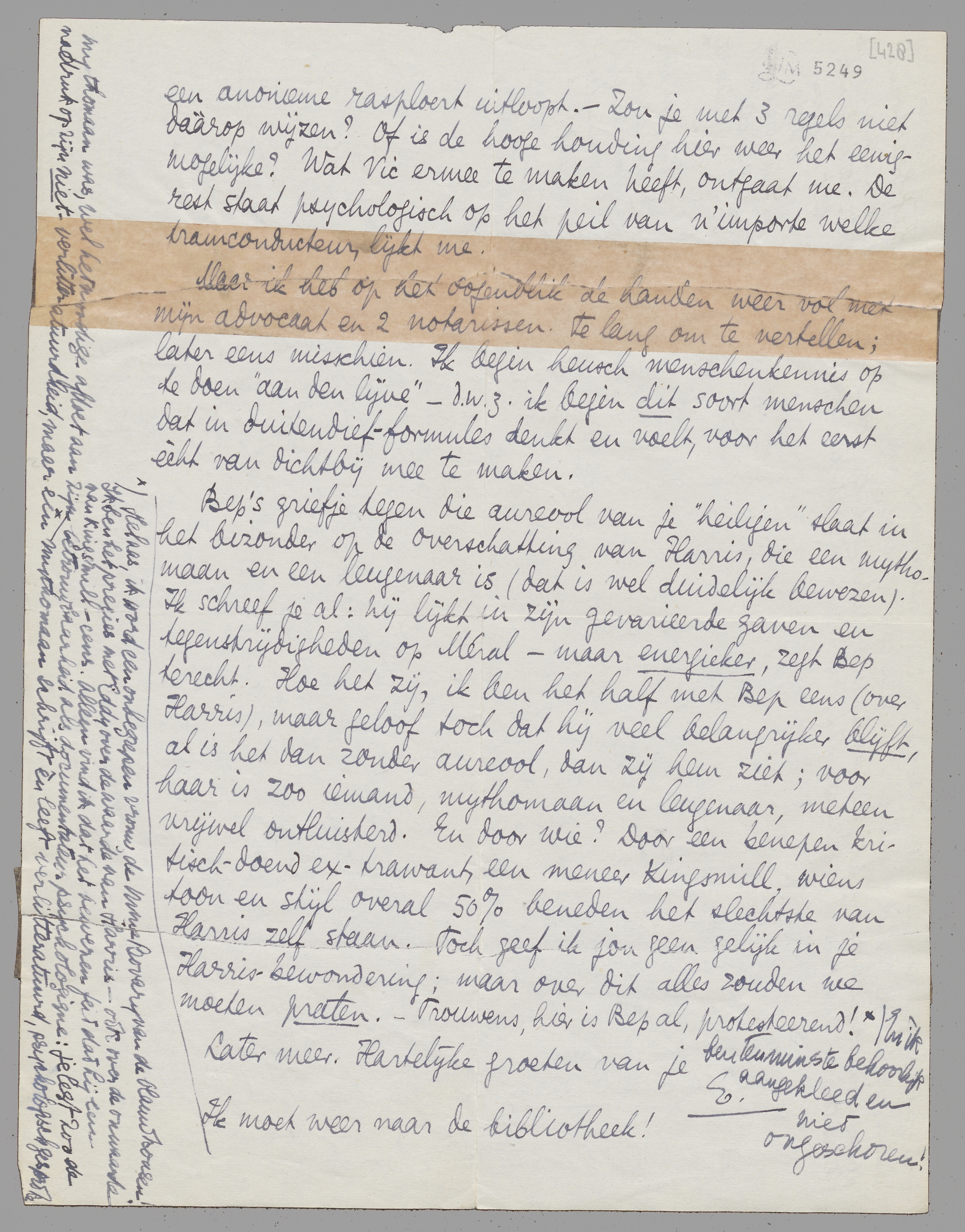 Bep's griefje tegen die aureool van je ‘heiligen’ slaat in het bizonder op de overschatting van Harris, die een mythomaan en een leugenaar is (dat is wel duidelijk bewezen). Ik schreef je al: hij lijkt in zijn gevarieerde gaven en tegenstrijdigheden op Méral - maar energieker, zegt Bep terecht. Hoe het zij, ik ben het half met Bep eens (over Harris), maar geloof toch dat hij veel belangrijker blijft, al is het dan zonder aureool, dan zij hem ziet; voor haar is zoo iemand, mythomaan en leugenaar, meteen vrijwel ontluisterd. En door wie? Door een benepen kritischdoend ex-trawant, een meneer Kingsmill, wiens toon en stijl overal 50% beneden het slechtste van Harris zelf staan. Toch geef ik jou geen gelijk in je Harris-bewondering; maar over dit alles zouden we moeten praten. - Trouwens, hier is Bep al, protesteerend! [E.d.P. - d.R.: En ik ben tenminste behoorlijk aangekleed en niet ongeschoren!] Later meer. Hartelijke groeten van je