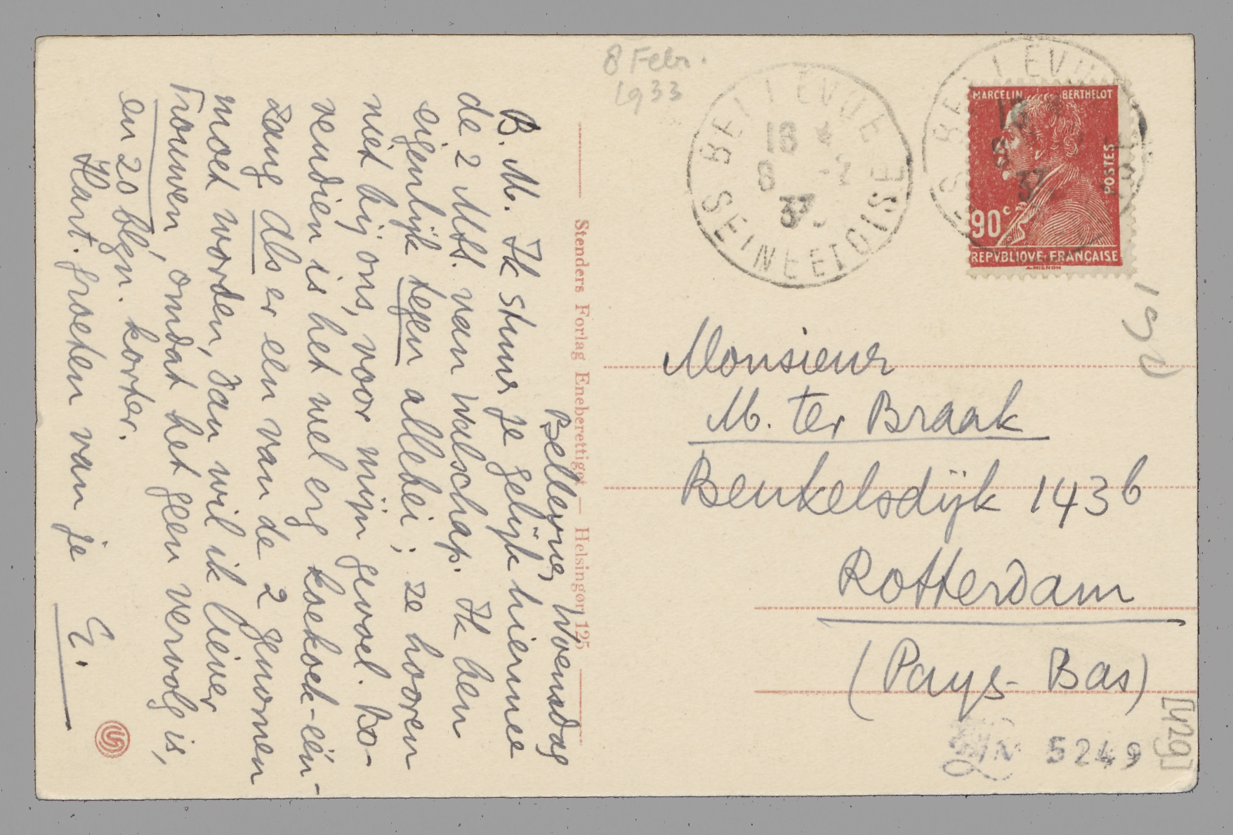 Ik stuur je gelijk hiermee de 2 MSS. van Walschap. Ik ben eigenlijk tegen allebei; ze hooren niet bij ons, voor mijn gevoel. Bovendien is het wel erg koekoek-éénzang. Als er een van de 2 genomen moet worden, dan wil ik liever Trouwen, omdat het geen vervolg is, en 20 blzn. korter. Hart. groeten van je