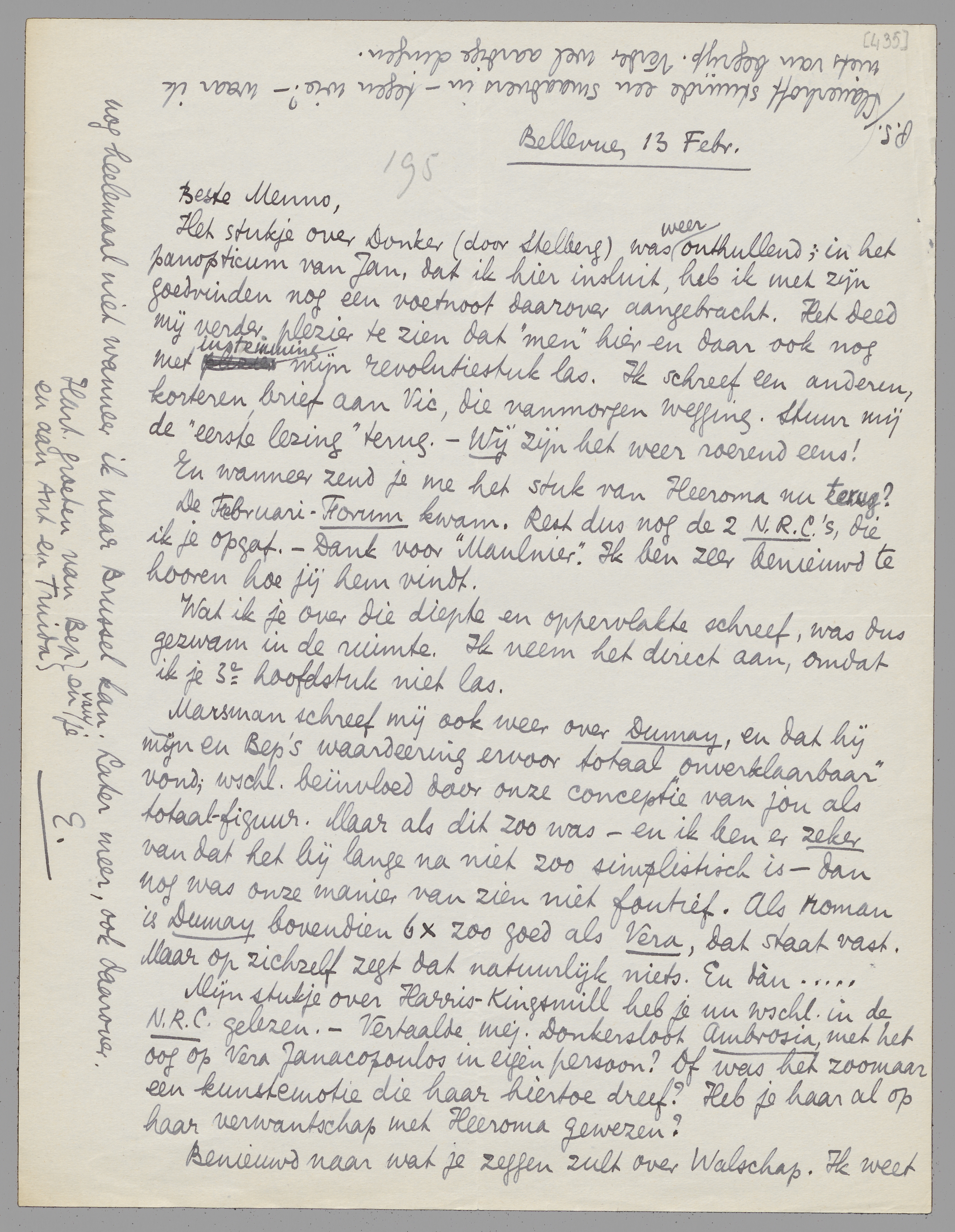 Marsman schreef mij ook weer over Dumay, en dat hij mijn en Bep's waardeering ervoor totaal ‘onverklaarbaar’ vond; wschl. beïnvloed door onze conceptie van jou als totaal-figuur. Maar als dit zoo was - en ik ben er zeker van dat het bij lange na niet zoo simplistisch is - dan nog was onze manier van zien niet foutief. Als roman is Dumay bovendien 6 × zoo goed als Vera, dat staat vast. Maar op zichzelf zegt dat natuurlijk niets. En dàn... Mijn stukje over Harris-Kingsmill heb je nu wschl. in de N.R.C. gelezen. - Vertaalde mej. Donkersloot Ambrosia, met het oog op Vera Janacopoulos in eigen persoon? Of was het zoomaar een kunstemotie die haar hiertoe dreef? Heb je haar al op haar verwantschap met Heeroma gewezen?