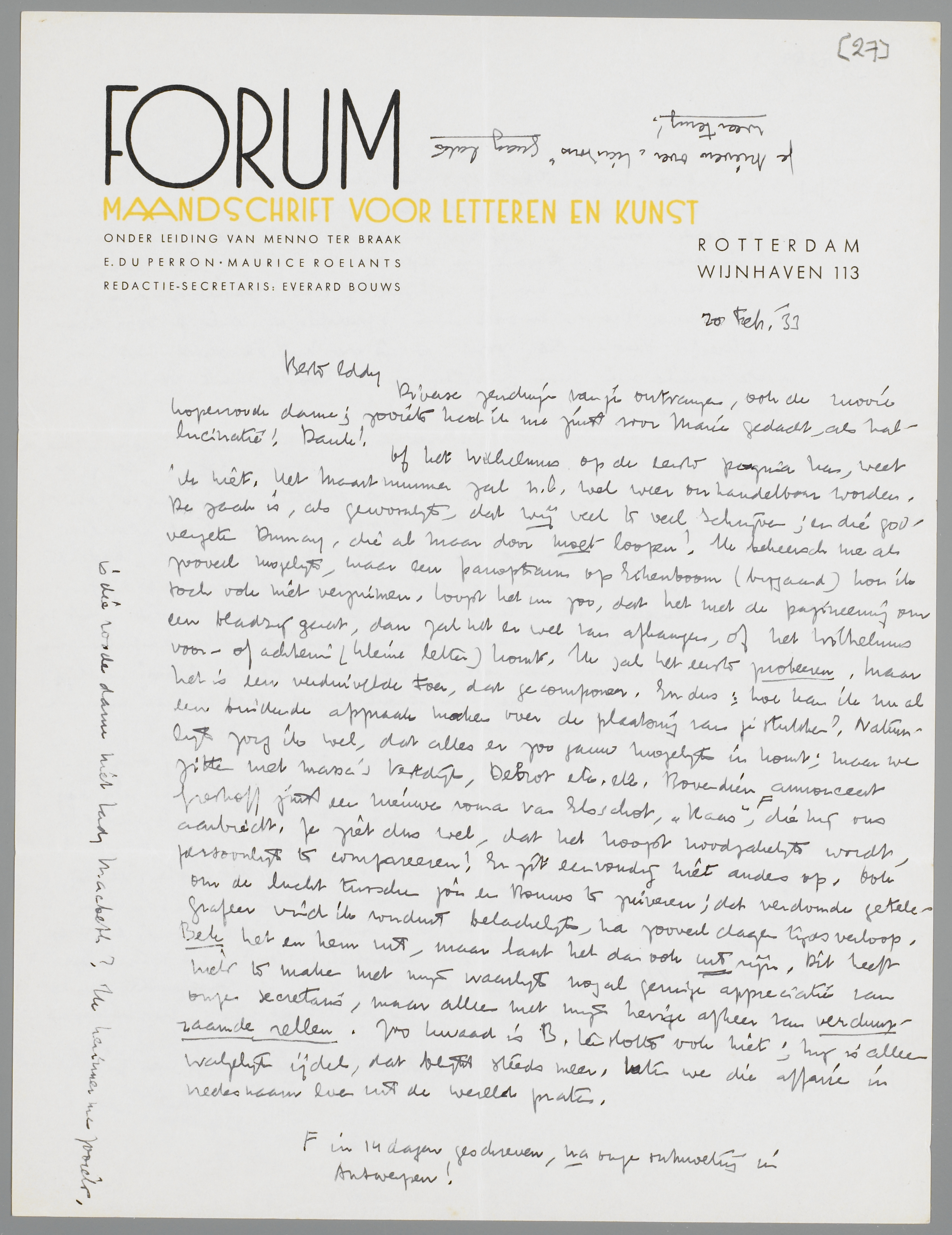 Of het Wilhelmus op de eerste pagina kan, weet ik niet. Het Maartnummer zal n.l. wel weer onhandelbaar worden. De zaak is, als gewoonlijk, dat wij veel te veel schrijven; en die godvergeten Dumay, die al maar door moet loopen! Ik beheersch me al zooveel mogelijk, maar een panopticum op Eikenboom (bijgaand) kon ik toch ook niet verzuimen. Loopt het nu zoo, dat het met de pagineering om een bladzij gaat, dan zal het er wel van afhangen, of het Wilhelmus voor- of achterin (kleine letter) komt. Ik zal het eerste probeeren. Maar het is een verduivelde toer, dat gecomponeer. En dus: hoe kan ik nu al een bindende afspraak maken over de plaatsing van je stukken? Natuurlijk zorg ik wel, dat alles er zoo gauw mogelijk in komt; maar we zitten met massa's Vestdijk, Debrot etc. etc. Bovendien annonceert Greshoff juist een nieuwe roman van Elsschot, Kaas*, die hij ons aanbiedt. Je ziet dus wel, dat het hoogst noodzakelijk wordt, persoonlijk te compareeren! Er zit eenvoudig niet anders op. Ook om de lucht tusschen jou en Bouws te zuiveren; dat verdomde getelegrafeer vind ik ronduit belachelijk, na zooveel dagen tijdsverloop. Bek het en hem uit, maar laat het dan ook uit zijn. Dit heeft niets te maken met mijn waarlijk nogal geringe appreciatie van onzen secretaris, maar alleen met mijn hevige afkeer van verduurzaamde rellen. Zoo kwaad is B. tenslotte ook niet; hij is alleen walgelijk ijdel, dat blijkt steeds meer. Laten we die affaire in vredesnaam even uit de wereld praten.