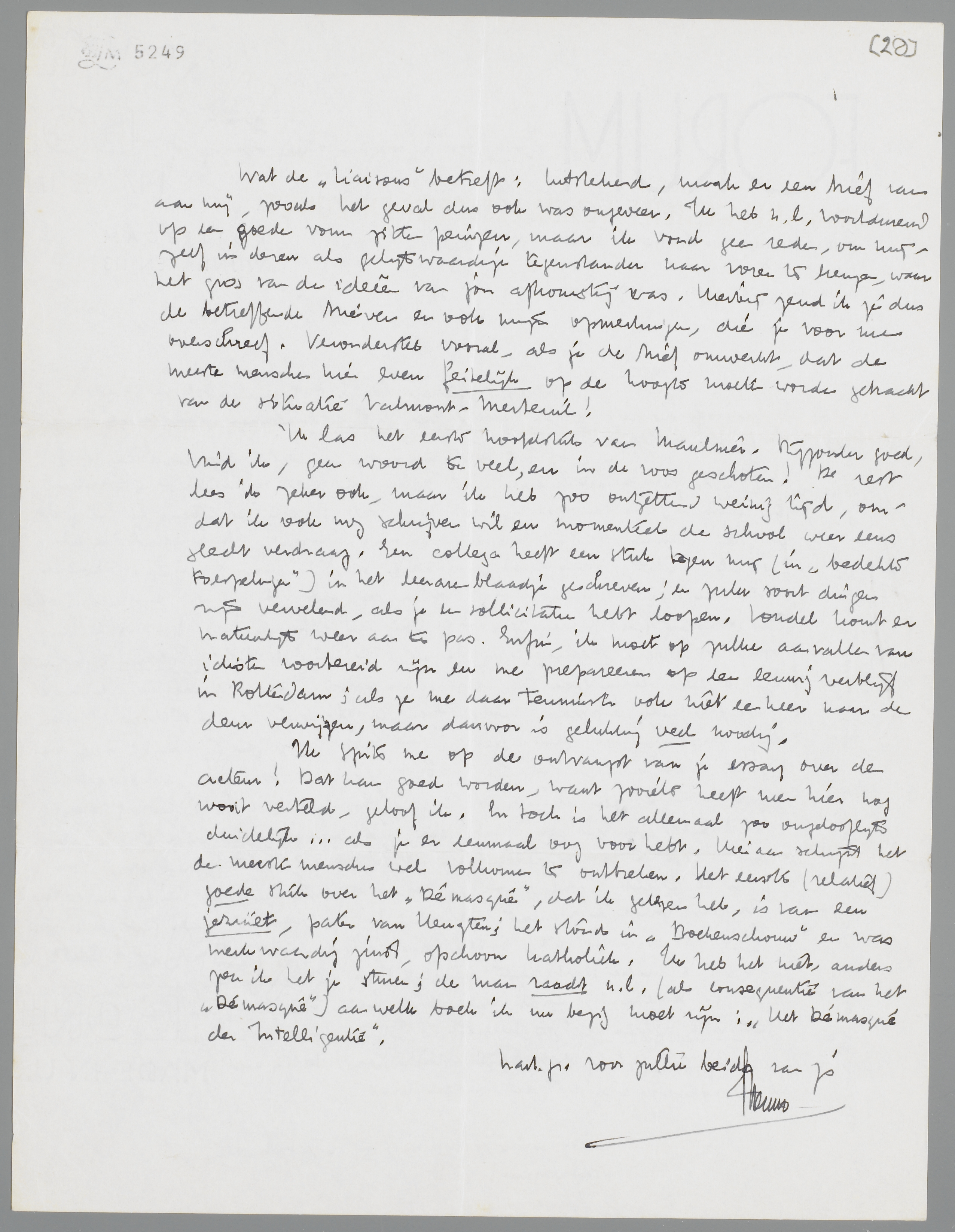 Ik spits me op de ontvangst van je essay over den acteur! Dat kan goed worden, want zooiets heeft men hier nog nooit verteld, geloof ik. En toch is het allemaal zoo ongelooflijk duidelijk... als je er eenmaal oog voor hebt. Hieraan schijnt het de meeste menschen wel volkomen te ontbreken. Het eerste (relatief) goede stuk over het Démasqué, dat ik gelezen heb, is van een jezuïet, pater van Heugten; het stond in Boekenschouw en was merkwaardig juist, ofschoon katholiek. Ik heb het niet, anders zou ik het je sturen; de man raadt n.l. (als consequentie van het Démasqué) aan welk boek ik nu bezig moet zijn: Het Démasqué der Intelligentie.