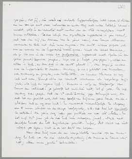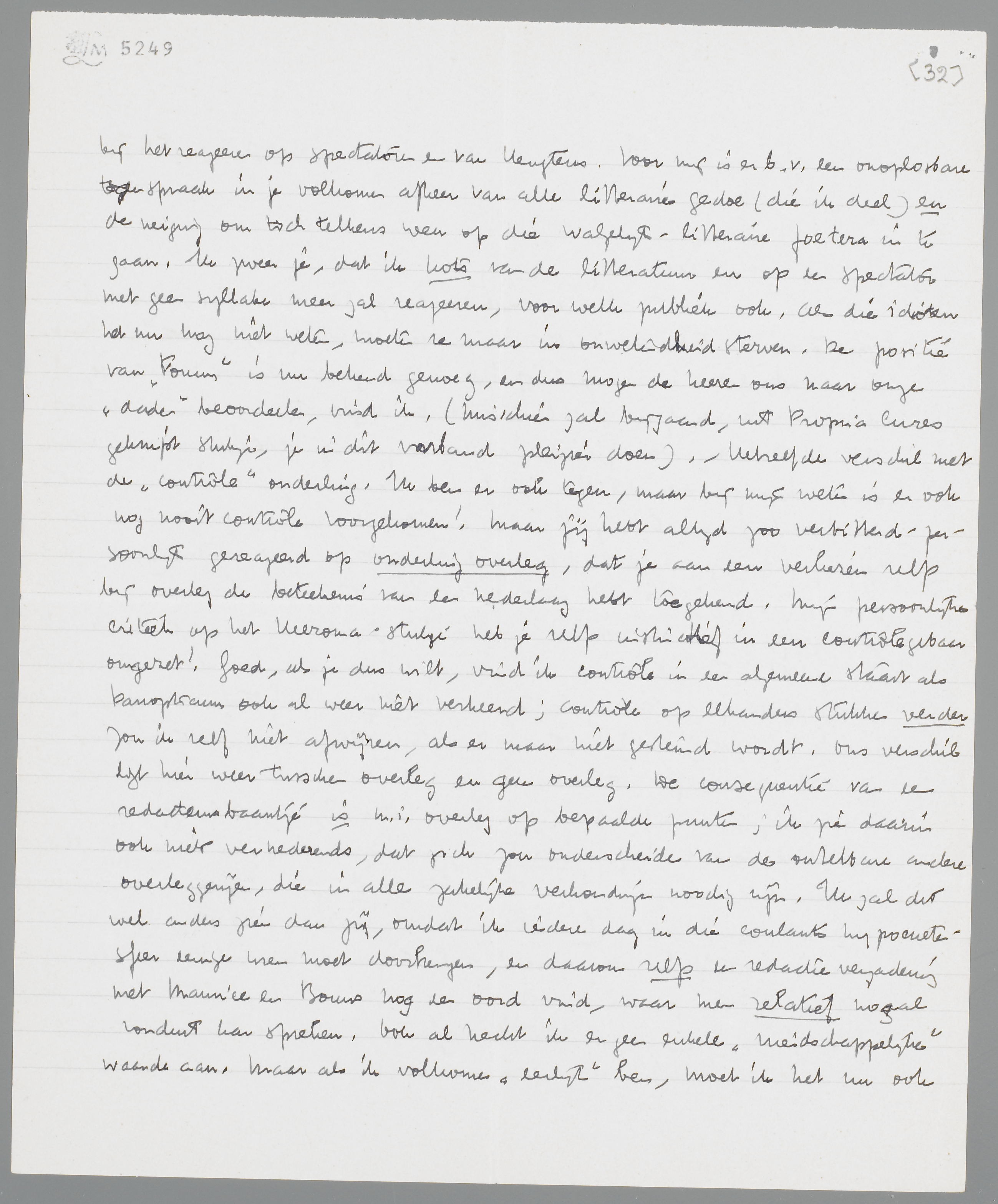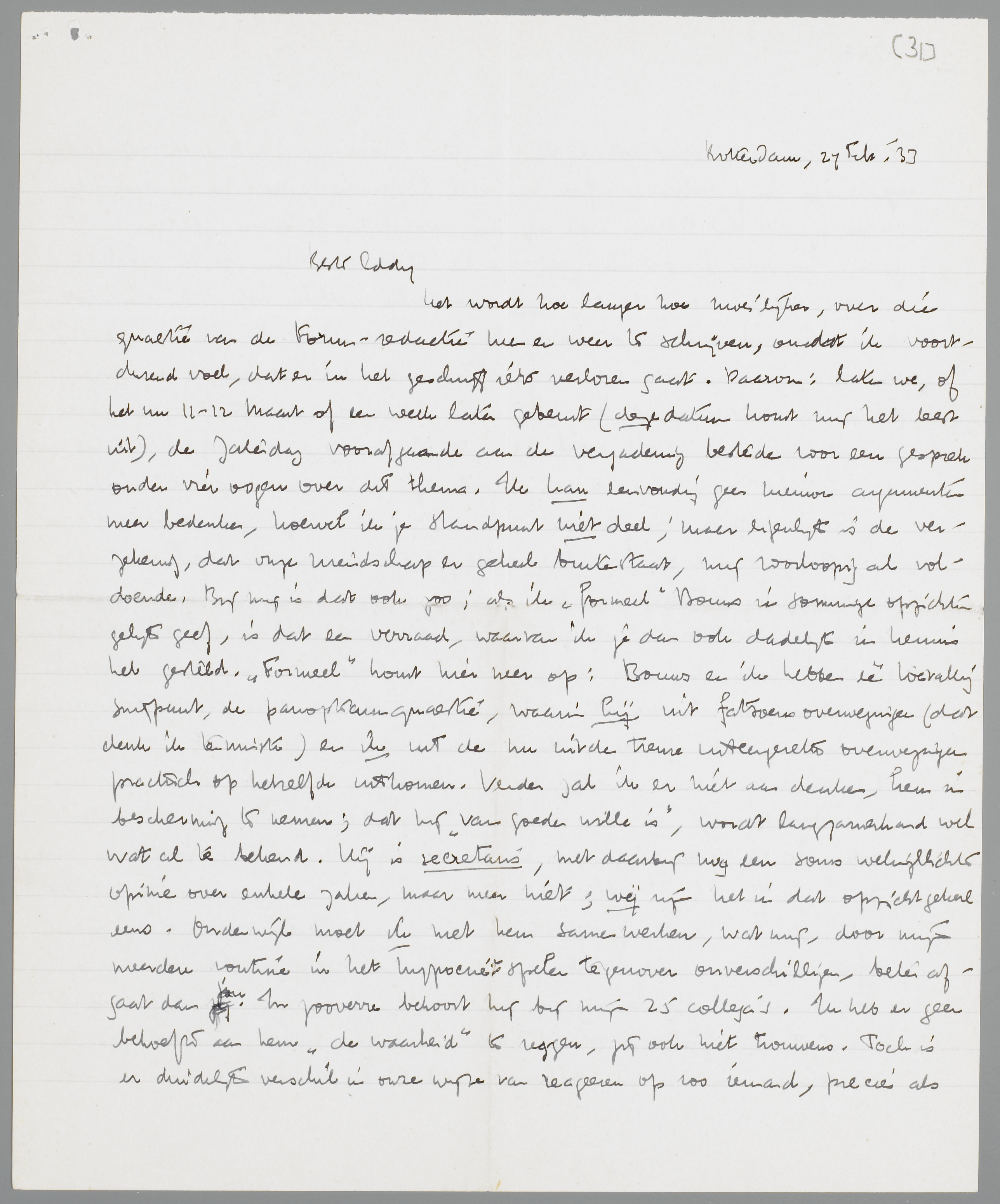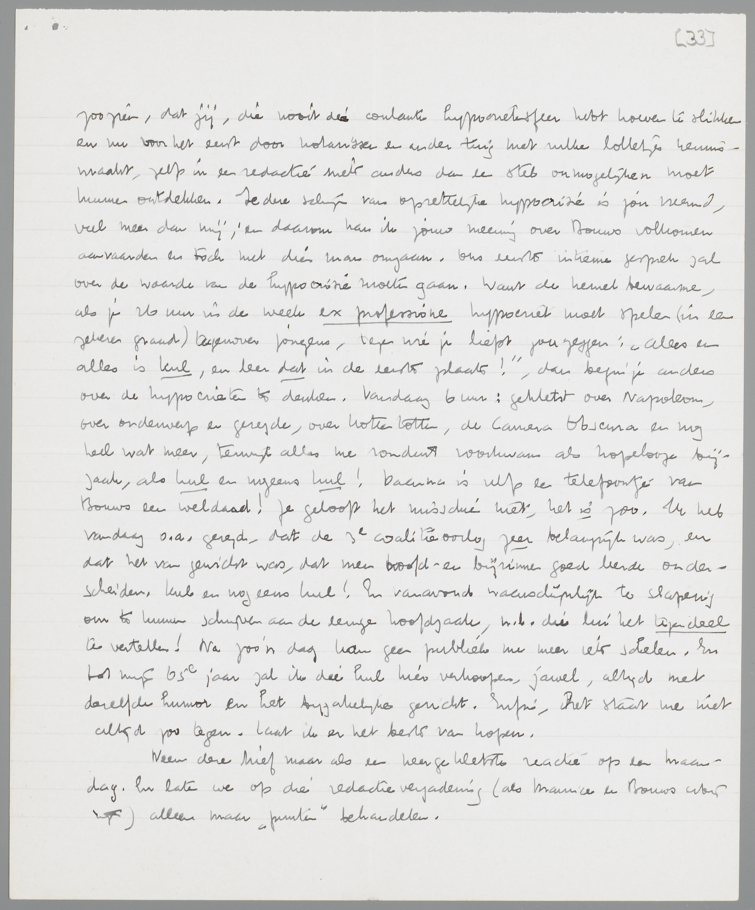 Het wordt hoe langer hoe moeilijker, over die quaestie van de Forum-redactie heen en weer te schrijven, omdat ik voortdurend voel, dat er in het geschrijf iets verloren gaat. Daarom: laten we, of het nu 11-12 Maart of een week later gebeurt (deze datum komt mij het best uit), de Zaterdag voorafgaande aan de vergadering besteden voor een gesprek onder vier oogen over dit thema. Ik kan eenvoudig geen nieuwe argumenten meer bedenken, hoewel ik je standpunt niet deel; maar eigenlijk is de verzekering, dat onze vriendschap er geheel buitenstaat, mij voorloopig al voldoende. Bij mij is dat ook zoo; als ik ‘formeel’ Bouws in sommige opzichten gelijk geef, is dat een verraad, waarvan ik je dan ook dadelijk in kennis heb gesteld. ‘Formeel’ komt hier neer op: Bouws en ik hebben één toevallig snijpunt, de panopticumquaestie, waarin hij uit fatsoensoverwegingen (dat denk ik tenminste) en ik uit de nu uit den treure uiteengezette overwegingen practisch op hetzelfde uitkomen. Verder zal ik er niet aan denken, hem in bescherming te nemen; dat hij ‘van goeden wille is’, wordt langzamerhand wel wat al te bekend. Hij is secretaris, met daarbij nog een soms welingelichte opinie over enkele zaken, maar meer niet; wij zijn het in dat opzicht geheel eens. Onderwijl moet ik met hem samenwerken, wat mij, door mijn meerdere routine in het hypocriet spelen tegenover onverschilligen, beter afgaat dan jou. In zooverre behoort hij bij mijn 25 collega's. Ik heb er geen behoefte aan hem ‘de waarheid’ te zeggen, jij ook niet trouwens. Toch is er duidelijk verschil in onze wijze van reageeren op zoo iemand, precies als bij het reageeren op spectatoren en van Heugtens. Voor mij is er b.v. een onoplosbare tegenspraak in je volkomen afkeer van alle litteraire gedoe (die ik deel) en de neiging om toch telkens weer op die walgelijk-litteraire foetera in te gaan. Ik zweer je, dat ik kots van de litteratuur en op een spectator met geen syllabe meer zal reageeren, voor welk publiek ook. Als die idioten het nu nog niet weten, moeten ze maar in onwetendheid sterven. De positie van Forum is nu bekend genoeg, en dus mogen de heeren ons naar onze ‘daden’ beoordelen, vind ik. (Misschien zal bijgaand, uit Propria Cures geknipt stukje, je in dit verband pleizier doen). - Hetzelfde verschil met de ‘contrôle’ onderling. Ik ben er ook tegen, maar bij mijn weten is er ook nog nooit contrôle voorgekomen! Maar jij hebt altijd zoo verbitterd-persoonlijk gereageerd op onderling overleg, dat je aan een verliezen zelfs bij overleg de beteekenis van een nederlaag hebt toegekend. Mijn persoonlijke critiek op het Heeroma-stukje heb je zelfs instinctief in een contròlegebaar omgezet! Goed, als je dus wilt, vind ik contrôle in een algemeene staart als Panopticum ook al weer niet verkeerd; contrôle op elkanders stukken verder zou ik zelf niet afwijzen, als er maar niet gestemd wordt. Ons verschil ligt hier weer tusschen overleg en geen overleg. De consequentie van een redacteursbaantje is m.i. overleg op bepaalde punten; ik zie daarin ook niets vernederends, dat zich zou onderscheiden van de ontelbare andere overleggerijen, die in alle zakelijke verhoudingen noodig zijn. Ik zal dit wel anders zien dan jij, omdat ik iedere dag in die coulante hypocrietensfeer eenige uren moet doorbrengen, en daarom zelfs een redactievergadering met Maurice en Bouws nog een oord vind, waar men relatief nogal ronduit kan spreken. Ook al hecht ik er geen enkele ‘vriendschappelijke’ waarde aan. Maar als ik volkomen ‘eerlijk’ ben, moet ik het nu ook zoo zien, dat jij, die nooit die coulante hypocrietensfeer hebt hoeven te slikken en nu voor het eerst door notarissen en ander tuig met zulke lolletjes kennismaakt, zelfs in een redactie niets anders dan een stel onmogelijken moet kunnen ontdekken. Iedere schijn van opzettelijke hypocrisie is jou vreemd, veel meer dan mij; en daarom kan ik jouw meening over Bouws volkomen aanvaarden en toch met dien man omgaan. Ons eerste intieme gesprek zal over de waarde van de hypocrisie moeten gaan. Want de hemel bewaarme, als je 26 uur in de week ex professione hypocriet moet spelen (in een zekere graad) tegenover jongens, tegen wie je liefst zou zeggen: ‘Alles en alles is kul, en leer dat in de eerste plaats!’, dan begin je anders over de hypocrieten te denken. Vandaag 6 uur: gekletst over Napoleon, over onderwerp en gezegde, over Hottentotten, de Camera Obscura en nog heel wat meer, terwijl alles me ronduit voorkwam als hopelooze bijzaak, als kul en nogeens kul! Daarna is zelfs een telefoontje van Bouws een weldaad! Je gelooft het misschien niet, het is zoo. Ik heb vandaag o.a. gezegd, dat de 3e coalitieoorlog zeer belangrijk was, en dat het van gewicht was, dat men hoofd - en bijzinnen goed leerde onderscheiden. Kul en nog eens kul! En vanavond waarschijnlijk te slaperig om te kunnen schrijven aan de eenige hoofdzaak, n.l. die lui het tegendeel te vertellen! Na zoo'n dag kan geen publiek me meer iets schelen. En tot mijn 65e jaar zal ik die kul hier verkoopen, jawel, altijd met dezelfde humor en het bijzakelijke gezicht. Enfin, het staat me niet altijd zoo tegen. Laat ik er het beste van hopen. Neem deze brief maar als een neergekletste reactie op een Maandag. En laten we op die redactievergadering (als Maurice en Bouws erbij zijn) alleen maar ‘punten’ behandelen.