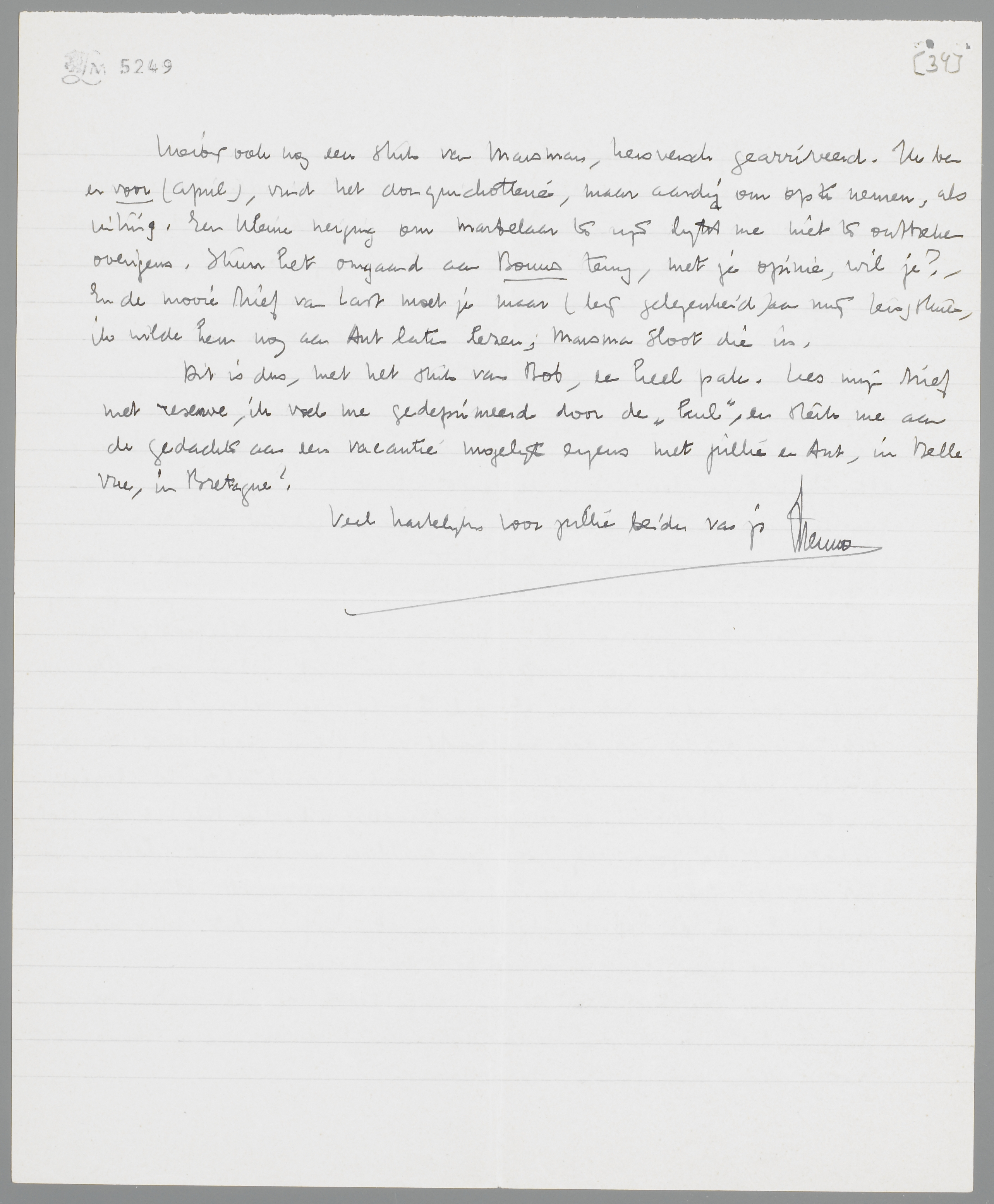 Dit is dus, met het stuk van Bob, een heel pak. Lees mijn brief met reserve, ik voel me gedeprimeerd door de ‘kul’, en sterk me aan de gedachte aan een vacantie mogelijk ergens met jullie en Ant, in Bellevue, in Bretagne?