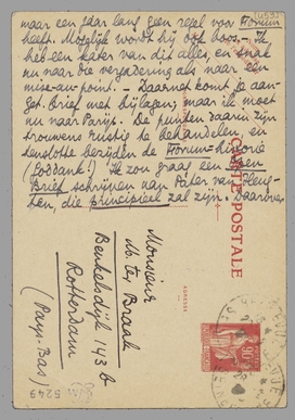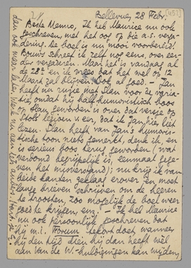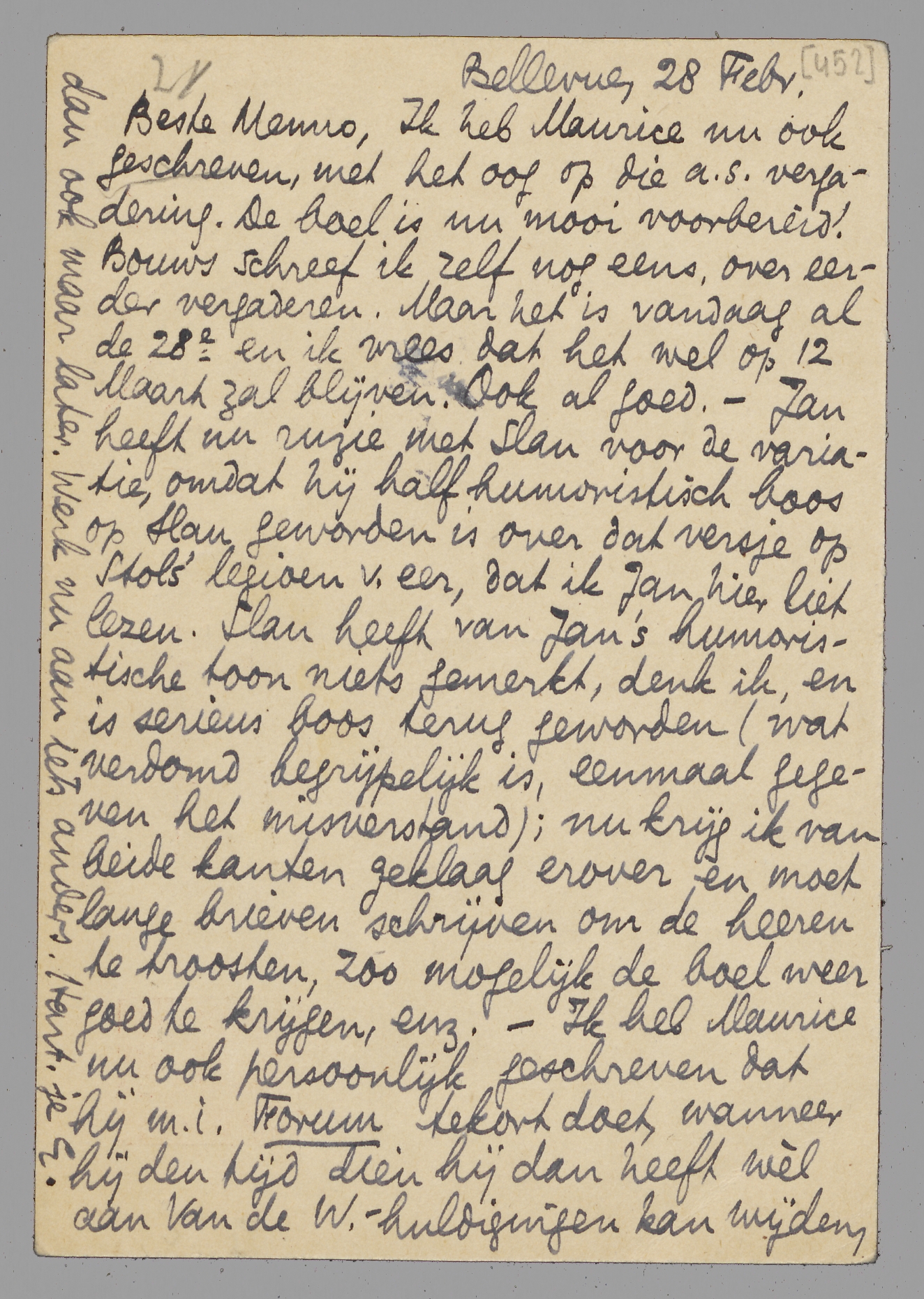 Ik heb Maurice nu ook geschreven, met het oog op die a.s. vergadering. De boel is nu mooi voorbereid! Bouws schreef ik zelf nog eens, over eerder vergaderen. Maar het is vandaag al de 28e en ik vrees dat het wel op 12 Maart zal blijven. Ook al goed. - Jan heeft nu ruzie met Slau voor de variatie, omdat hij half humoristisch boos op Slau geworden is over dat versje op Stols' legioen v. eer, dat ik Jan hier liet lezen. Slau heeft van Jan's humoristische toon niets gemerkt, denk ik, en is serieus boos geworden (wat verdomd begrijpelijk is, eenmaal gegeven het misverstand); nu krijg ik van beide kanten geklaag erover en moet lange brieven schrijven om de heeren te troosten, zoo mogelijk de boel weer goed te krijgen, enz. - Ik heb Maurice nu ook persoonlijk geschreven dat hij m.i. Forum tekort doet, wanneer hij den tijd dien hij heeft wèl aan Van de W.-huldigingen kan wijden, maar een jaar lang geen regel voor Forum heeft. Mogelijk wordt hij ook boos. - Ik heb een kater van dit alles, en snak nu naar die vergadering als naar een mise-au-point. - Daarnet komt je aanget. brief met bijlagen; maar ik moet nu naar Parijs. De punten daarin zijn trouwens rustig te behandelen, en tenslotte bezijden de Forum-historie. (Goddank!) Ik zou graag een Open Brief schrijven aan Pater van Heugten, die principieel zal zijn. Daarover dan ook maar later. Werk nu aan iets anders.