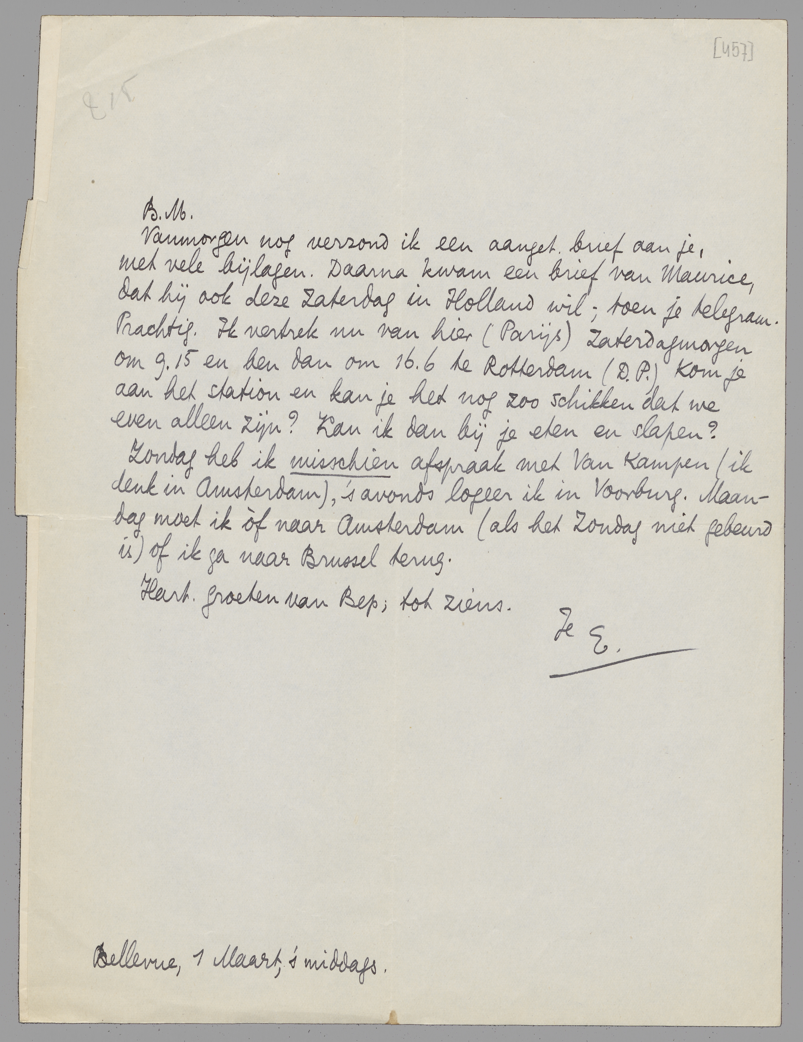 Vanmorgen nog verzond ik een aanget. brief aan je, met vele bijlagen. Daarna kwam een brief van Maurice, dat hij ook deze Zaterdag in Holland wil; toen je telegram. Prachtig. Ik vertrek nu van hier (Parijs) Zaterdagmorgen om 9.15 en ben dan om 16.6 te Rotterdam (D.P.) Kom je aan het station en kan je het nog zoo schikken dat we even alleen zijn? Kan ik dan bij je eten en slapen?