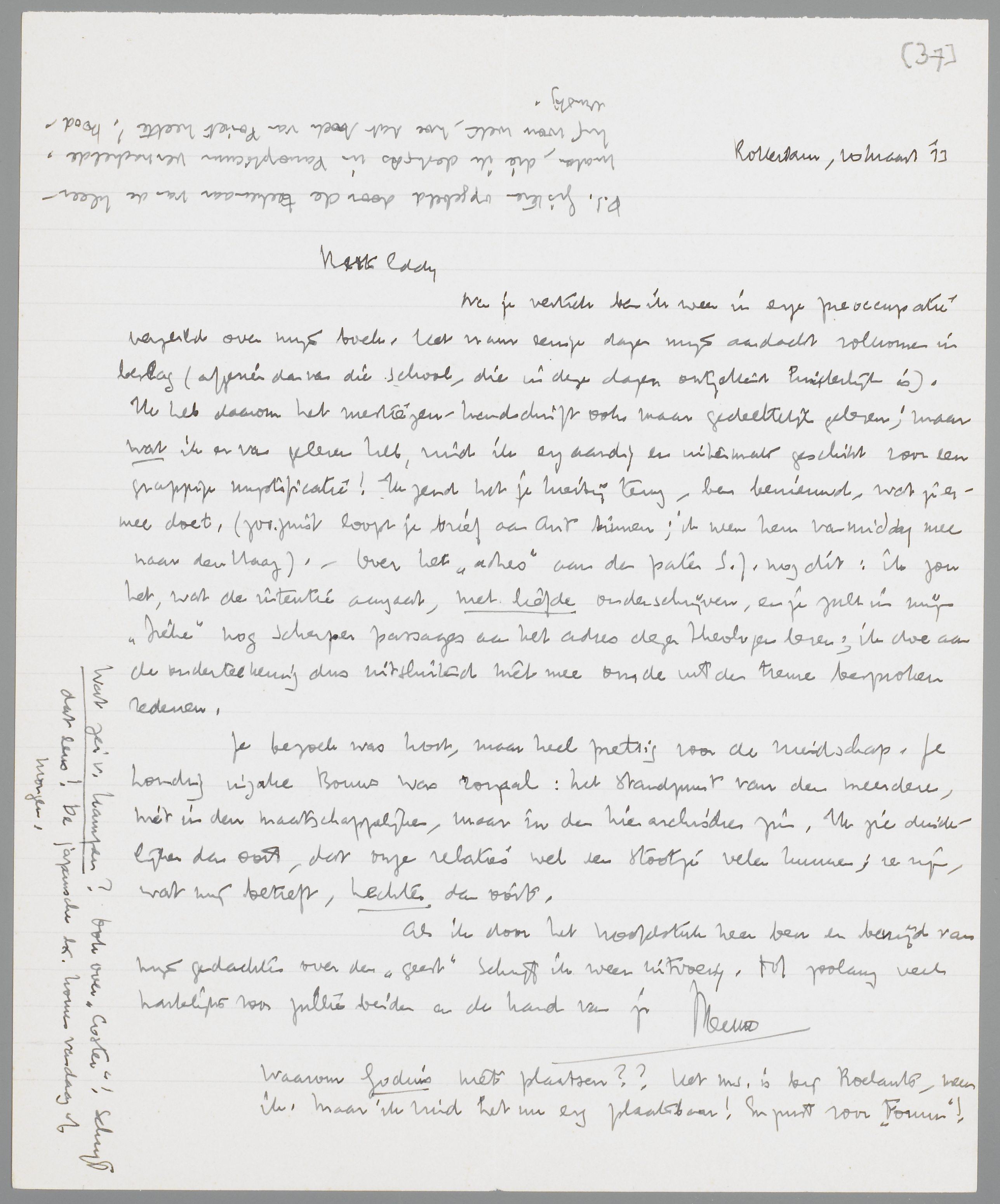 Na je vertrek ben ik weer in erge preoccupatie verzeild over mijn boek. Het nam eenige dagen mijn aandacht volkomen in beslag (afgezien dan van die school, die in deze dagen ontzettend hinderlijk is). Ik heb daarom het mestiezen-handschrift ook maar gedeeltelijk gelezen; maar wat ik er van gelezen heb, vind ik erg aardig en uitermate geschikt voor een mystificatie! Ik zend het je hierbij terug, ben benieuwd, wat je ermee doet. (zoojuist loopt je brief aan Ant binnen; ik neem hem vanmiddag mee naar den Haag). - Over het ‘adres’ aan den pater S.J. nog dit: ik zou het, wat de intentie aangaat, met liefde onderschrijven, en je zult in mijn Zieke nog scherper passages aan het adres dezer theologen lezen; ik doe aan de onderteekening dus uitsluitend niet mee om de uit den treure besproken redenen.