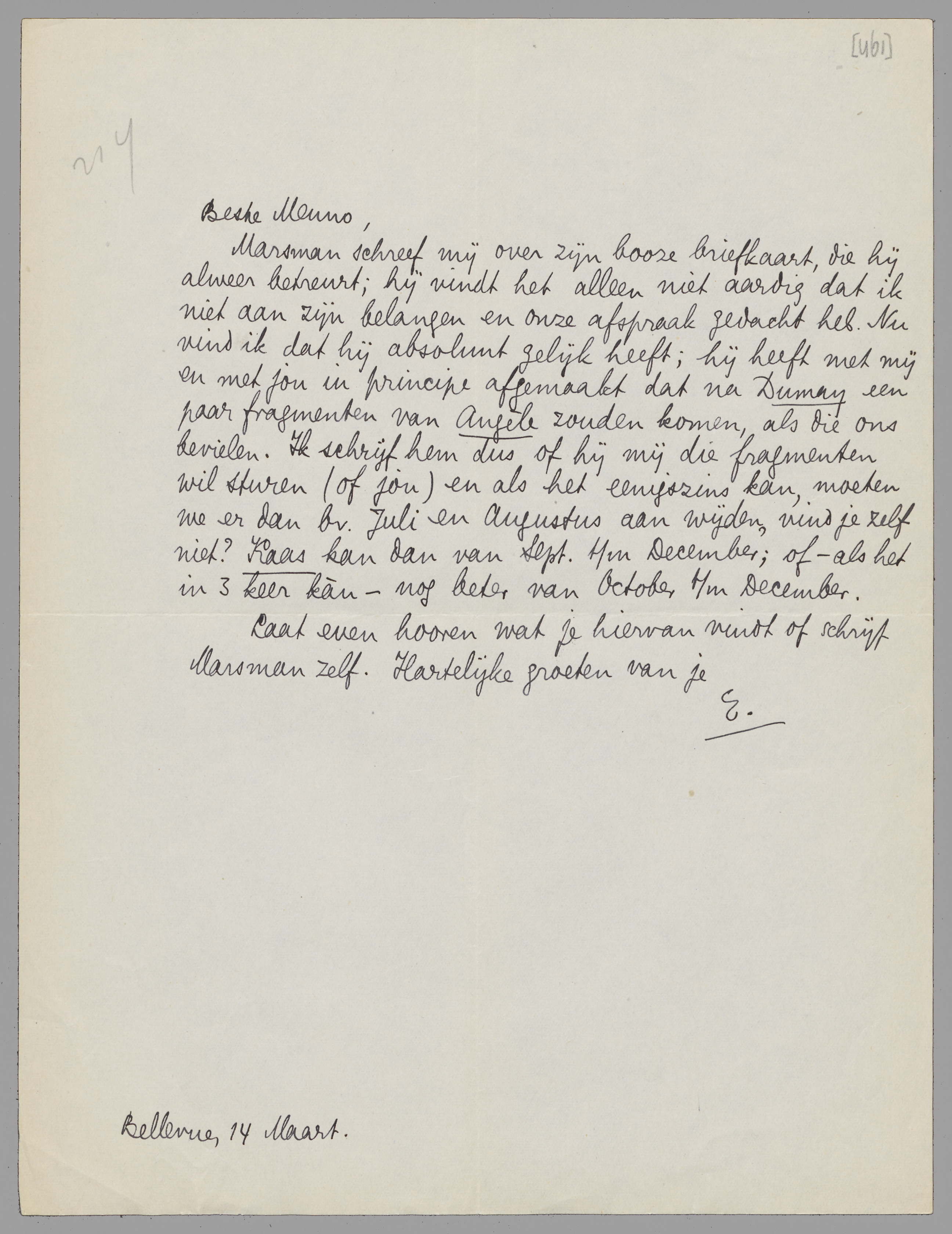 Marsman schreef mij over zijn booze briefkaart, die hij alweer betreurt; hij vindt het alleen niet aardig dat ik niet aan zijn belangen en onze afspraak gedacht heb. Nu vind ik dat hij absoluut gelijk heeft; hij heeft met mij en met jou in principe afgemaakt dat na Dumay een paar fragmenten van Angèle zouden komen, als die ons bevielen. Ik schrijf hem dus of hij mij die fragmenten wil sturen (of jou) en als het eenigszins kan, moeten we er dan bv. Juli en Augustus aan wijden, vind je zelf niet? Kaas kan dan van Sept. t/m December; of - als het in 3 keer kàn - nog beter van October t/m December.