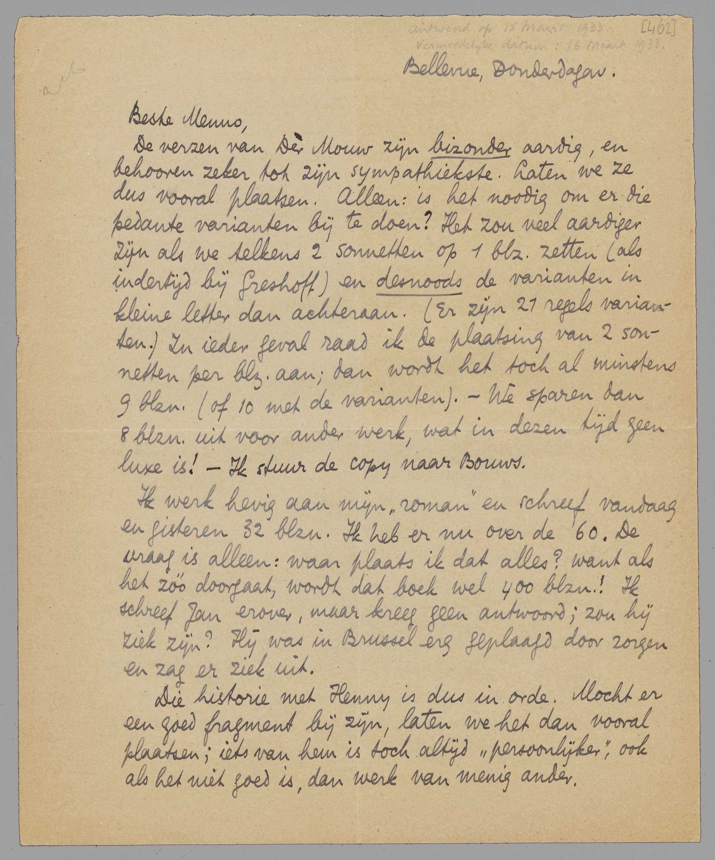 De verzen van Der Mouw zijn bizonder aardig, en behooren zeker tot zijn sympathiekste. Laten we ze dus vooral plaatsen. Alleen: is het noodig om er die pedante varianten bij te doen? Het zou veel aardiger zijn als we telkens 2 sonnetten op 1 blz. zetten (als indertijd Greshoff) en desnoods de varianten in kleine letter dan achteraan. (Er zijn 21 regels varianten.). In ieder geval raad ik de plaatsing van 2 sonnetten per blz. aan; dan wordt het toch al minstens 9 blzn. (of 10 met de varianten). - We sparen dan 8 blzn. uit voor ander werk, wat in dezen tijd geen luxe is! - Ik stuur de copy naar Bouws.