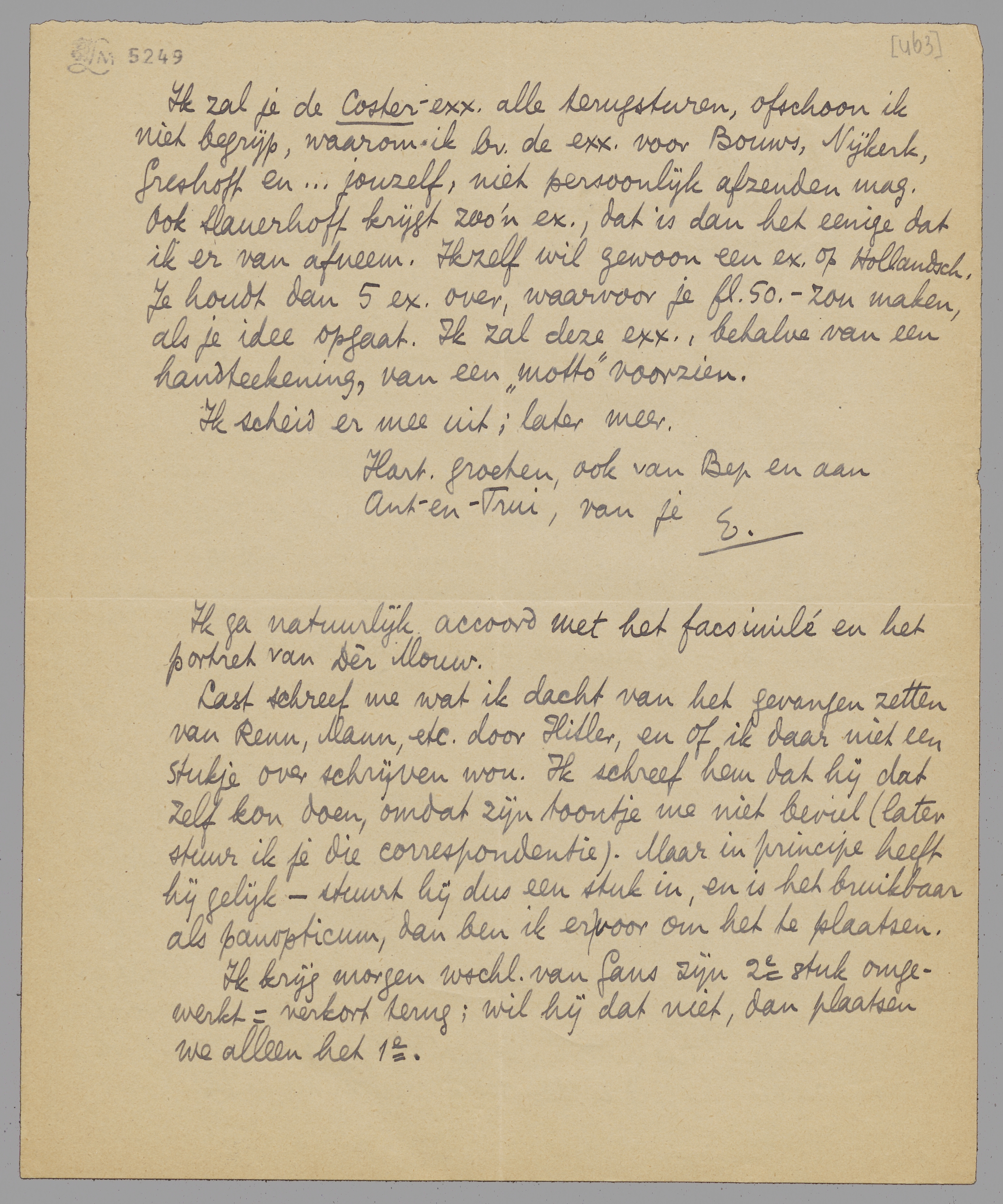 Ik zal je de Coster-exx. alle terugsturen, ofschoon ik niet begrijp, waarom ik bv. de exx. voor Bouws, Nijkerk, Greshoff en... jouzelf, niet persoonlijk afzenden mag. Ook Slauerhoff krijgt zoo'n ex., dat is dan het eenige dat ik er van afneem. Ikzelf wil gewoon een ex. op Hollandsch. Je houdt dan 5 ex. over, waarvoor je fl. 50,- zou maken, als je idee opgaat. Ik zal deze exx., behalve van een handteekening, van een ‘motto’ voorzien.