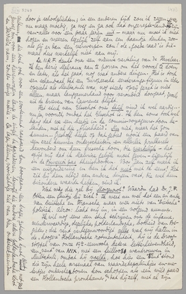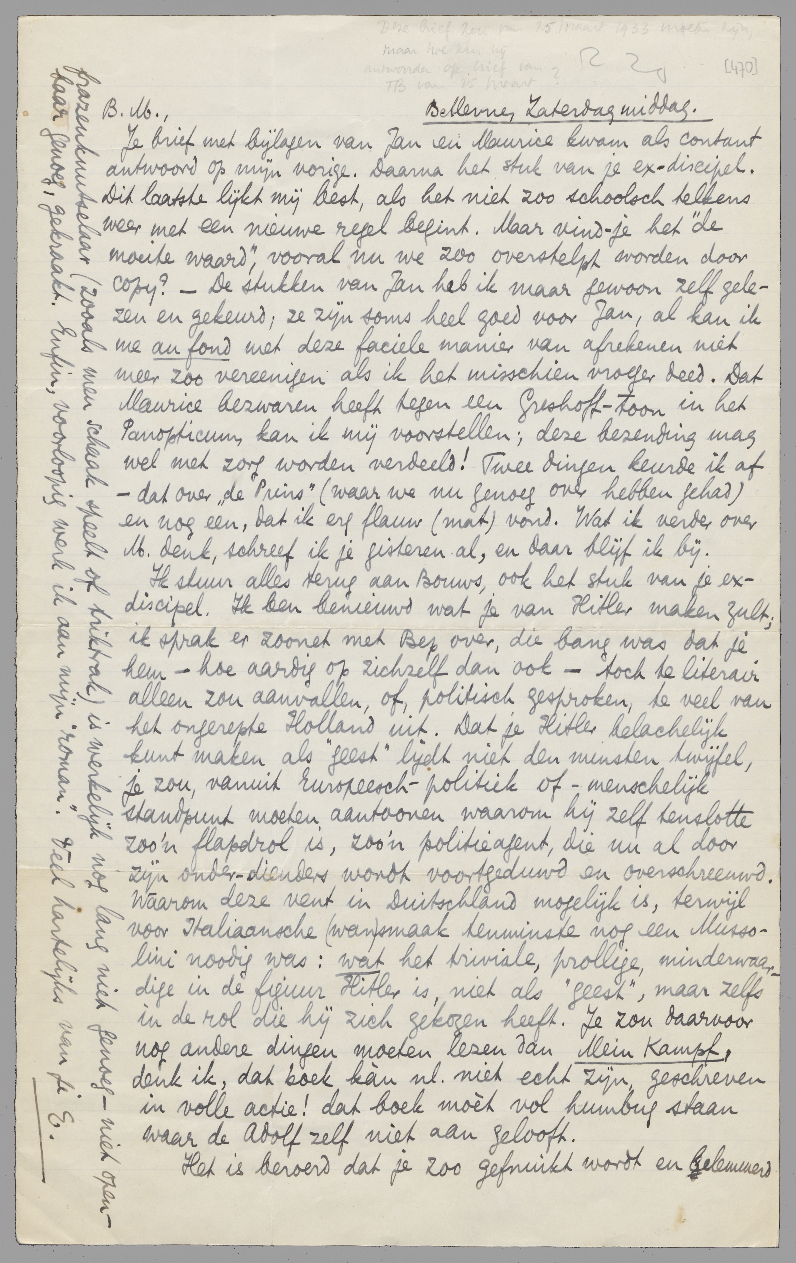 Je brief met bijlagen van Jan en Maurice kwam als contant antwoord op mijn vorige. Daarna het stuk van je ex-discipel. Dit laatste lijkt mij best, als het niet zoo schoolsch telkens weer met een nieuwe regel begint. Maar vind-je het ‘de moeite waard’, vooral nu we zoo overstelpt worden door copy? - De stukken van Jan heb ik maar gewoon zelf gelezen en gekeurd; ze zijn soms heel goed voor Jan, al kan ik me au fond met deze faciele manier van afrekenen niet meer zoo vereenigen als ik het misschien vroeger deed. Dat Maurice bezwaren heeft tegen een Greshoff-toon in het Panopticum, kan ik mij voorstellen; deze bezending mag wel met zorg worden verdeeld! Twee dingen keurde ik af - dat over ‘de Prins’ (waar we nu genoeg over hebben gehad) en nog een, dat ik erg flauw (mat) vond. Wat ik verder over M. denk, schreef ik je gisteren al, en daar blijf ik bij. Ik stuur alles terug aan Bouws, ook het stuk van je ex-discipel. Ik ben benieuwd wat je van Hitler maken zult; ik sprak er zoonet met Bep over, die bang was dat je hem - hoe aardig op zichzelf dan ook - toch te literair alleen zou aanvallen, of, politisch gesproken, te veel van het ongerepte Holland uit. Dat je Hitler belachelijk kunt maken als ‘geest’ lijdt niet den minsten twijfel, je zou, vanuit Europeesch-politiek of- menschelijk standpunt moeten aantoonen waarom hij zelf tenslotte zoo'n flapdrol is, zoo'n politieagent, die nu al door zijn onder-dienders wordt voortgeduwd en overschreeuwd. Waarom deze vent in Duitschland mogelijk is, terwijl voor Italiaansche (wan)smaak tenminste nog een Mussolini noodig was: wat het triviale, prollige, minderwaardige in de figuur Hitler is, niet als ‘geest’, maar zelfs in de rol die hij zich gekozen heeft. Je zou daarvoor nog andere dingen moeten lezen dan Mein Kampf, denk ik, dat boek kàn n.l. niet echt zijn, geschreven in volle actie! dat boek moèt vol humbug staan waar de Adolf zelf niet aan gelooft.