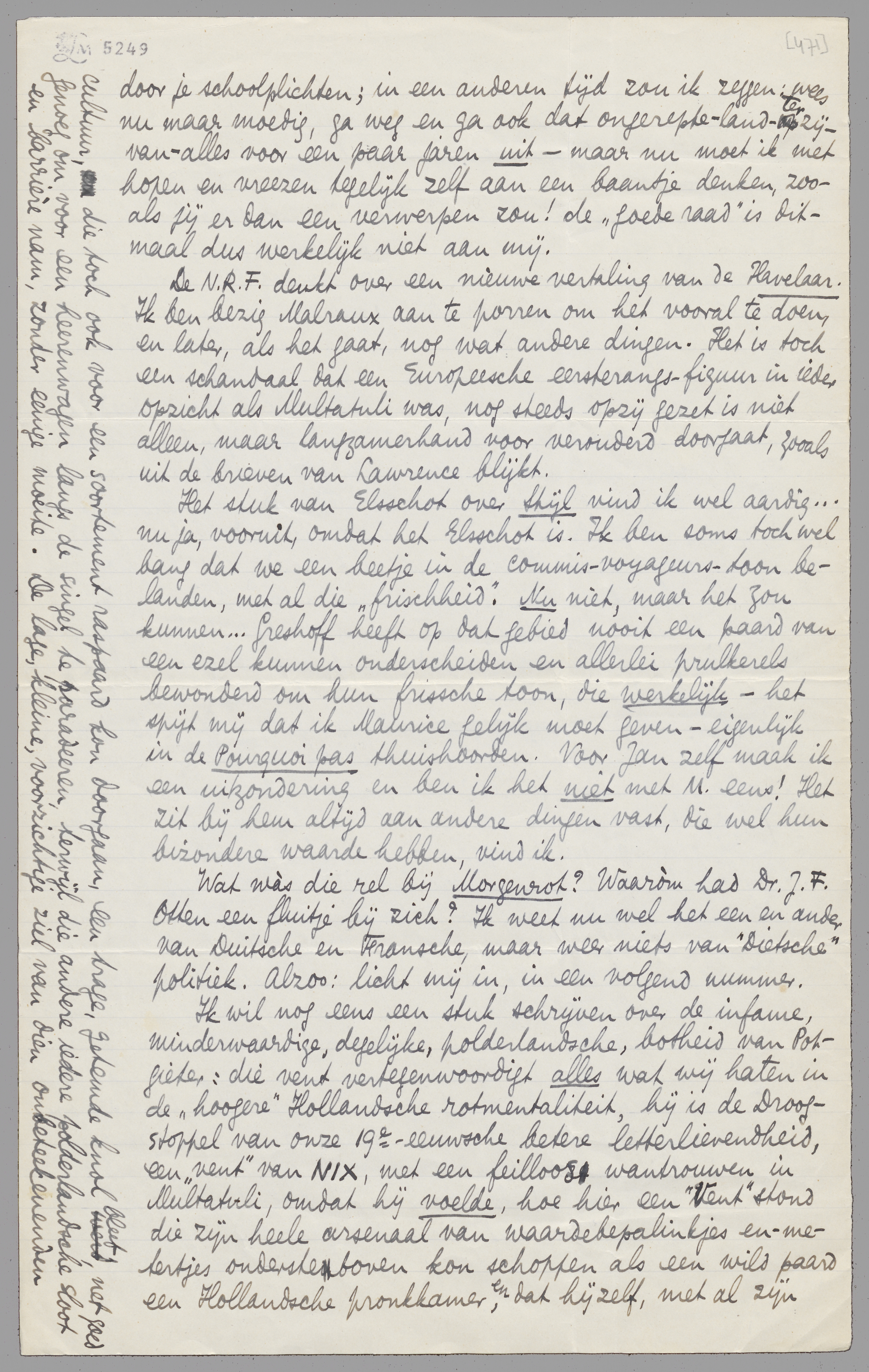 De N.R.F. denkt over een nieuwe vertaling van de Havelaar. Ik ben bezig Malraux aan te porren om het vooral te doen, en later, als het gaat, nog wat andere dingen. Het is toch een schandaal dat een Europeesche eersterangs-figuur in ieder opzicht als Multatuli was, nog steeds opzij gezet is niet alleen, maar langzamerhand voor verouderd doorgaat, zooals uit de brieven van Lawrence blijkt.