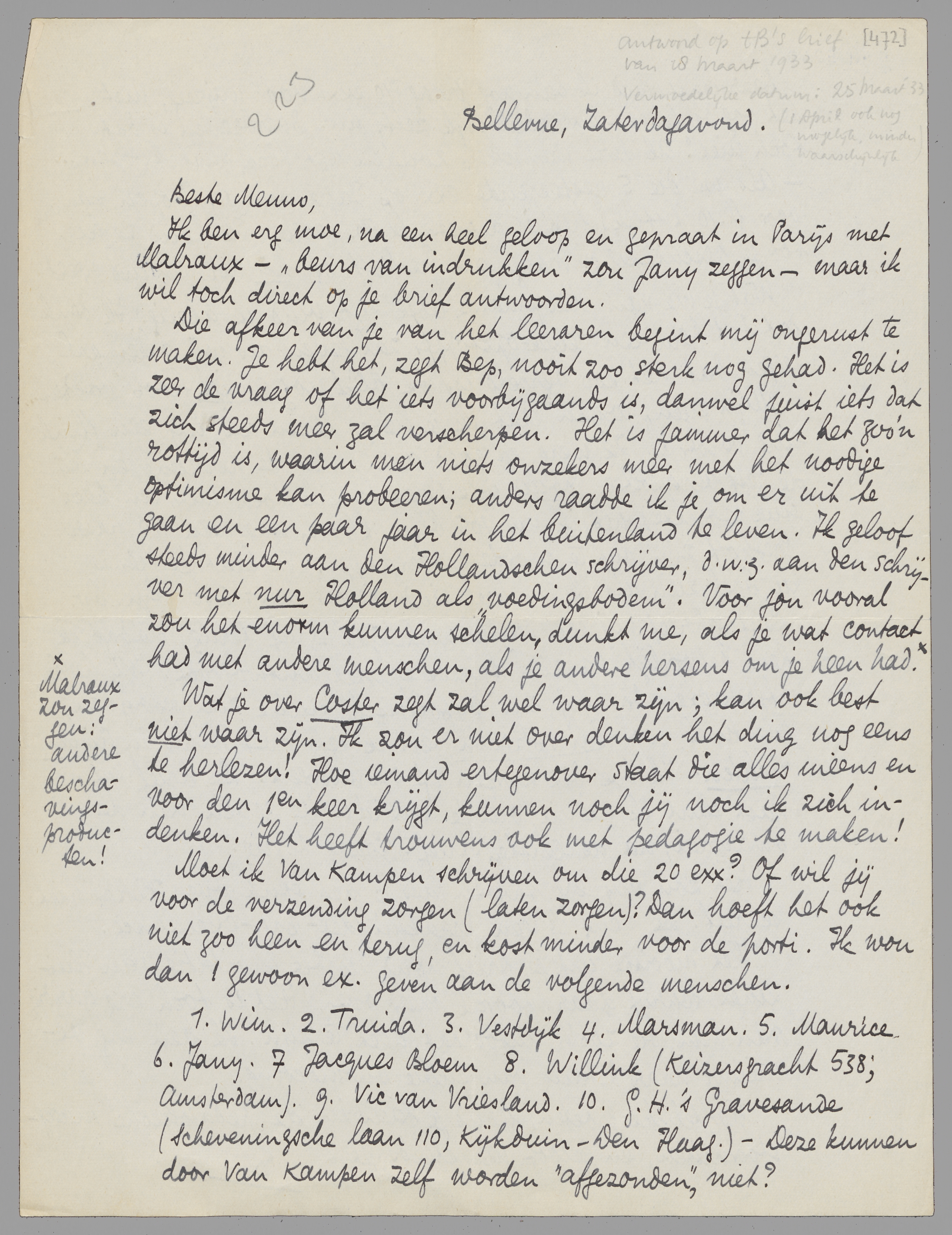 Ik ben erg moe, na een heel geloop en gepraat in Parijs met Malraux - ‘beurs van indrukken’ zou Jany zeggen - maar ik wil toch direct op je brief antwoorden.