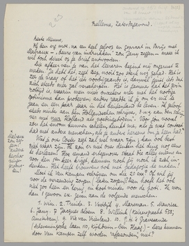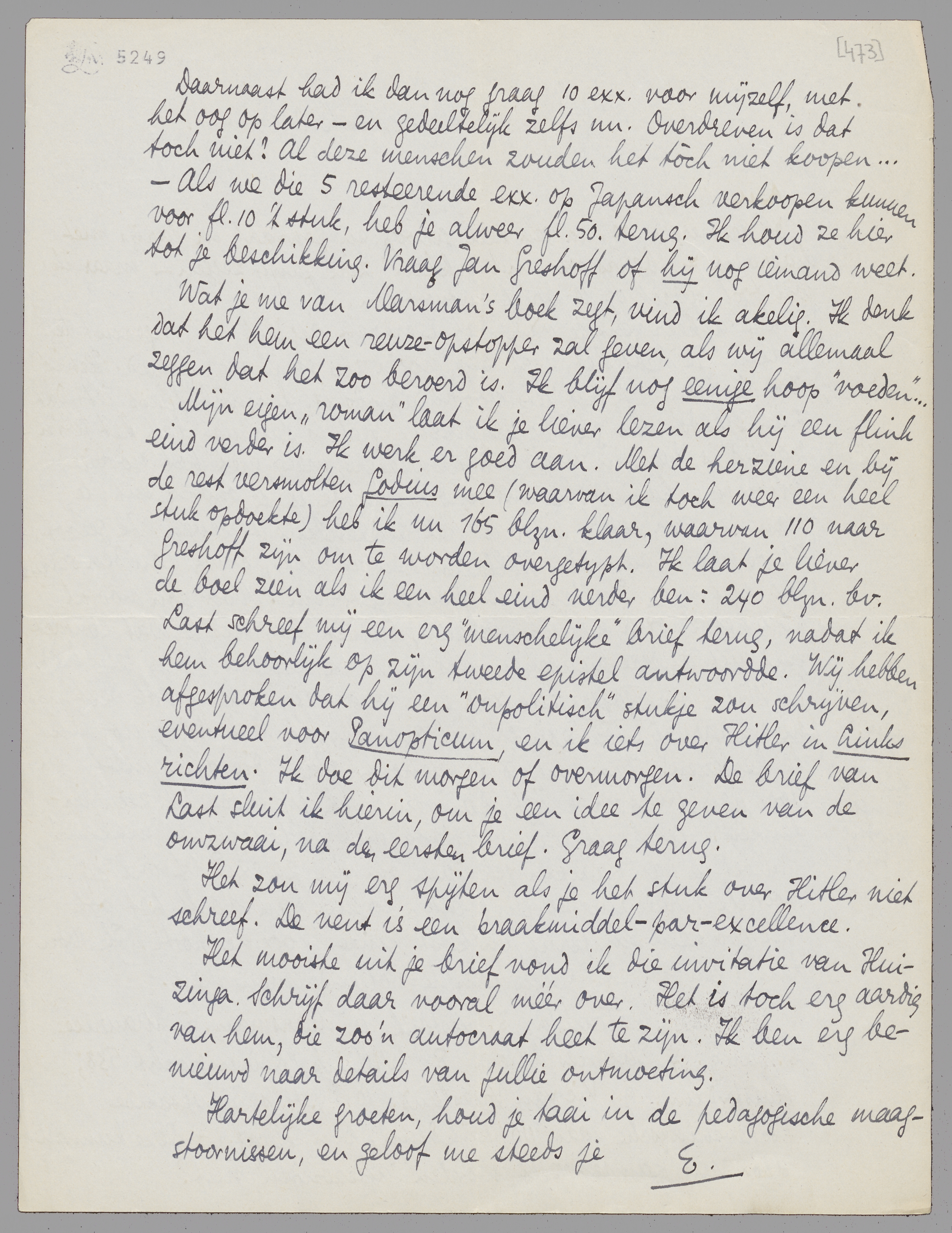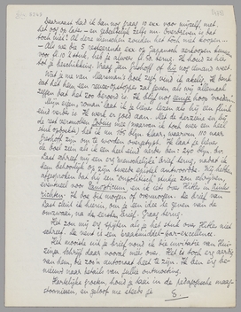 Mijn eigen ‘roman’ laat ik je liever lezen als hij een flink eind verder is. Ik werk er goed aan. Met de herziene en bij de rest versmolten Godius mee (waarvan ik toch weer een heel stuk opdoekte) heb ik nu 165 blzn. klaar, waarvan 110 naar Greshoff zijn om te worden overgetypt. Ik laat je liever de boel zien als ik een heel eind verder ben: 240 blzn. bv. Last schreef mij een erg ‘menschelijke’ brief terug, nadat ik hem behoorlijk op zijn tweede epistel antwoordde. Wij hebben afgesproken dat hij een ‘onpolitisch’ stukje zou schrijven, eventueel voor Panopticum, en ik iets over Hitler in Links richten. Ik doe dit morgen of overmorgen. De brief van Last sluit ik hierin, om je een idee te geven van de omzwaai, na den eersten brief. Graag terug.