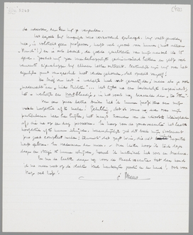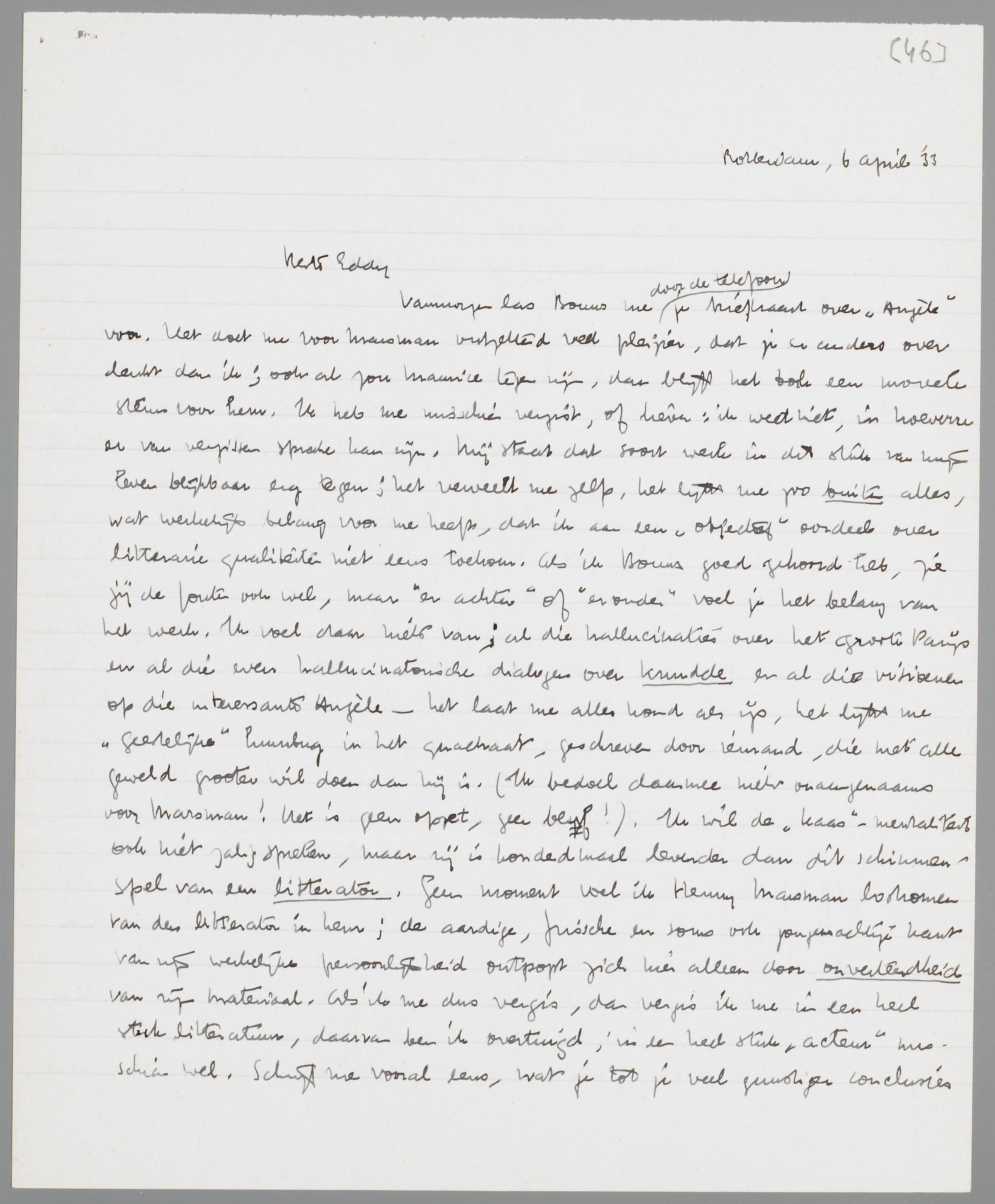 Vanmorgen las Bouws me door de telefoon je briefkaart over Angèle voor. Het doet me voor Marsman ontzettend veel pleizier, dat je er anders over denkt dan ik; ook al zou Maurice tegen zijn, dan blijft het toch een moreele steun voor hem. Ik heb me misschien vergist, of liever: ik weet niet, in hoeverre er van vergissen sprake kan zijn. Mij staat dat soort werk in dit stuk van mijn leven blijkbaar erg tegen; het verveelt me zelfs, het lijkt me zoo buiten alles, wat werkelijk belang voor me heeft, dat ik aan een ‘objectief’ oordeel over litteraire qualiteiten niet eens toekom. Als ik Bouws goed gehoord heb, zie jij de fouten ook wel, maar ‘er achter’ of ‘er onder’ voel je het belang van het werk. Ik voel daar niets van; al die hallucinaties over het groote Parijs en al die even hallucinatorische dialogen over Knudde en al die visioenen op die interessante Angèle - het laat me alles koud als ijs, het lijkt me ‘geestelijke’ humbug in het quadraat, geschreven door iemand, die met alle geweld grooter wil doen dan hij is. (Ik bedoel daarmee niets onaangenaams voor Marsman! Het is geen opzet, geen bluf!). Ik wil de ‘kaas’-mentaliteit ook niet zaligspreken, maar zij is honderdmaal levender dan dit schimmenspel van een litterator. Geen moment voel ik Henny Marsman loskomen van den litterator in hem; de aardige, frissche en soms ook jongensachtige kant van zijn werkelijke persoonlijkheid ontpopt zich hier alleen door onverteerdheid van zijn materiaal. Als ik me dus vergis, dan vergis ik me in een heel stuk litteratuur, daarvan ben ik overtuigd; in een heel stuk ‘acteur’ misschien wel. Schrijf me vooral eens, wat je tot je veel gunstiger conclusies heeft gebracht, welke positieve waarden je tegenover de (toch zeker abominabele) fouten stelt. -