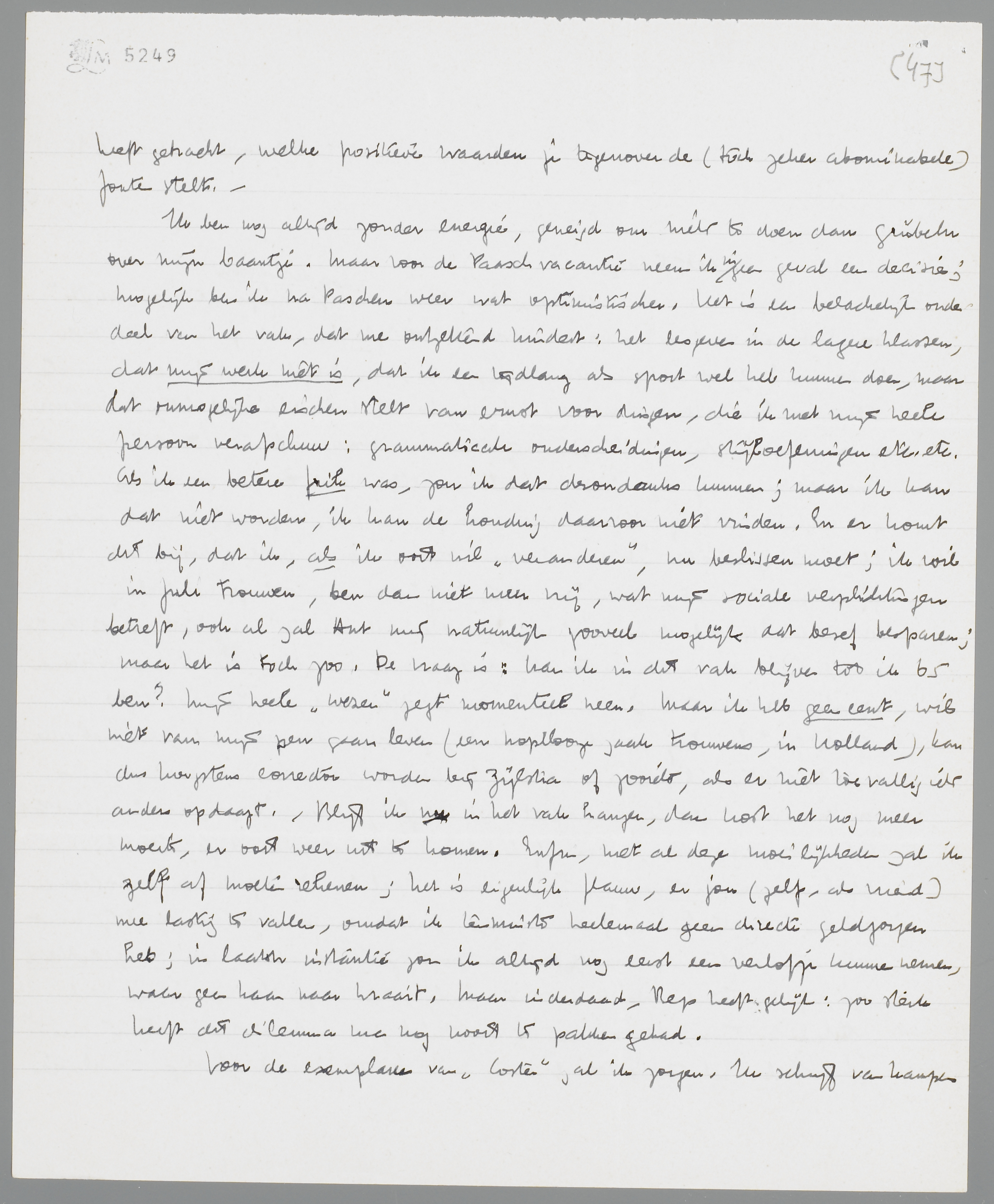 Ik ben nog altijd zonder energie, geneigd om niets te doen dan grübeln over mijn baantje. Maar voor de Paaschvacantie neem ik in geen geval een decisie; mogelijk ben ik na Paschen weer wat optimistischer. Het is een belachelijk onderdeel van het vak, dat me ontzettend hindert: het lesgeven in de lagere klassen, dat mijn werk niet is, dat ik een tijdlang als sport wel heb kunnen doen, maar dat onmogelijke eischen stelt van ernst voor dingen, die ik met mijn heele persoon verafschuw: grammaticale onderscheidingen, stijloefeningen etc, etc. Als ik een betere frik was, zou ik dat desondanks kunnen; maar ik kan dat niet worden, ik kan de houding daarvoor niet vinden. En er komt dit bij, dat ik, als ik ooit wil ‘veranderen’, nu beslissen moet; ik wil in Juli trouwen, ben dan niet meer vrij, wat mijn sociale verplichtingen betreft, ook al zal Ant mij natuurlijk zooveel mogelijk dat besef besparen; maar het is toch zoo. De vraag is: kan ik in dit vak blijven tot ik 65 ben? Mijn heele ‘wezen’ zegt momenteel neen. Maar ik heb geen cent, wil niet van mijn pen gaan leven (een hopelooze zaak trouwens, in Holland), kan dus hoogstens corrector worden bij Zijlstra of zooiets, als er niet toevallig iets anders opdaagt. - Blijf ik nu in het vak hangen, dan kost het nog meer moeite, er ooit weer uit te komen. Enfin, met al deze moeilijkheden zal ik zelf af moeten rekenen; het is eigenlijk flauw, er jou (zelfs, als vriend) mee lastig te vallen, omdat ik tenminste heelemaal geen directe geldzorgen heb; in laatste instantie zou ik altijd nog eerst een verlofje kunnen nemen, waar geen haan naar kraait. Maar inderdaad, Bep heeft gelijk: zoo sterk heeft dit dilemma me nog nooit te pakken gehad.