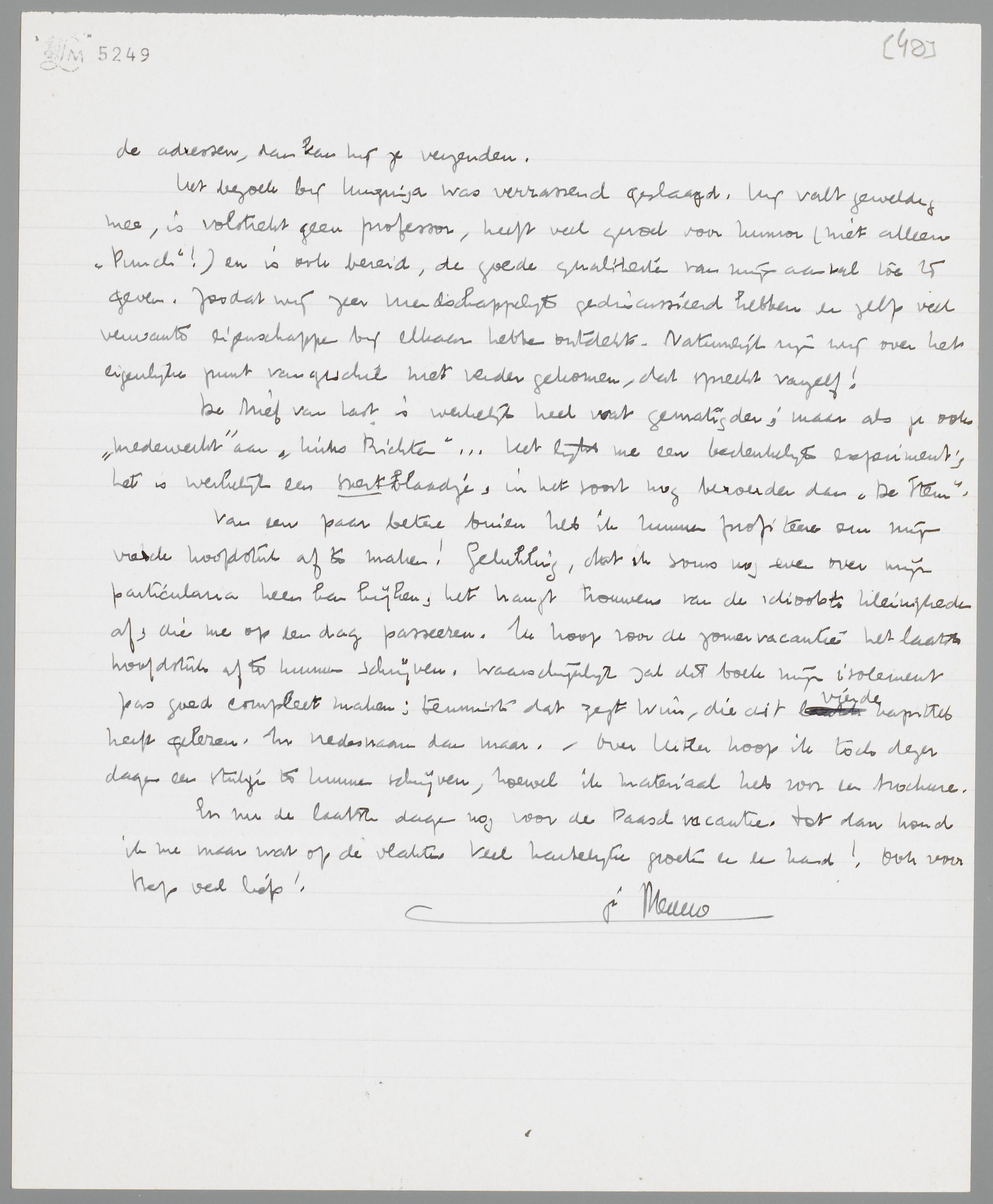 Het bezoek bij Huizinga was verrassend geslaagd. Hij valt geweldig mee, is volstrekt geen professor, heeft veel gevoel voor humor (niet alleen Punch!) en is ook bereid, de goede qualiteiten van mijn aanval toe te geven. Zoodat wij zeer vriendschappelijk gediscussieerd hebben en zelfs veel verwante eigenschappen bij elkaar hebben ontdekt. Natuurlijk zijn wij over het eigenlijke punt van geschil niet verder gekomen, dat spreekt vanzelf!