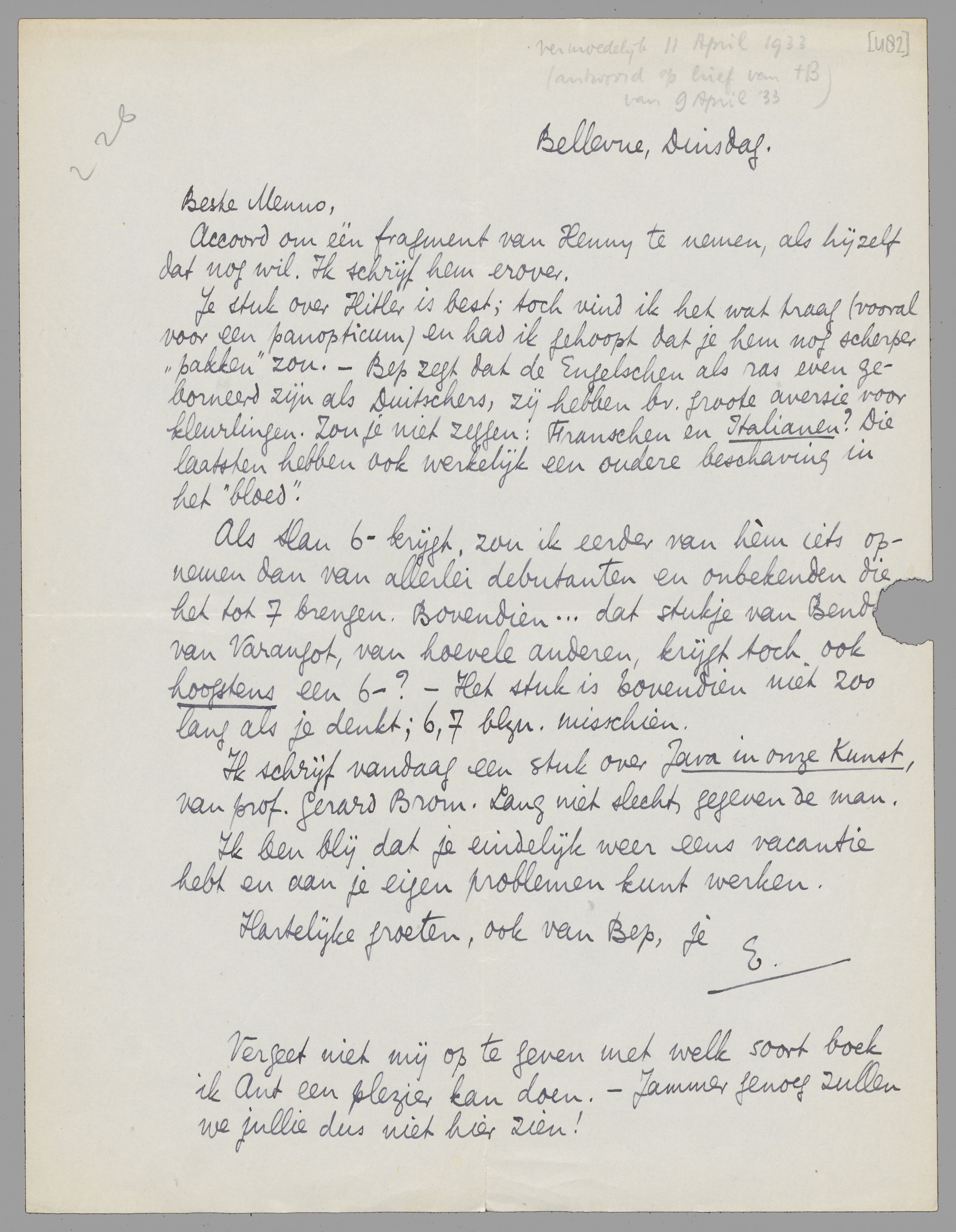 Je stuk over Hitler is best; toch vind ik het wat traag (vooral voor een panopticum) en had ik gehoopt dat je hem nog scherper ‘pakken’ zou. - Bep zegt dat de Engelschen als ras even geborneerd zijn als Duitschers, zij hebben bv. groote aversie voor kleurlingen. Zou je niet zeggen: Franschen en Italianen? Die laatsten hebben ook werkelijk een oudere beschaving in het ‘bloed’.