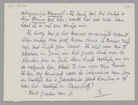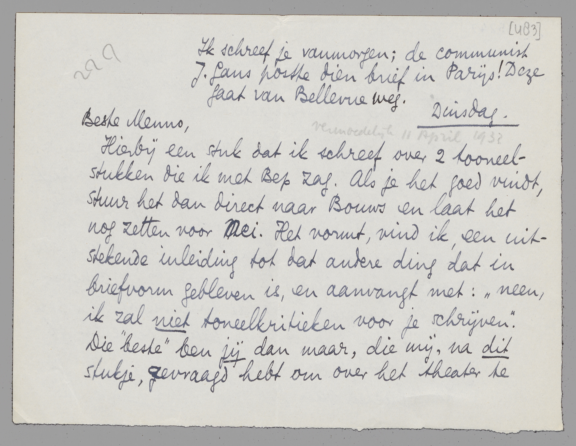 Hierbij een stuk dat ik schreef over 2 toneelstukken die ik met Bep zag. Als je het goed vindt, stuur het dan direct naar Bouws en laat het nog zetten voor Mei. Het vormt, vind ik, een uitstekende inleiding tot dat andere ding dat in briefvorm gebleven is, en aanvangt met: ‘neen, ik zal niet toneelkritieken voor je schrijven’. Die ‘beste’ ben jij dan maar, die mij, na dit stukje, gevraagd hebt om over het theater te schrijven (in Forum)! - Ik denk dat dit stukje 4 blzn. Forum zal zijn; wordt het iets meer, dan haal ik er wel een stukje uit.