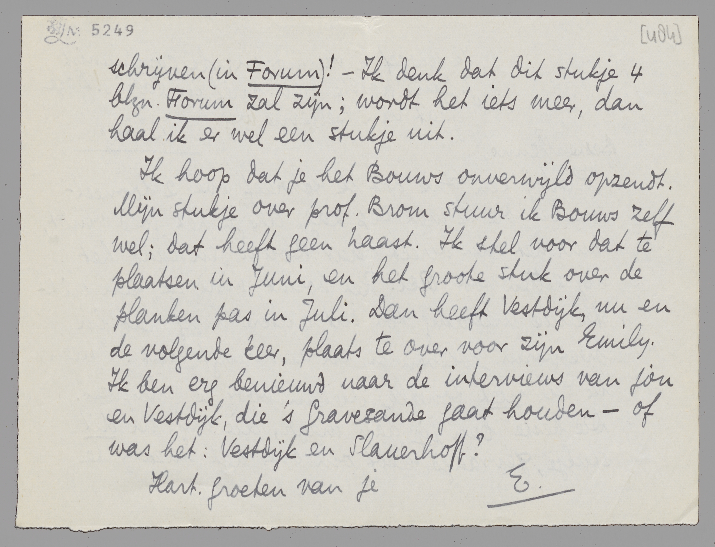 Ik hoop dat je het Bouws onverwijld opzendt. Mijn stukje over Prof. Brom stuur ik Bouws zelf wel; dat heeft geen haast. Ik stel voor dat te plaatsen in Juni, en het groote stuk over de planken pas in Juli. Dan heeft Vestdijk, nu en de volgende keer, plaats te over voor zijn Emily. Ik ben erg benieuwd naar de interviews van jou en Vestdijk, die 's Gravesande gaat houden - of was het: Vestdijk en Slauerhoff?