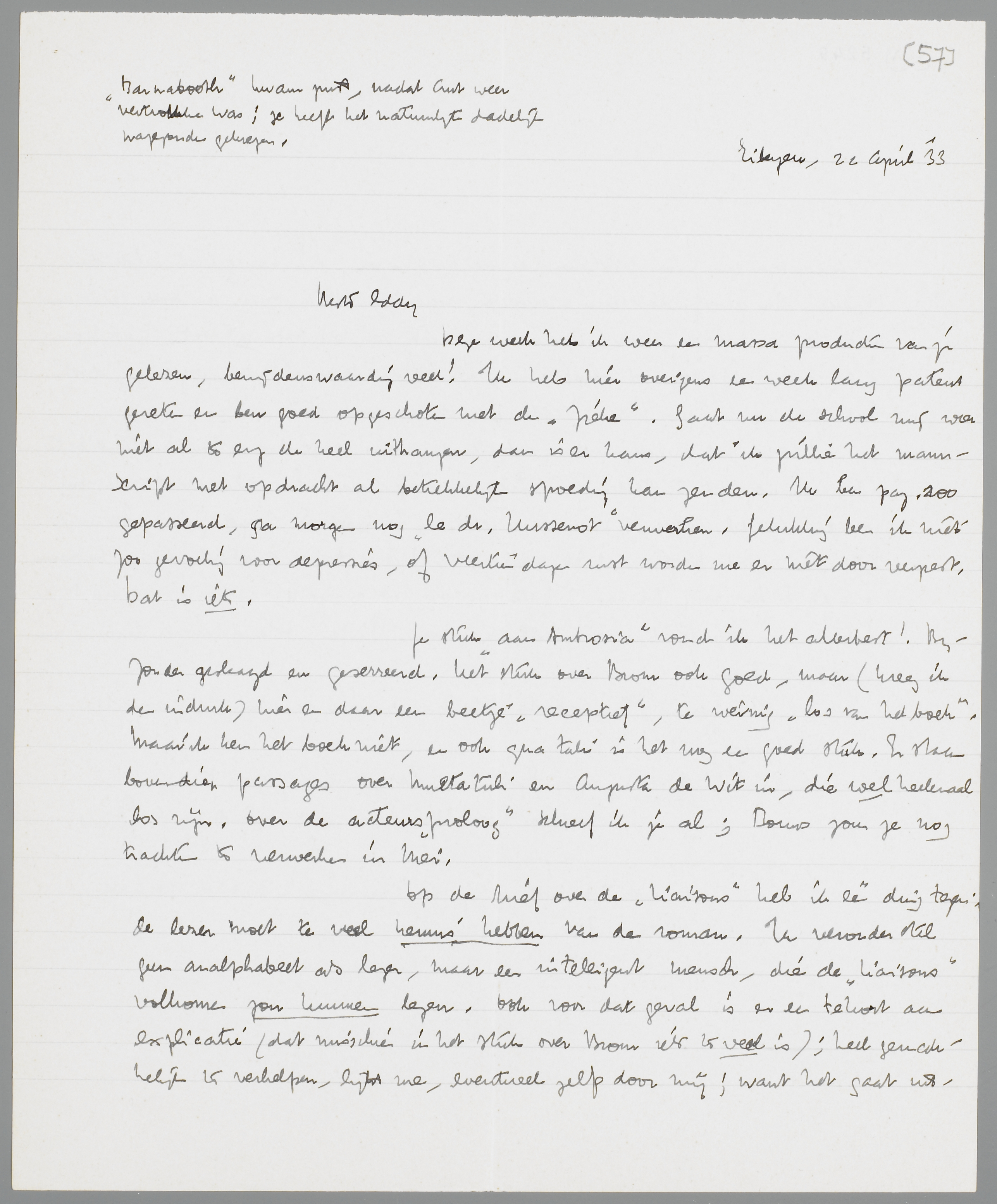 Deze week heb ik weer een massa producten van je gelezen, benijdenswaardig veel! Ik heb hier overigens een week lang patent gezeten en ben goed opgeschoten met den Zieke. Gaat nu de school mij weer niet al te erg de keel uithangen, dan is er kans, dat ik jullie het manuscript met opdracht al betrekkelijk spoedig kan zenden. Ik ben pag. 200 gepasseerd, ga morgen nog ‘le dr. Hussenot’ verwerken. Gelukkig ben ik niet zoo gevoelig voor depressies of veertien dagen rust worden me er niet door verpest. Dat is iets.