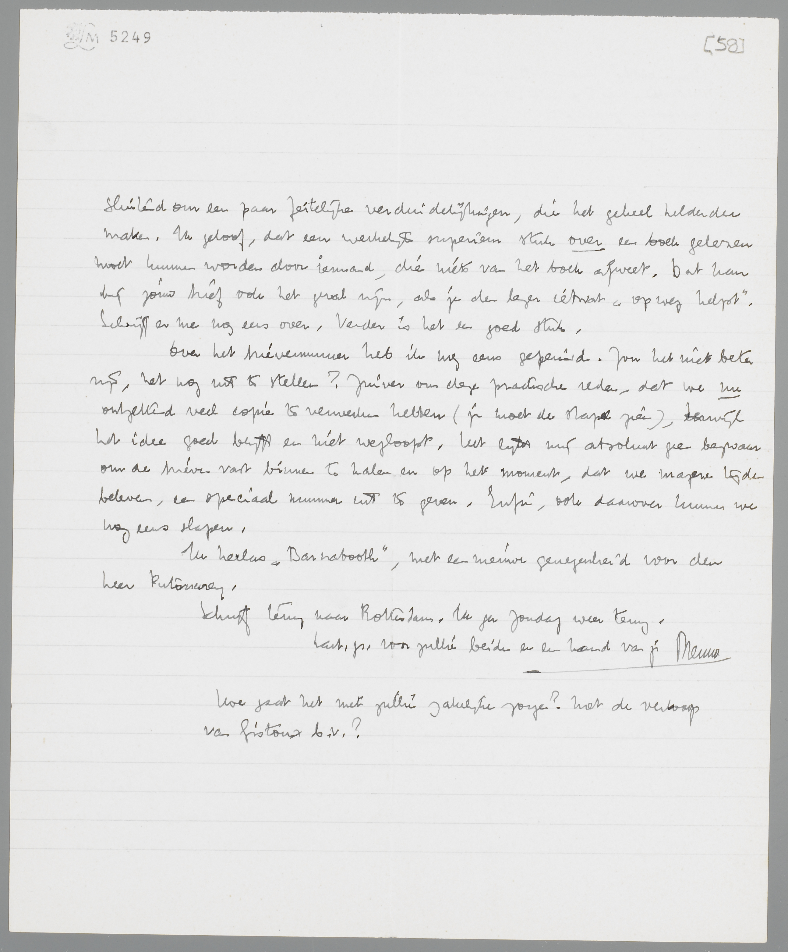 Op de brief over de Liaisons heb ik één ding tegen; de lezer moet te veel kennis hebben van de roman. Ik veronderstel geen analphabeet als lezer, maar een intelligent mensch, die de Liaisons volkomen zou kunnen lezen. Ook voor dat geval is er een tekort aan explicatie (dat misschien in het stuk over Brom iets te veel is); heel gemakkelijk te verhelpen, lijkt me, eventueel zelfs door mij; want het gaat uitsluitend om een paar feitelijke verduidelijkingen, die het geheel helderder maken. Ik geloof, dat een werkelijk superieur stuk over een boek gelezen moet kunnen worden door iemand, die niets van het boek afweet. Dat kan bij jouw brief ook het geval zijn, als je den lezer ietwat ‘opweg helpt’. Schrijf er me nog eens over. Verder is het een goed stuk.