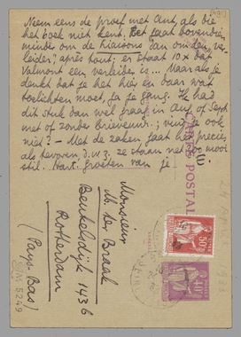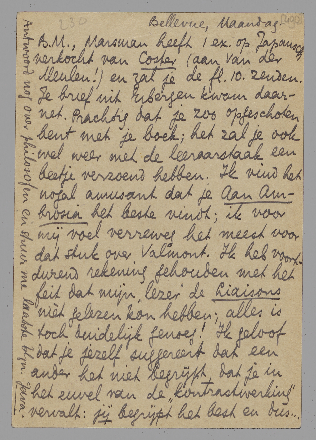 Marsman heeft 1 ex. op Japansch verkocht van Coster (aan Van der Meulen!) en zal je de fl. 10. zenden. Je brief uit Eibergen kwam daarnet. Prachtig dat je zoo opgeschoten bent met je boek; het zal je ook wel weer met de leeraarstaak een beetje verzoend hebben. Ik vind het nogal amusant dat je Aan Ambrosia het beste vindt; ik voor mij voel verreweg het meest voor dat stuk over Valmont. Ik heb voortdurend rekening gehouden met het feit dat mijn ‘lezer’ de Liaisons nièt gelezen kon hebben; alles is toch duidelijk genoeg! Ik geloof dat je jezelf suggereert dat een ander het niet begrijpt, dat je in het euvel van de ‘kontrastwerking’ vervalt: jij begrijpt het best en dus... Neem eens de proef met Ant, als die het boek niet kent. Het gaat bovendien minder om de Liaisons dan om den ‘verleider’, après tout; er staat 10 × dat Valmont een verleider is... Maar als je denkt dat je het hier en daar wat toelichten moet, ga je gang. Ik had dit stuk dan wel graag in Aug. of Sept. met of zonder brievennr.; vind je ook niet? - Met de zaken gaat het precies als tevoren, d.w.z. ze staan net zoo mooi stil. Hart. groeten van je