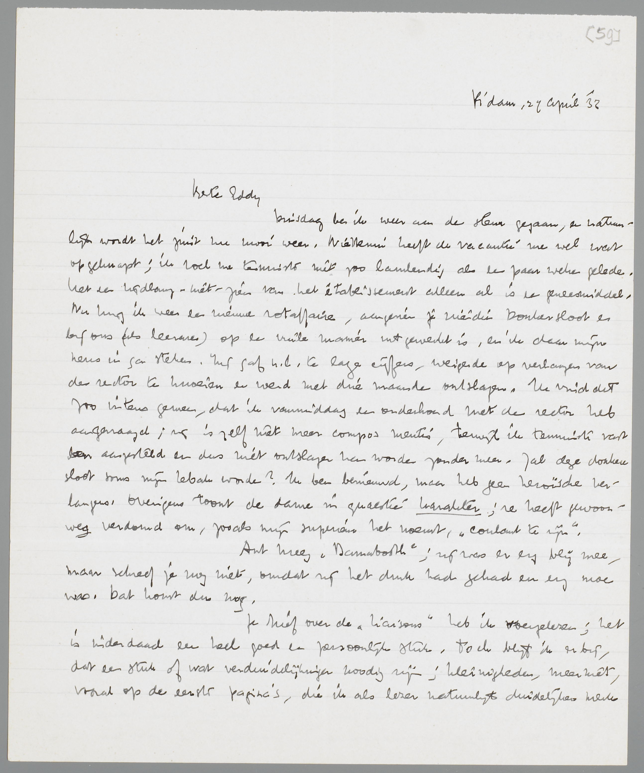 Je brief over de Liaisons heb ik overgelezen; het is inderdaad een heel goed en persoonlijk stuk. Toch blijf ik erbij, dat een stuk of wat verduidelijkingen noodig zijn; kleinigheden, meer niet, vooral op de eerste pagina's, die ik als lezer natuurlijk duidelijker merk dan jij. Als je er niets op tegen hebt, zal ik die paar dingen er met potlood bijschrijven en je dan het stuk nog even terugzenden. Maar schrijf me eerst even, of je goedvindt, dat ik het doe; ik klad niet graag in andermans manuscripten.