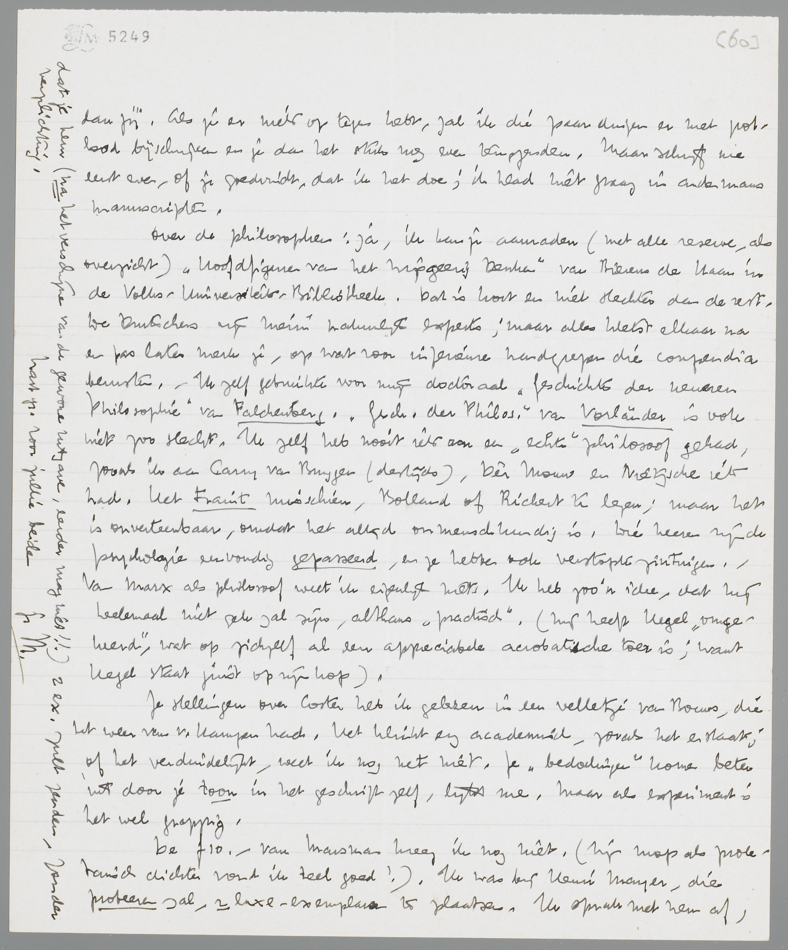 Over de philosophen: ja, ik kan je aanraden (met alle reserve, als overzicht) Hoofdfiguren van het Wijsgeerig Denken van Bierens de Haan in de Volks-Universiteits-Bibliotheek. Dat is kort en niet slechter dan de rest. De Duitschers zijn hierin natuurlijk experts; maar alles kletst elkaar na en pas later merk je, op wat voor inferieure handgrepen die compendia berusten. - Ik zelf gebruikte voor mijn doctoraal Geschichte der neueren Philosophie van Falckenberg. Gesch. der Philos. van Vorlander is ook niet zoo slecht. Ik zelf heb nooit iets aan een ‘echte’ philosoof gehad, zooals ik aan Carry van Bruggen (destijds), Dèr Mouw en Nietzsche iets had. Het traint misschien, Bolland of Richert te lezen; maar het is onverteerbaar, omdat het altijd onmenschkundig is. Die heeren zijn de psychologie eenvoudig gepasseerd, en ze hebben ook verstopte zintuigen. - Van Marx als philosoof weet ik eigenlijk niets. Ik heb zoo'n idee, dat hij heelemaal niet gek zal zijn, althans ‘practisch’. (Hij heeft Hegel ‘omgekeerd’, wat op zichzelf al een appreciabele acrobatische toer is; want Hegel staat juist op zijn kop).