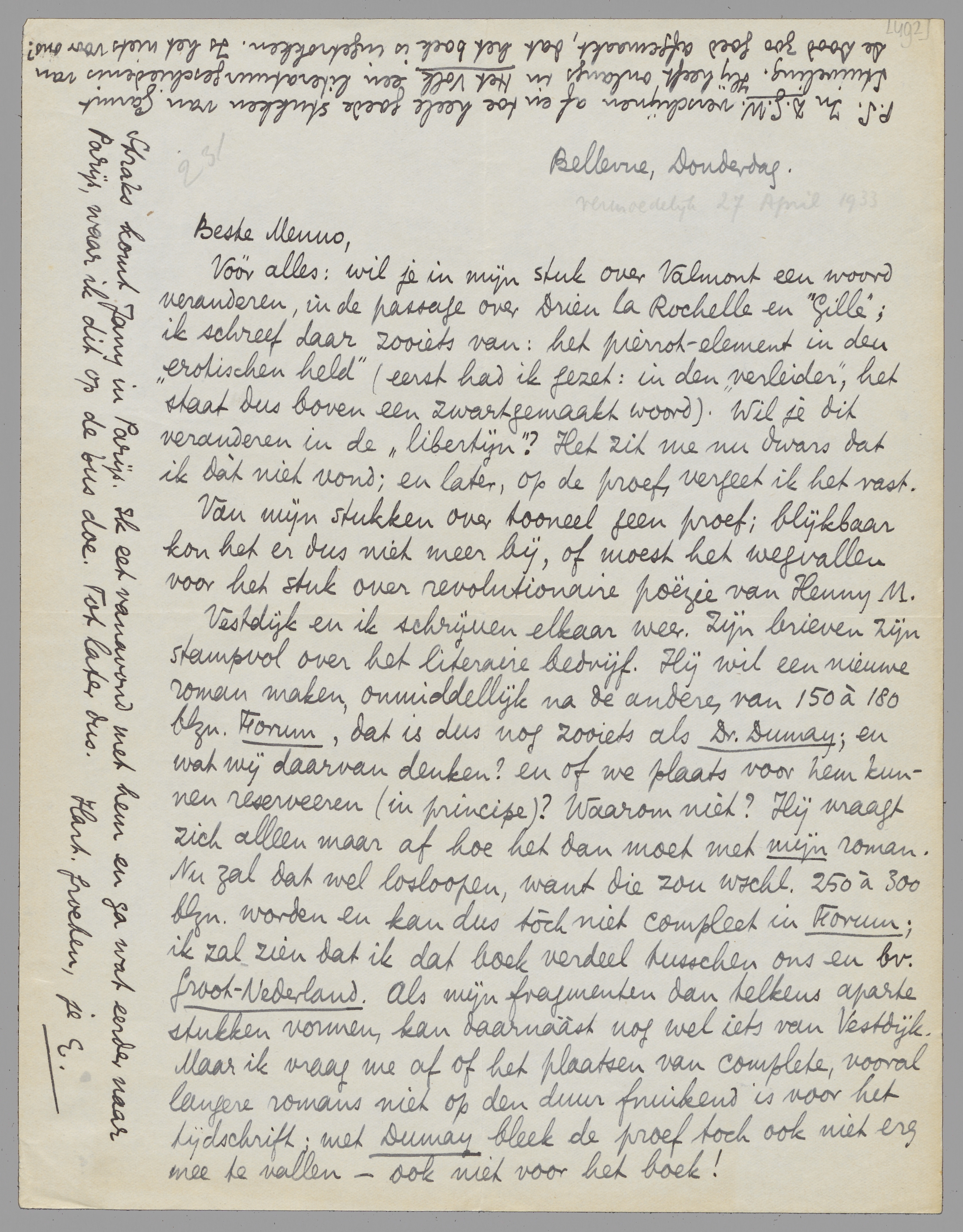 Vóór alles: wil je in mijn stuk over Valmont een woord veranderen, in de passage over Drieu la Rochelle en ‘Gille’; ik schreef daar zooiets van: het pierrot-element in den ‘erotischen held’ (eerst had ik gezet: in den ‘verleider’, het staat dus boven een zwartgemaakt woord). Wil je dit veranderen in de ‘libertijn’? Het zit me nu dwars dat ik dàt niet vond; en later, op de proef, vergeet ik het vast.