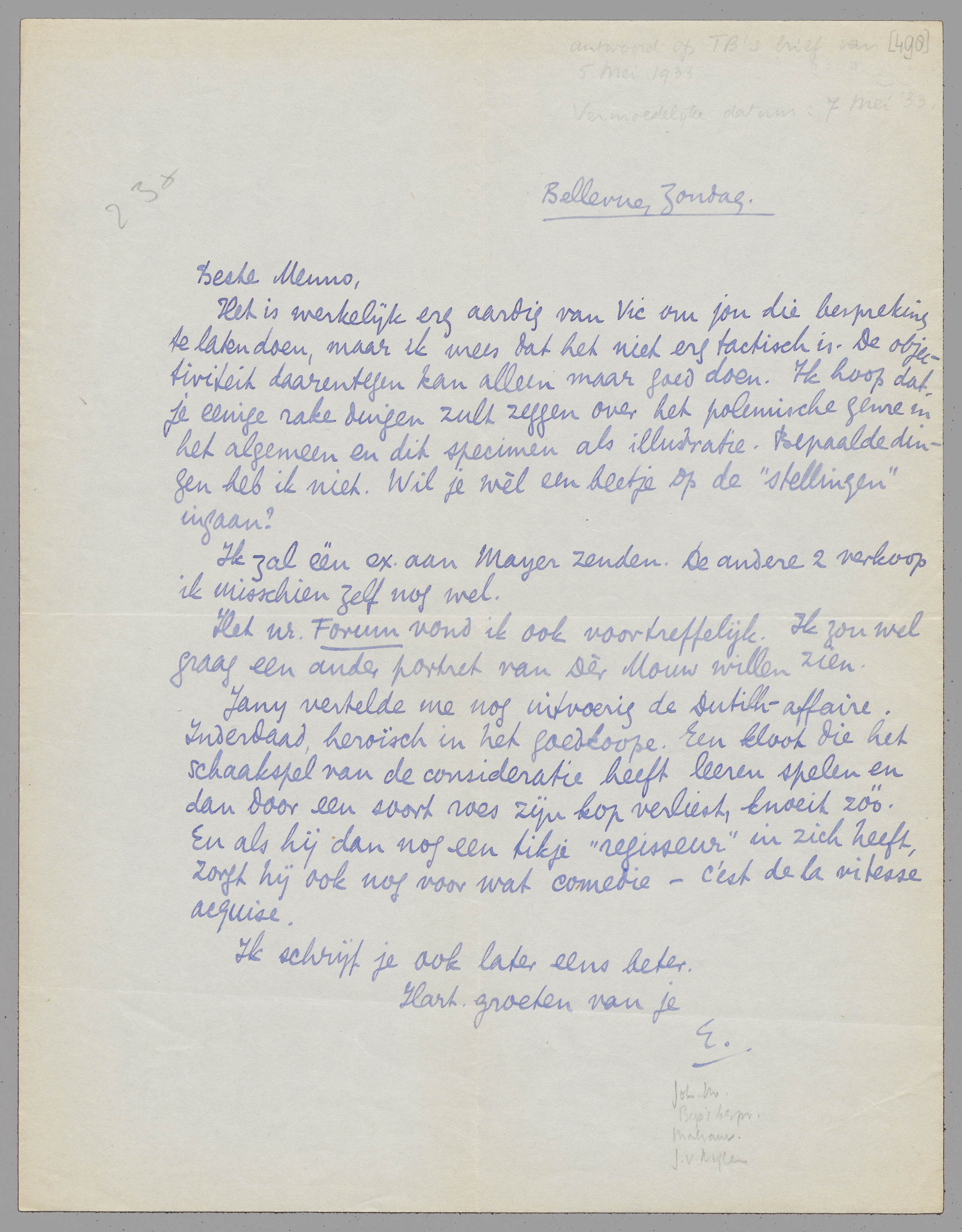 Het is werkelijk erg aardig van Vic om jou die bespreking te laten doen, maar ik vrees dat het niet erg tactisch is. De objectiviteit daarentegen kan alleen maar goed doen. Ik hoop dat je eenige rake dingen zult zeggen over het polemische genre in het algemeen en dit specimen als illustratie. Bepaalde dingen heb ik niet. Wil je wèl een beetje op de ‘stellingen’ ingaan?