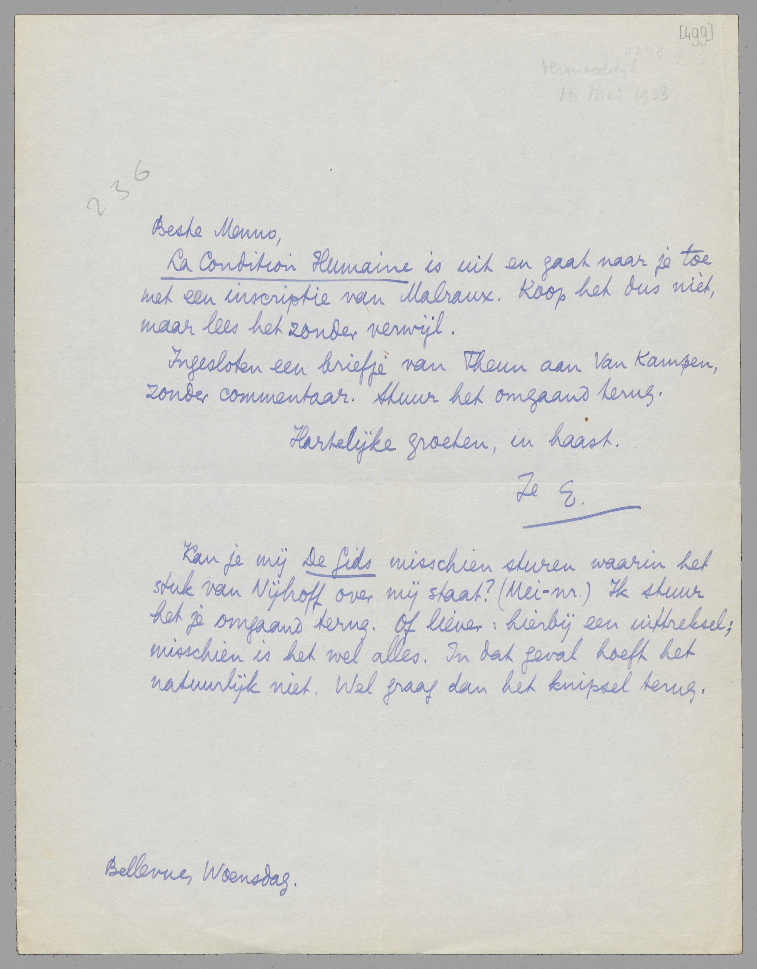 Kan je mij De Gids misschien sturen waarin het stuk van Nijhoff over mij staat? (Mei-nr.) Ik stuur het je omgaand terug. Of liever: hierbij een uittreksel; misschien is het wel alles. In dat geval hoeft het natuurlijk niet. Wel graag dan het knipsel terug.
